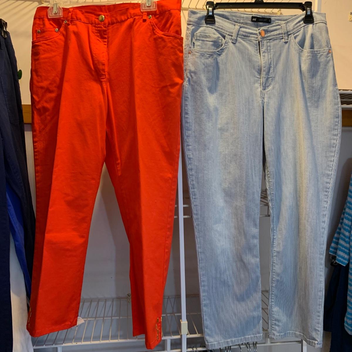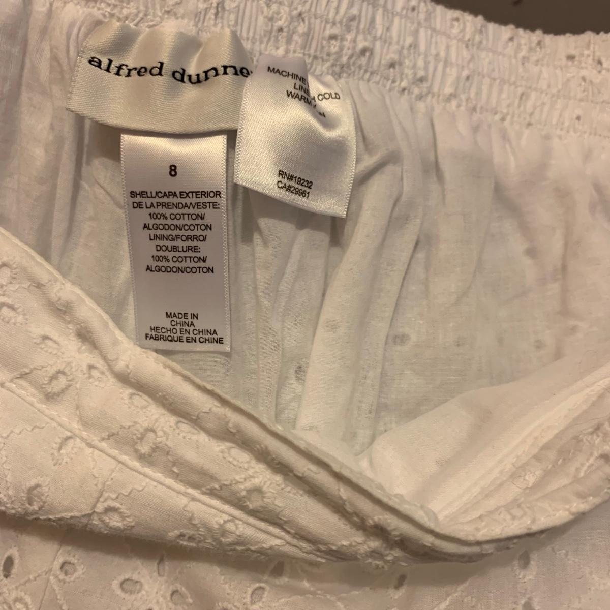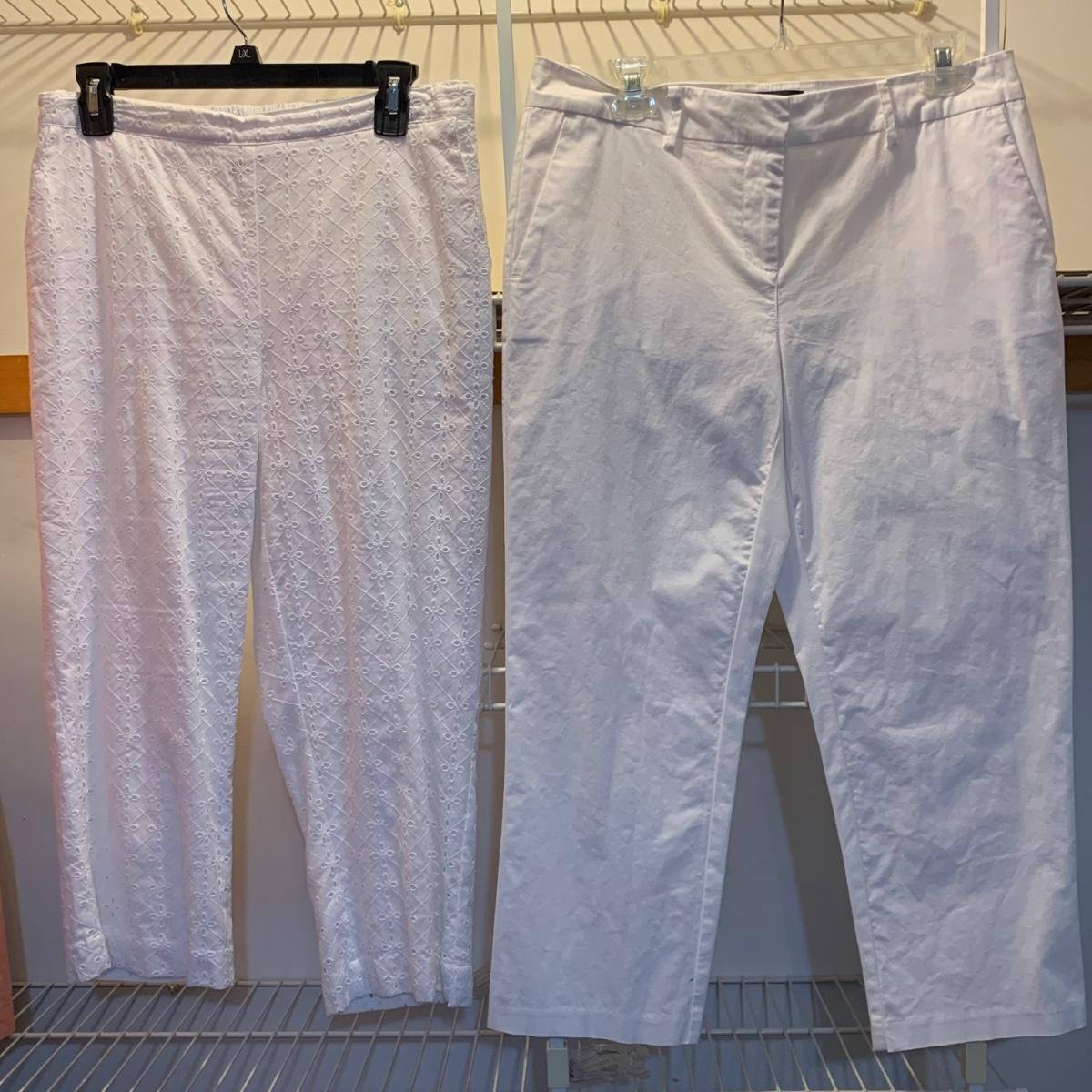 Twelve pairs of pants and five skirts, all size 8/10 or small. A handful of the items are brand new with their original tags still attached. Every item in this collection appears to be in very good condition, minus a small stain on the Alfred Dunner pants. Please see photos for sizes and brand names of each item.