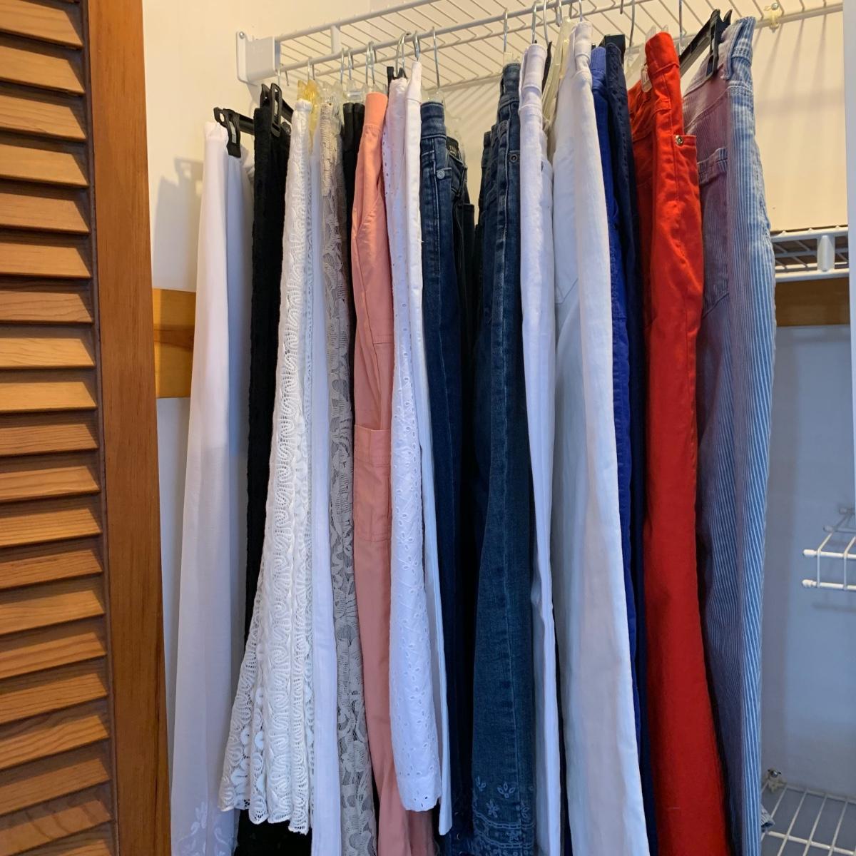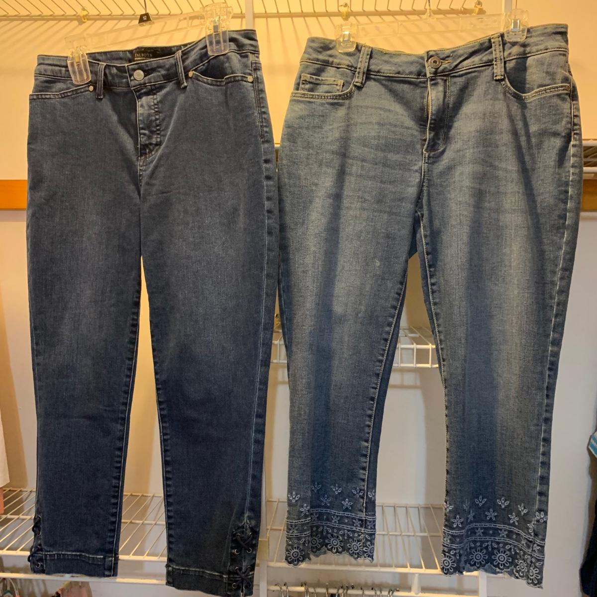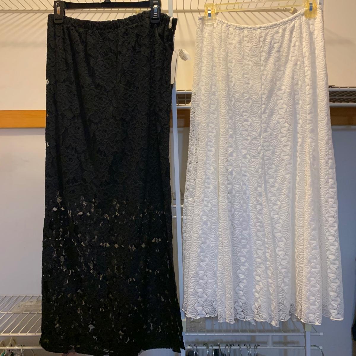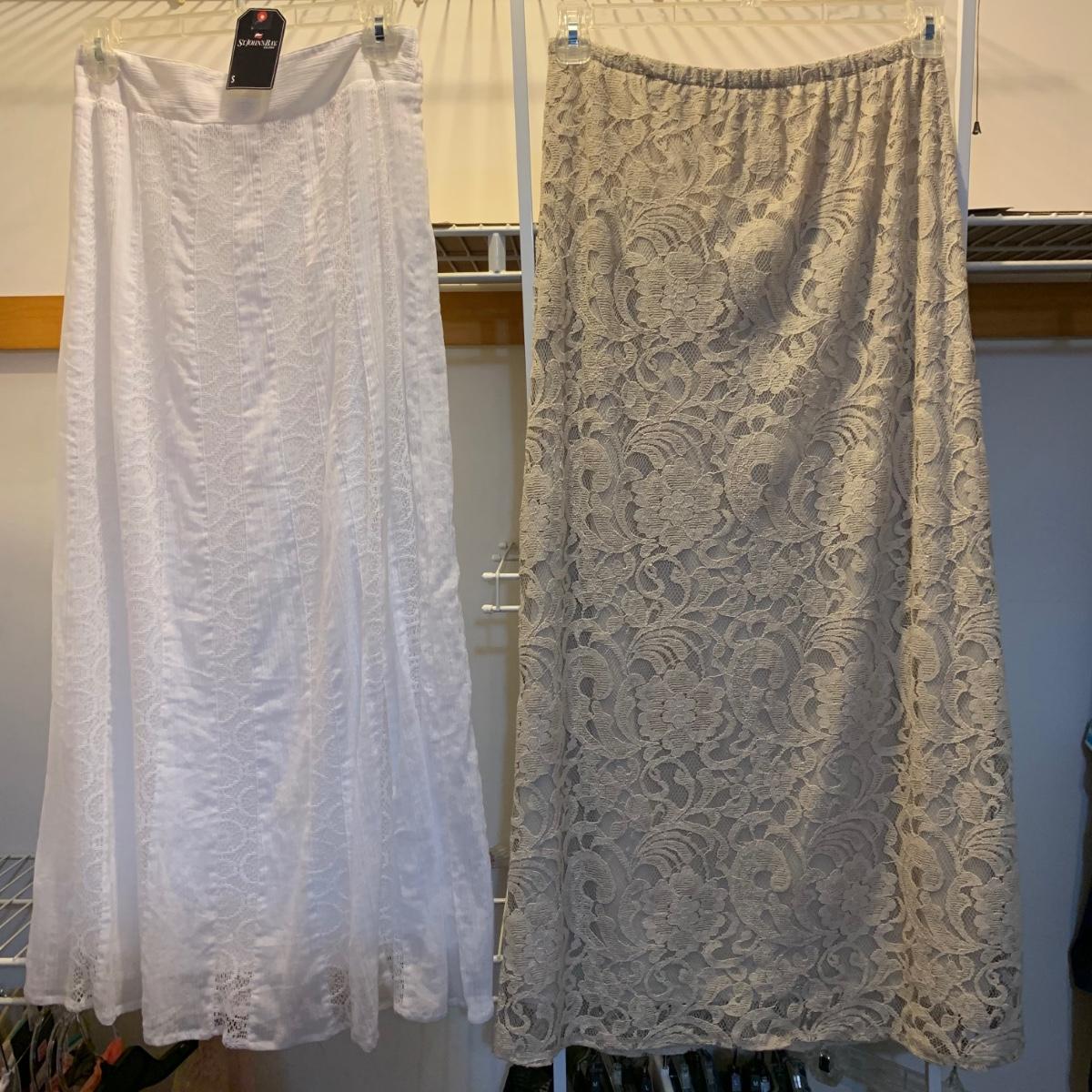 Twelve pairs of pants and five skirts, all size 8/10 or small. A handful of the items are brand new with their original tags still attached. Every item in this collection appears to be in very good condition, minus a small stain on the Alfred Dunner pants. Please see photos for sizes and brand names of each item.