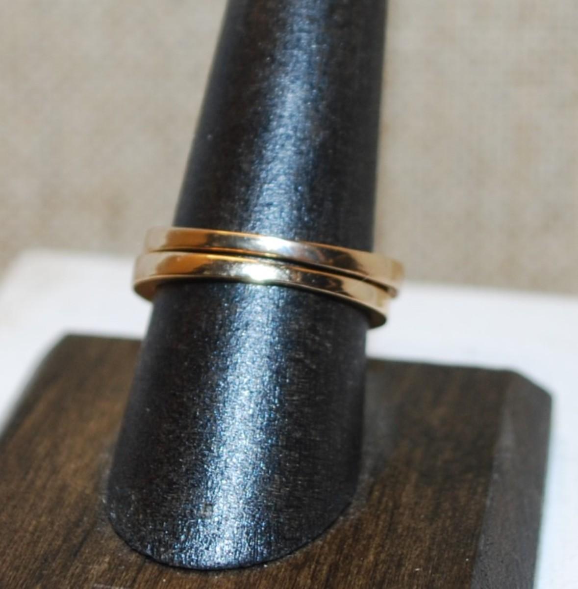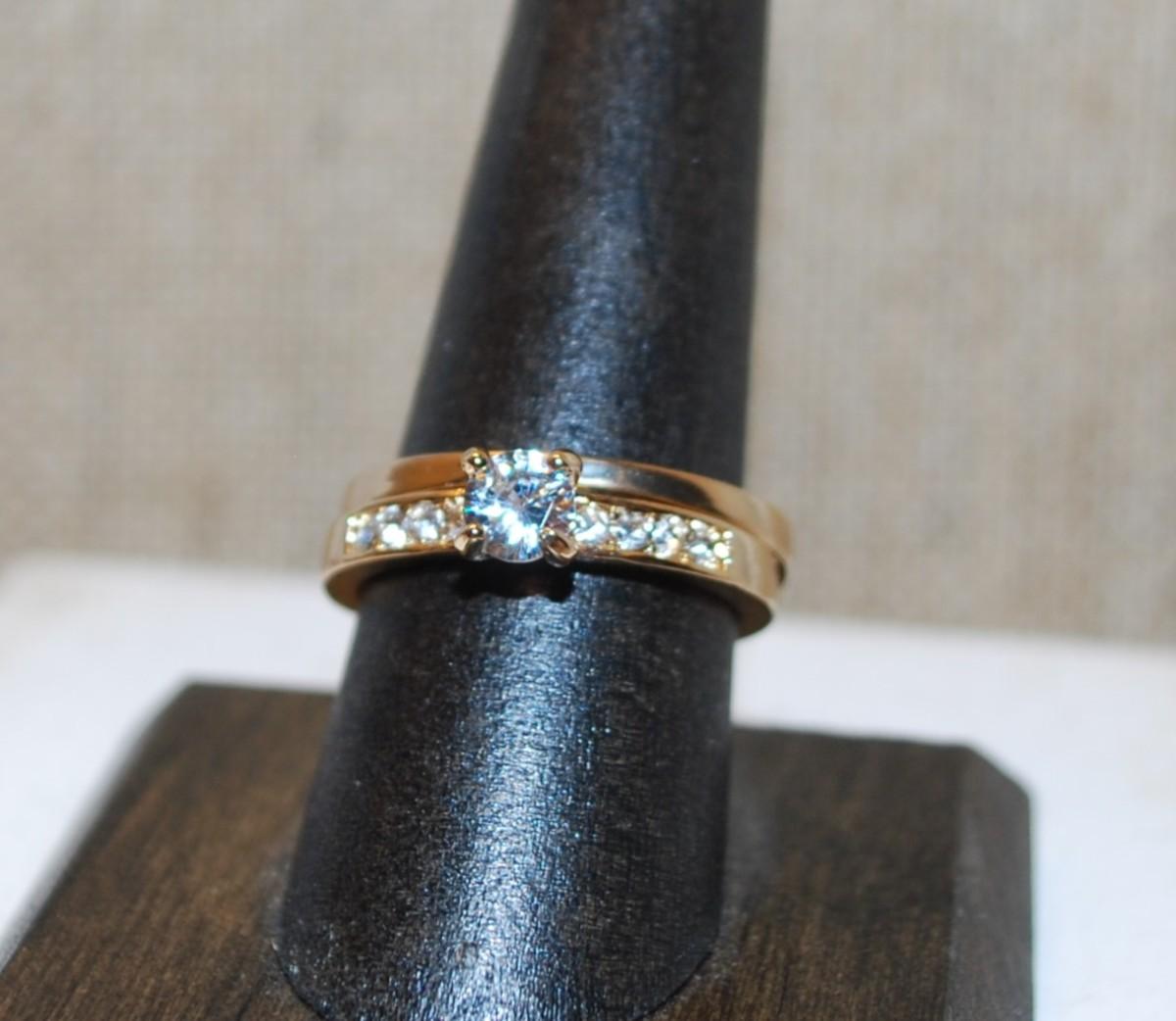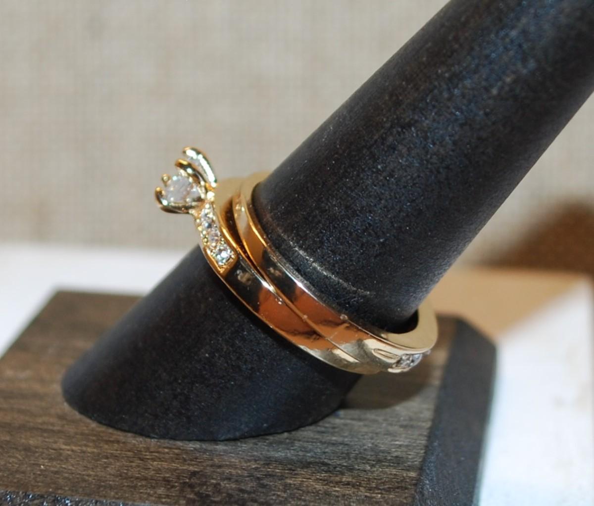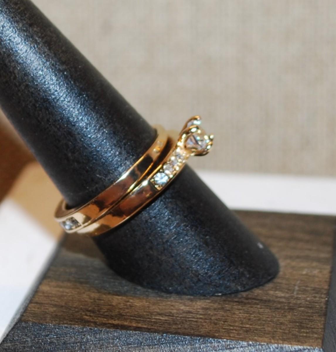 Size 8+8¼ 2 Gold Tone Ring Set with Round Single Stone & Accents on Both Rings--Stackable or Individual (5.2g)