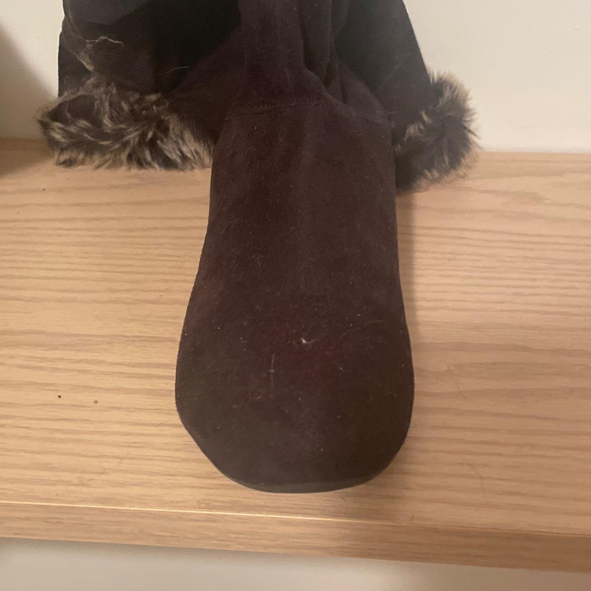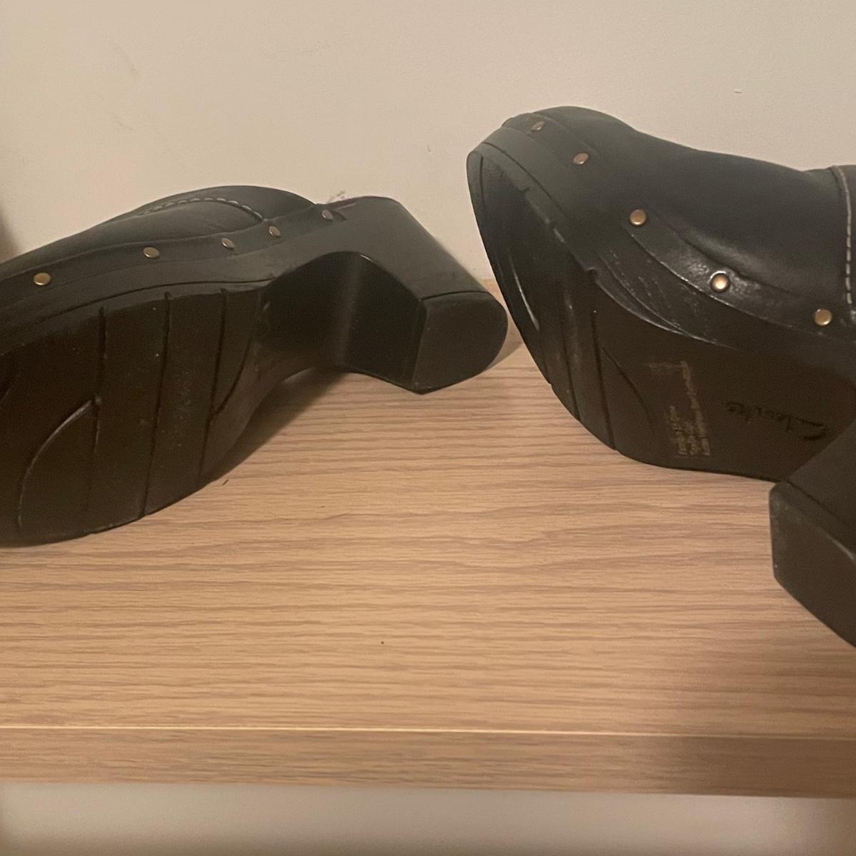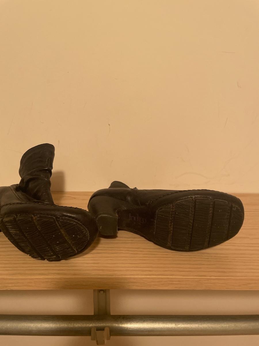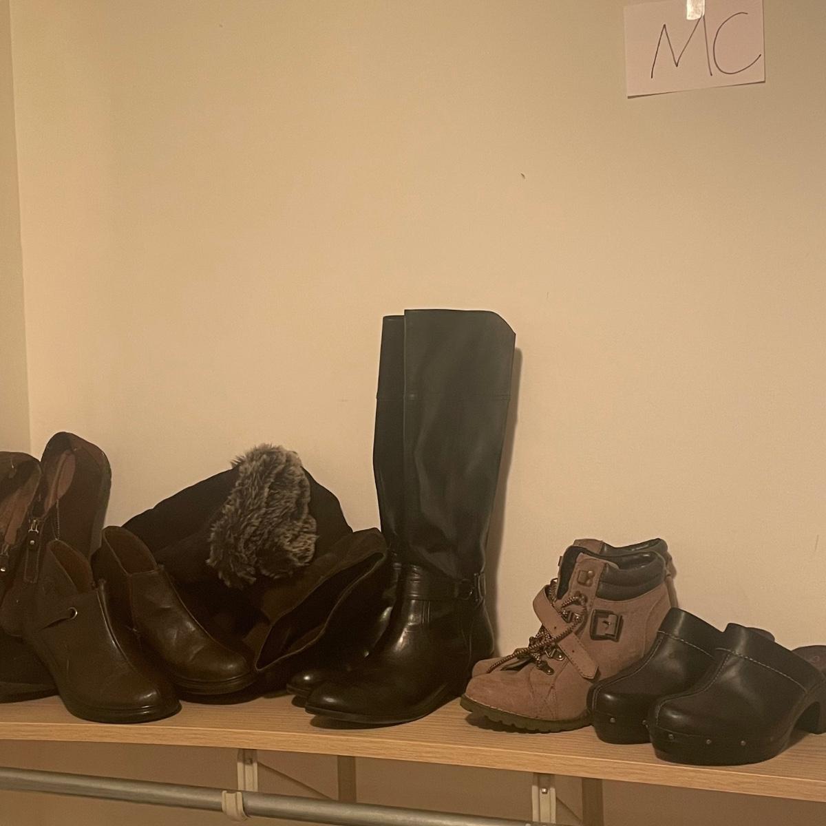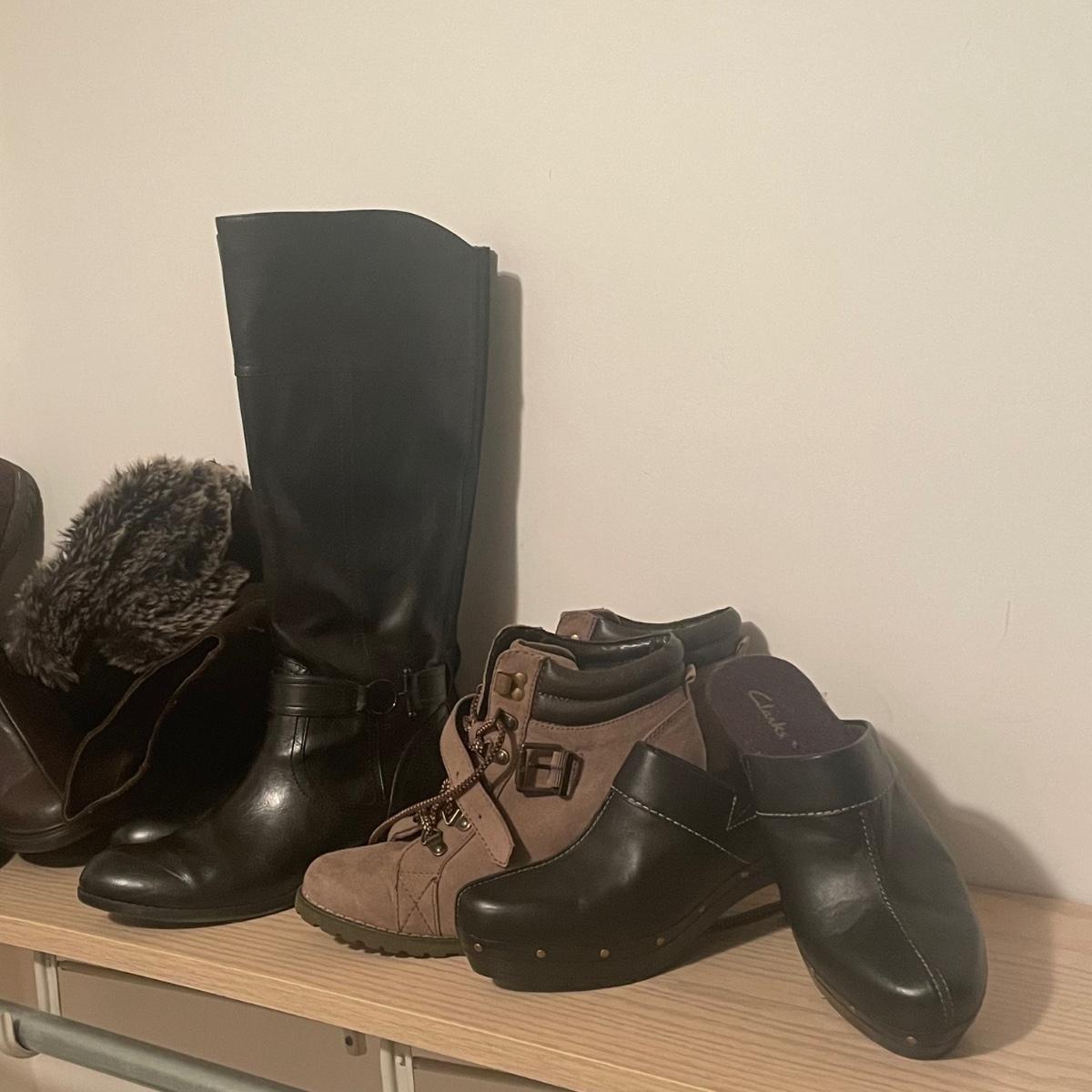 4 pairs of boots and 4 pairs of shoes (8 pairs total). Includes a pair of clog style Clarks shoes that look almost new. All pairs are in good condition. Sizes range from 8-9, with most being 8.5 (some pairs do not have sizes but appear to be 8/8.5.). The tallest boots are the black suede with a dark grey fur like lining and they are 19” tall.