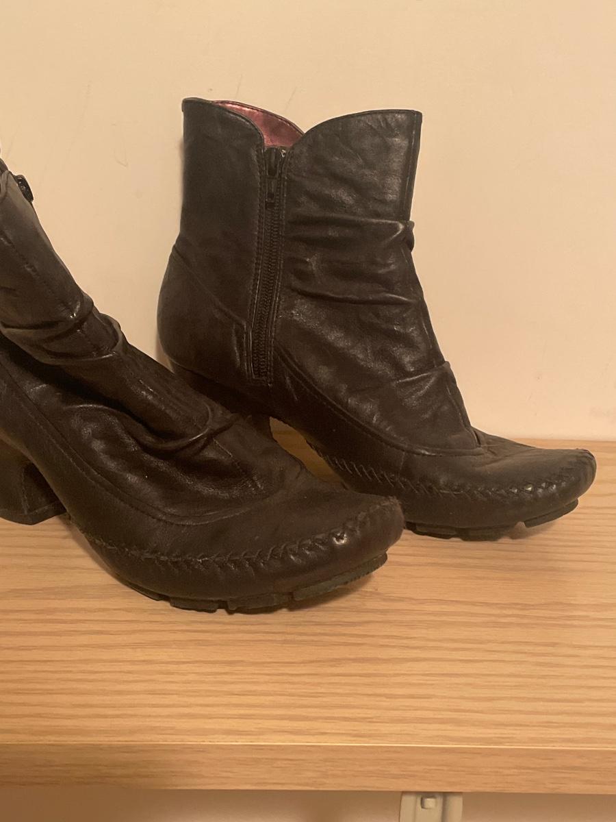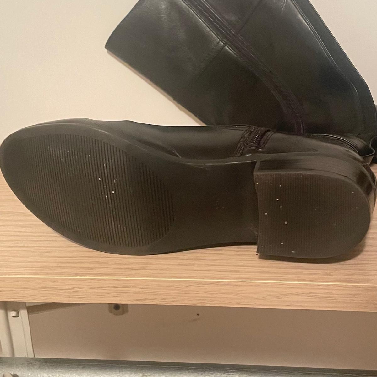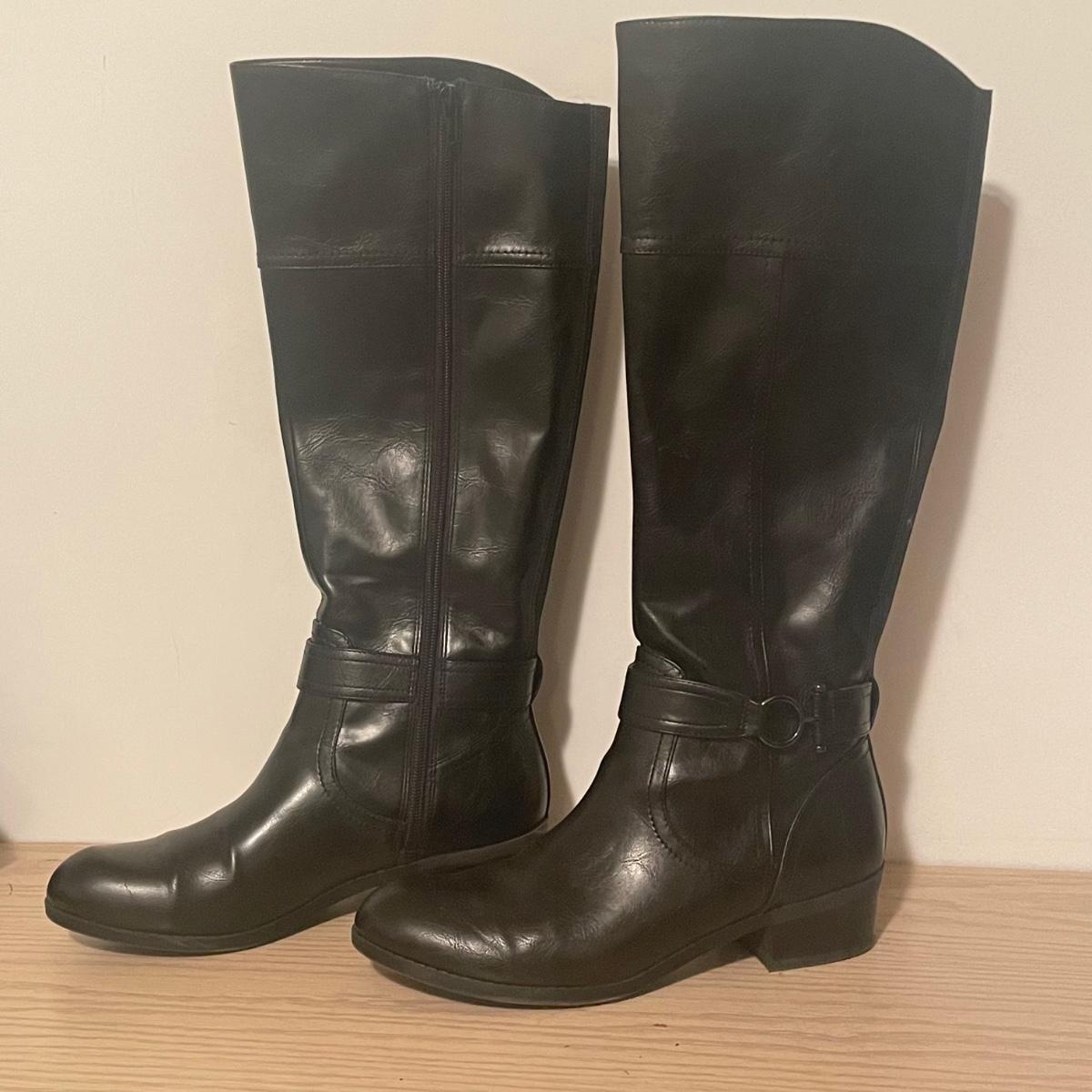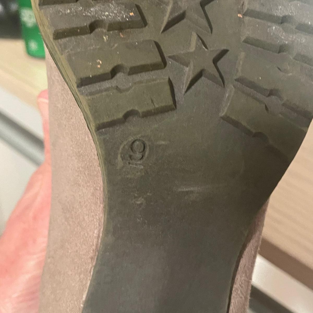 4 pairs of boots and 4 pairs of shoes (8 pairs total). Includes a pair of clog style Clarks shoes that look almost new. All pairs are in good condition. Sizes range from 8-9, with most being 8.5 (some pairs do not have sizes but appear to be 8/8.5.). The tallest boots are the black suede with a dark grey fur like lining and they are 19” tall.