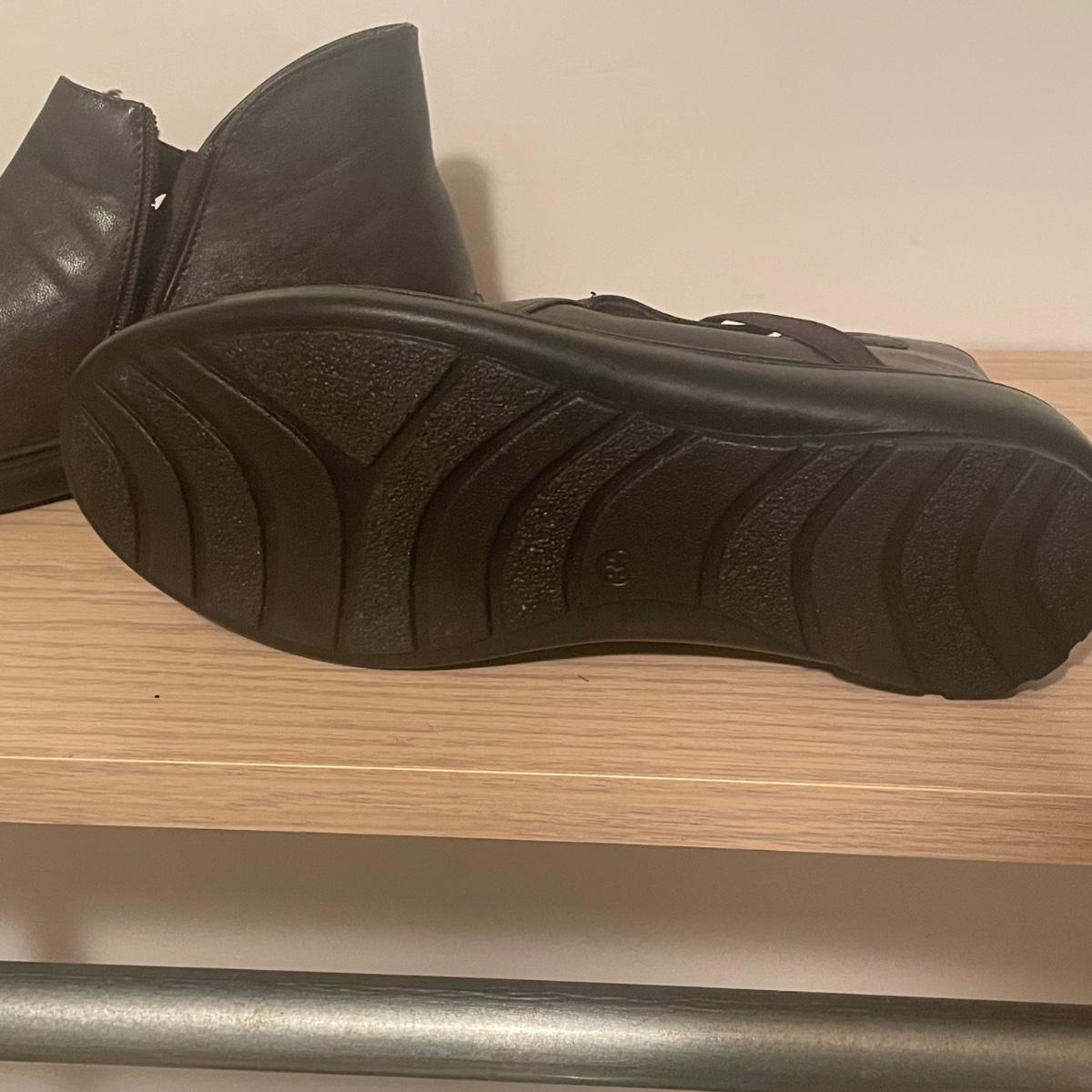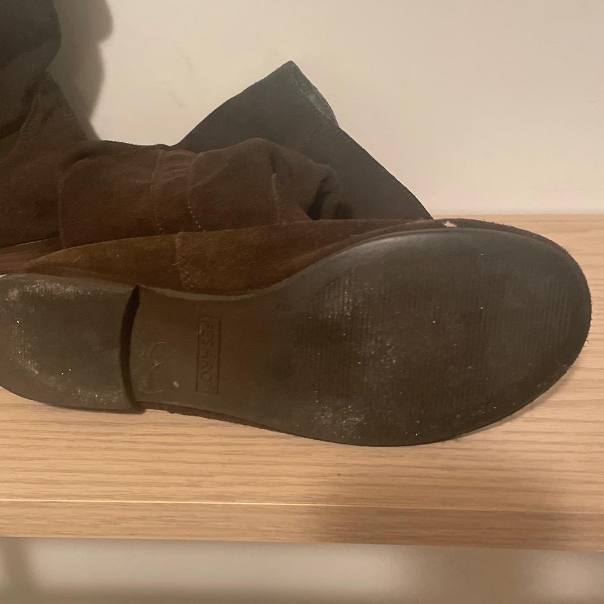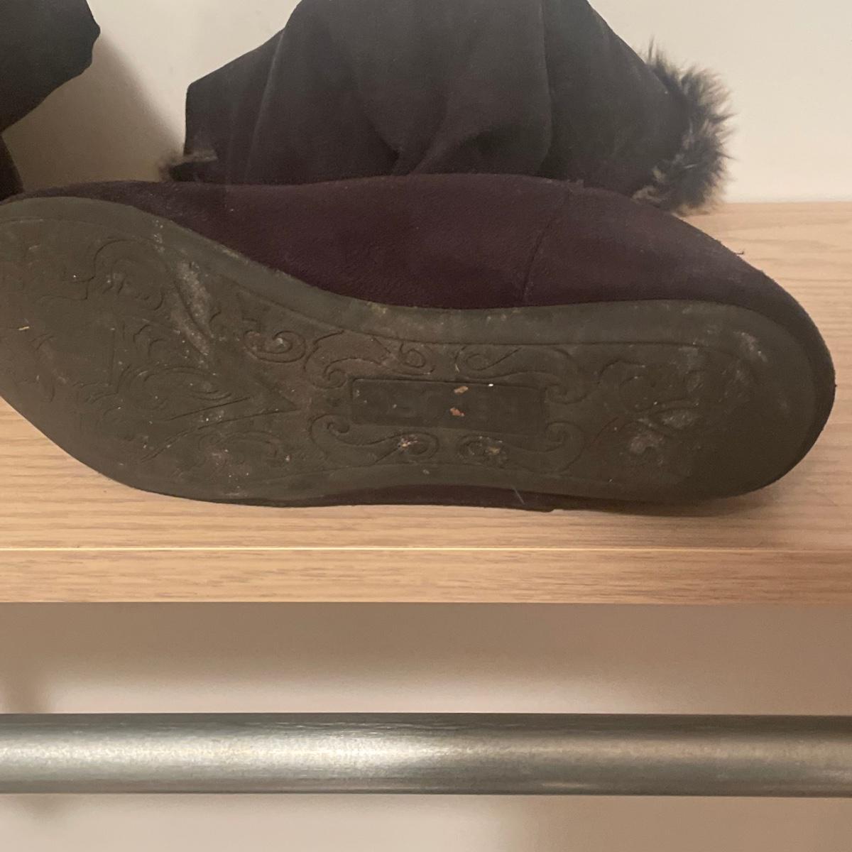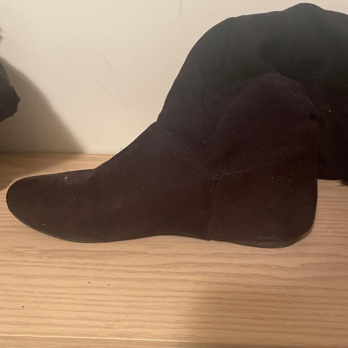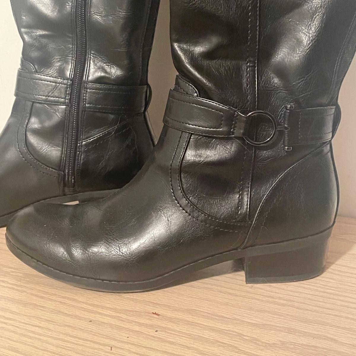 4 pairs of boots and 4 pairs of shoes (8 pairs total). Includes a pair of clog style Clarks shoes that look almost new. All pairs are in good condition. Sizes range from 8-9, with most being 8.5 (some pairs do not have sizes but appear to be 8/8.5.). The tallest boots are the black suede with a dark grey fur like lining and they are 19” tall.