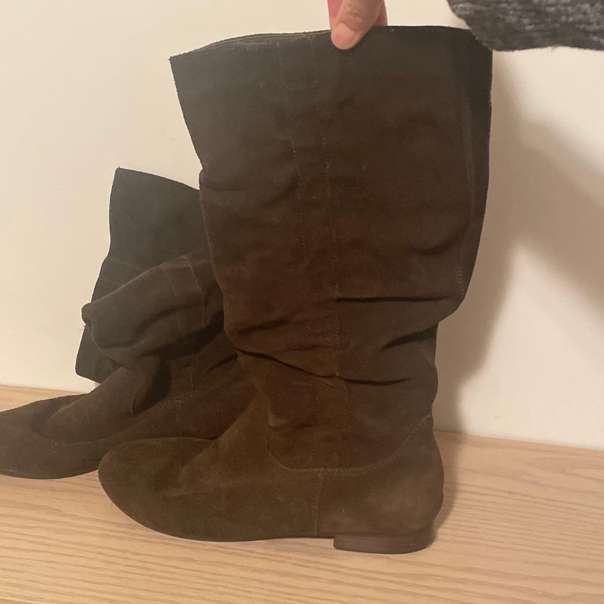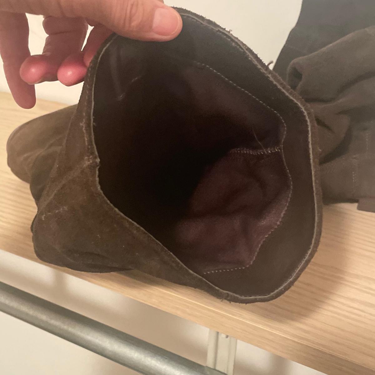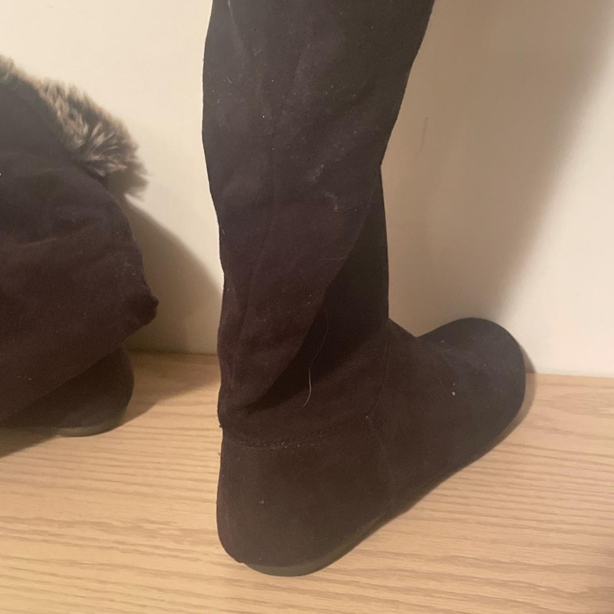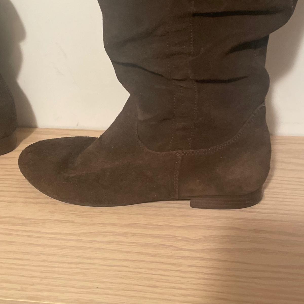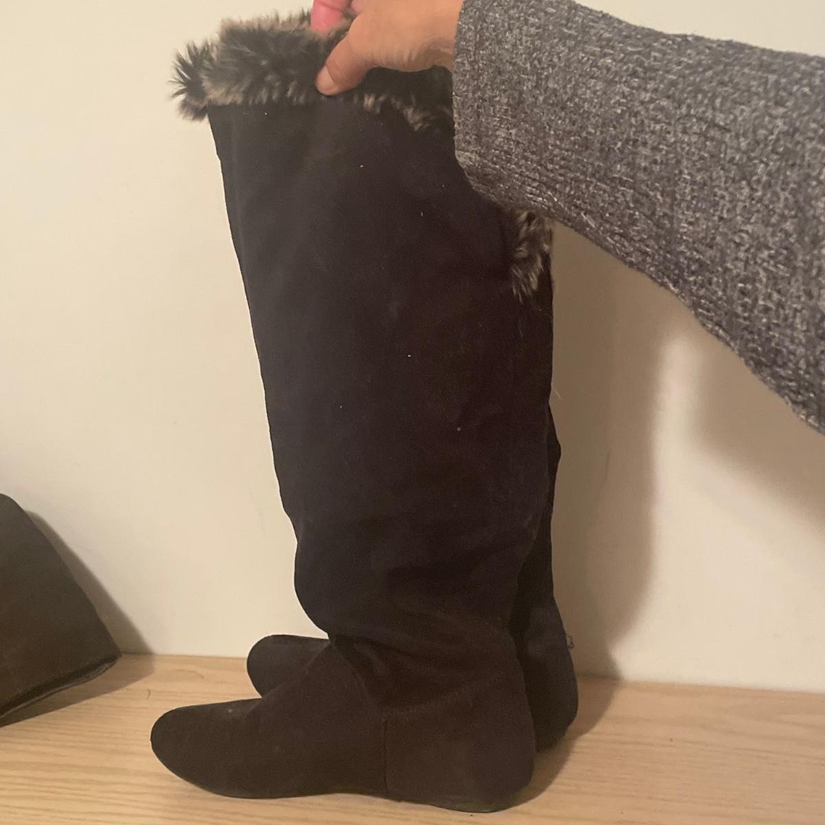 4 pairs of boots and 4 pairs of shoes (8 pairs total). Includes a pair of clog style Clarks shoes that look almost new. All pairs are in good condition. Sizes range from 8-9, with most being 8.5 (some pairs do not have sizes but appear to be 8/8.5.). The tallest boots are the black suede with a dark grey fur like lining and they are 19” tall.