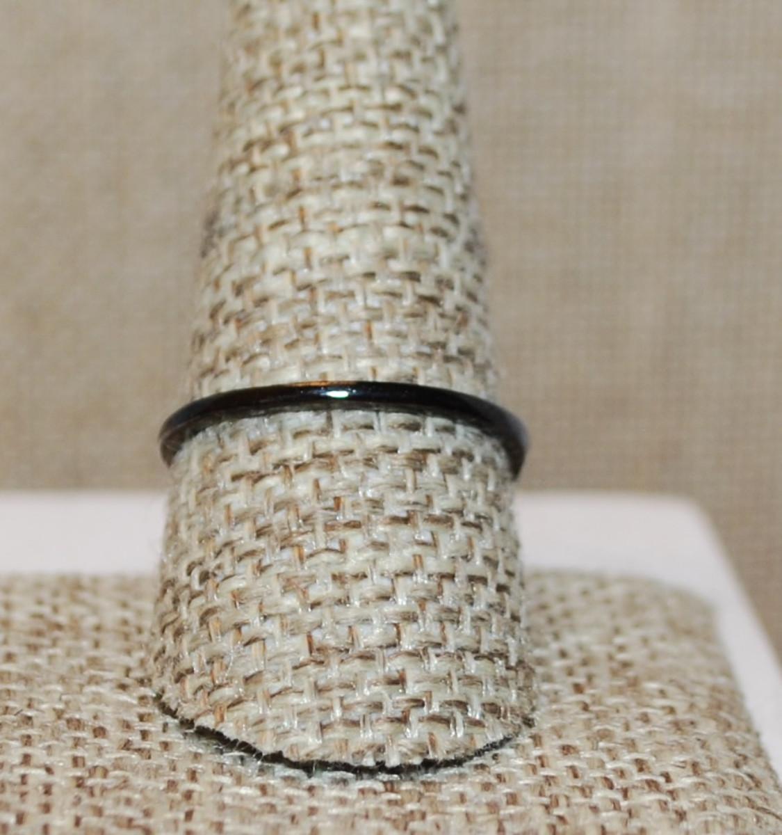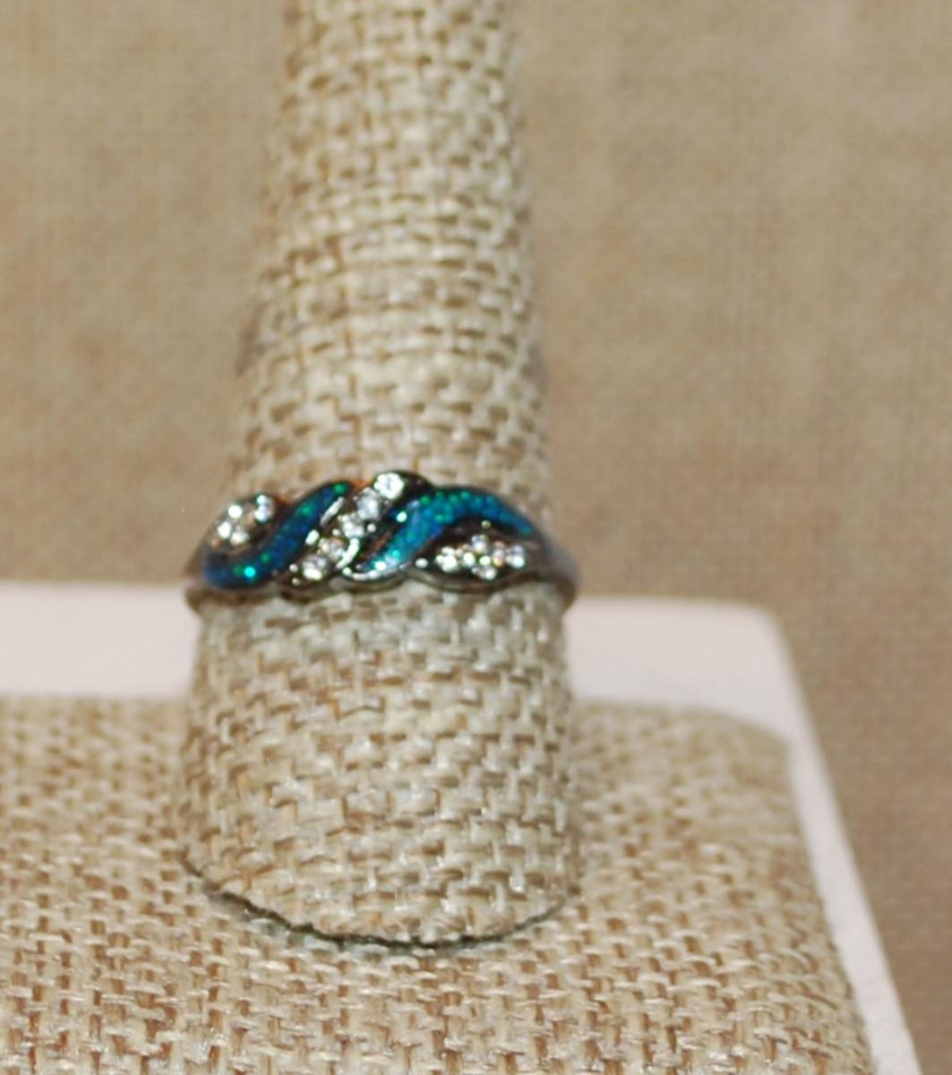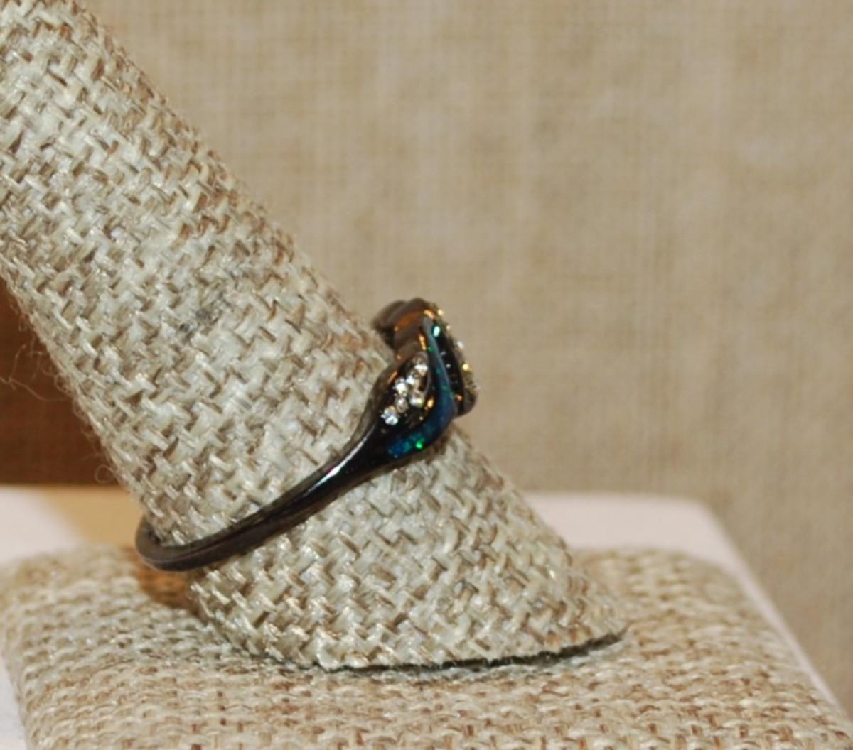 Size 9½ Black Banded Ring with Dark Aquamarine Swirls & Clear Stone Accents (2.7g)