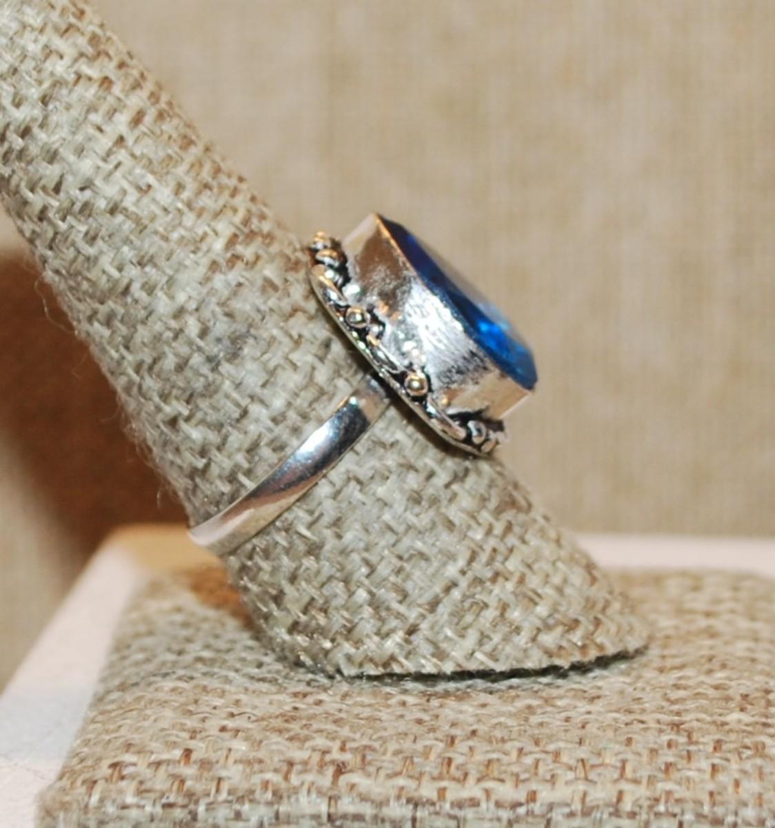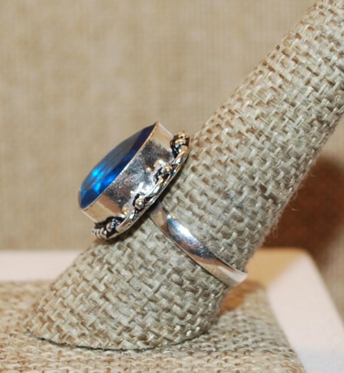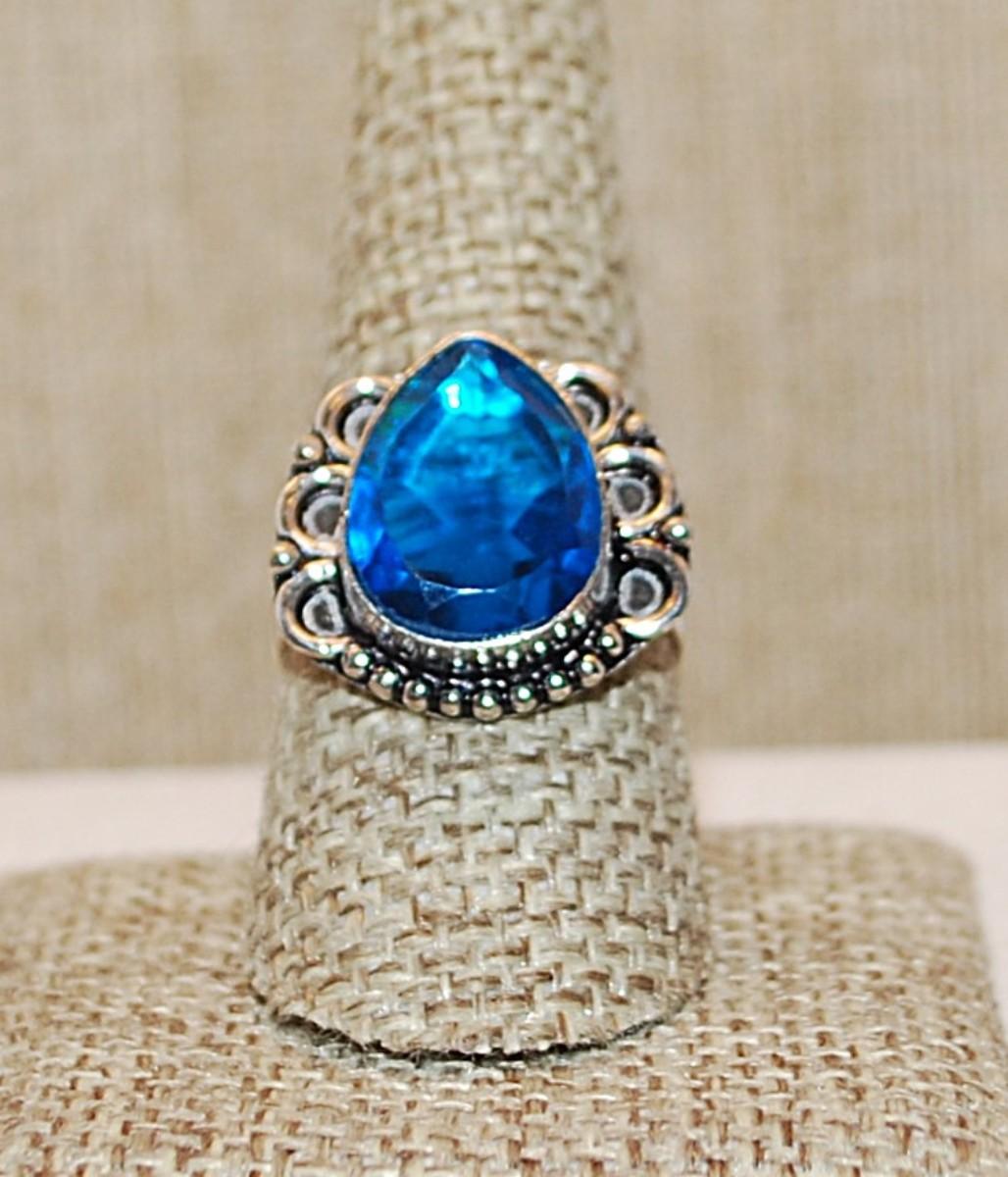Size 9½ BLUE Pear Shape Transparent Glass Rhinestone Ring with a 6 Loop Rim Setting on a Silver Tone Band (4.9g)