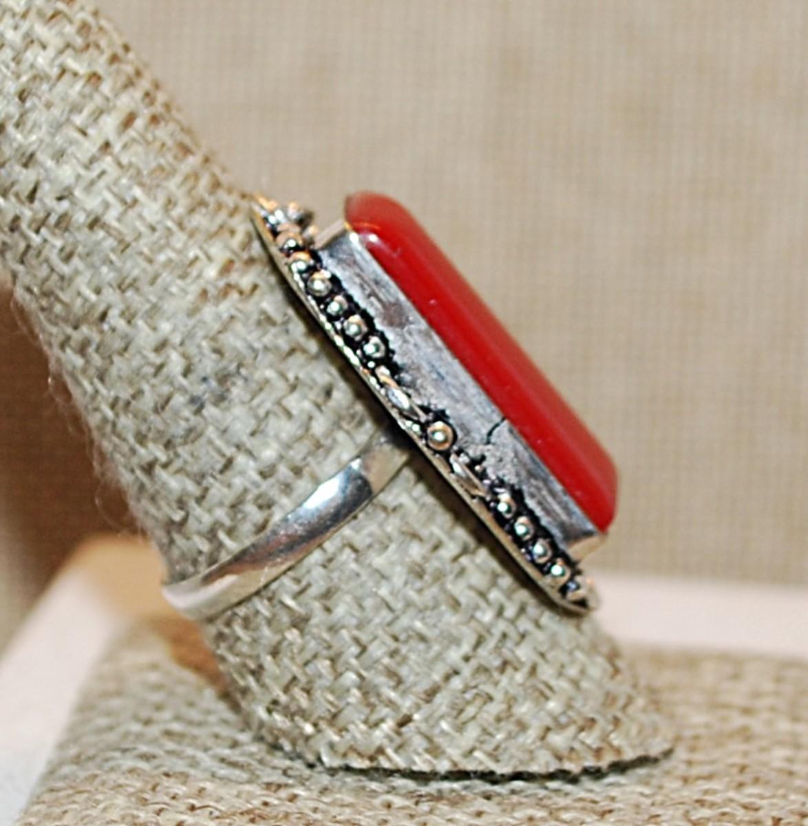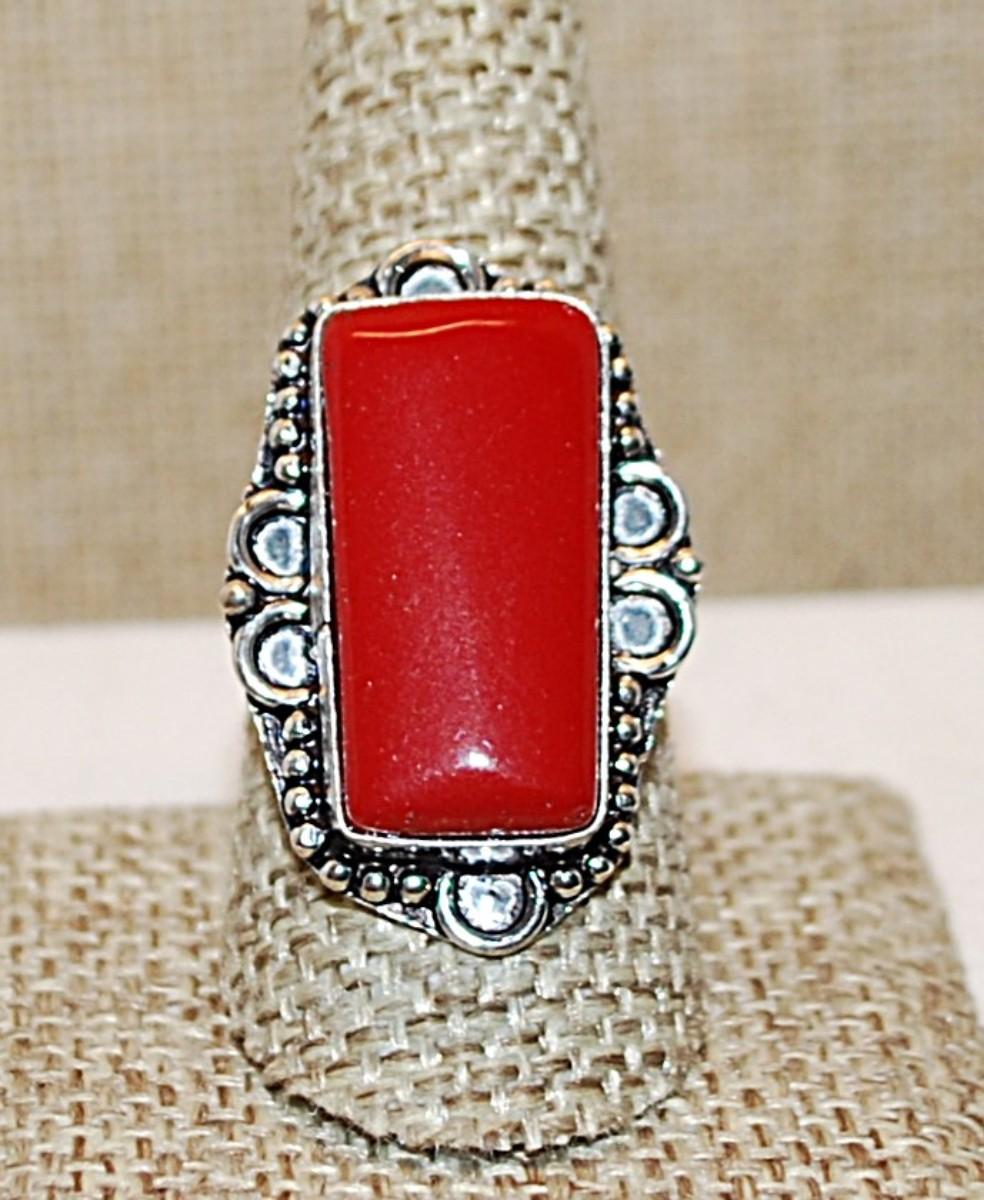 Size 9¼ Bright RED Long Rectangle Shape JASPER Gemstone Ring with a 6 Loop Surround on a Silver Tone Band (8.8g)
