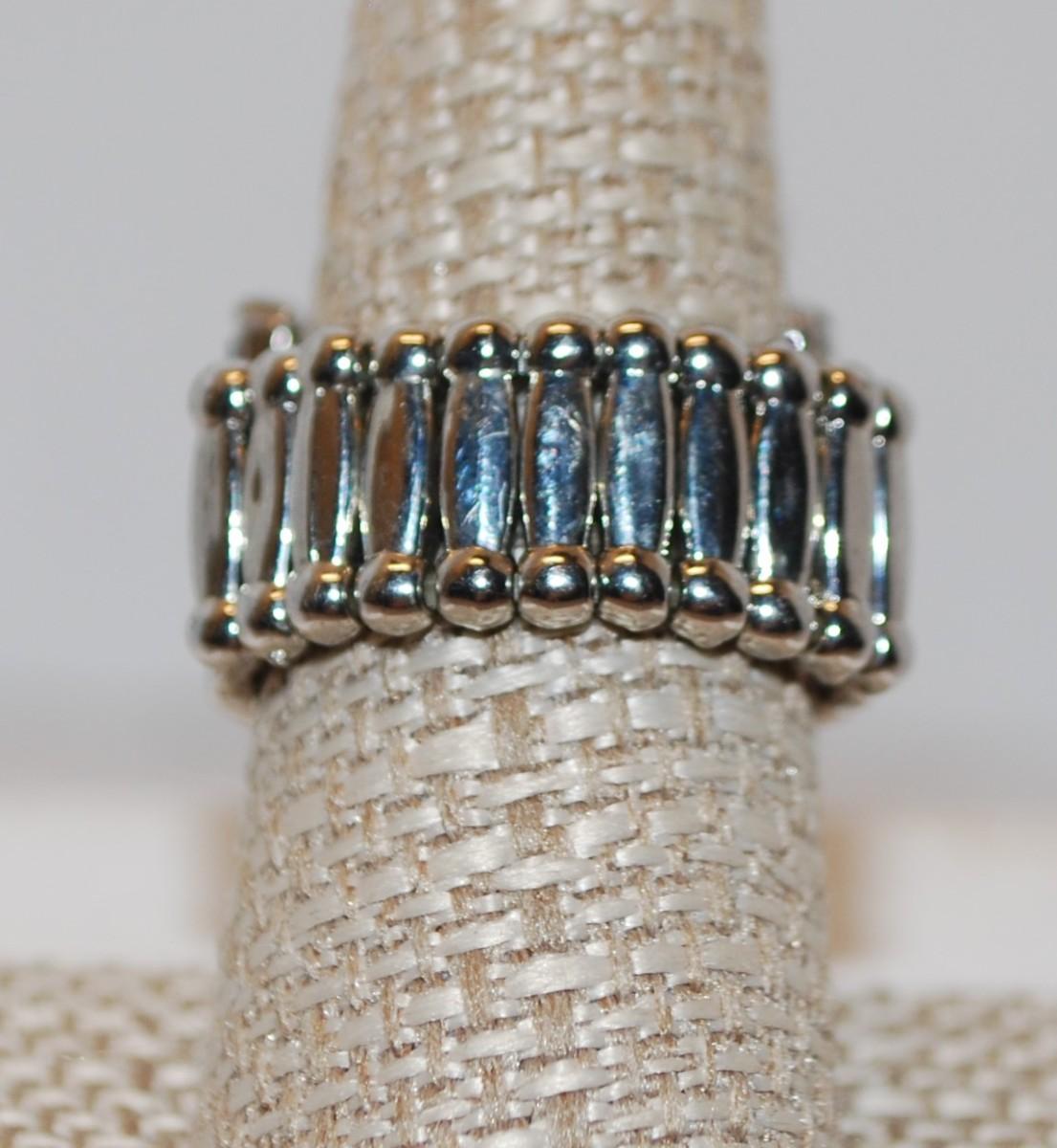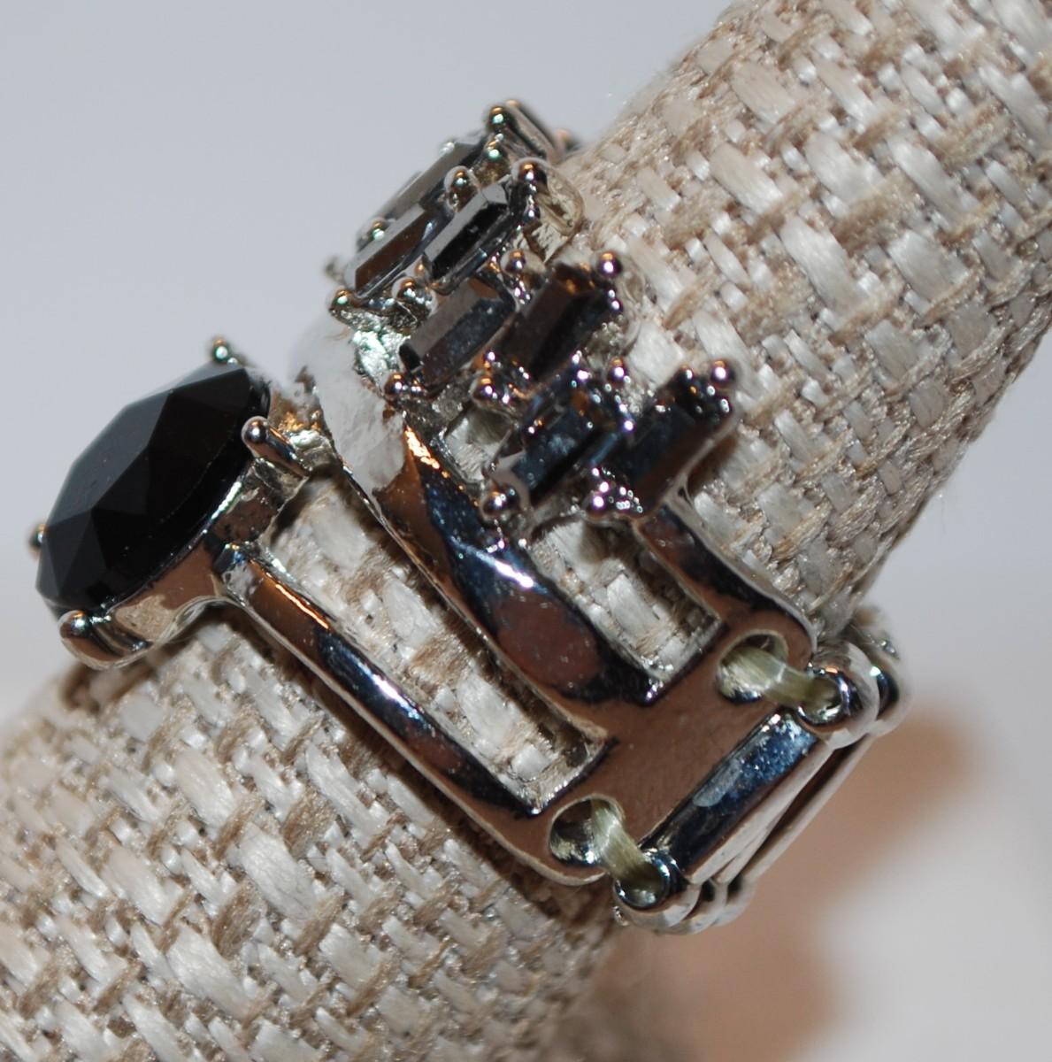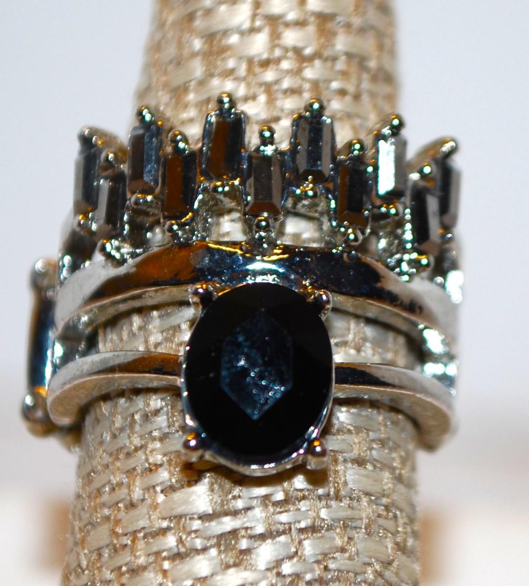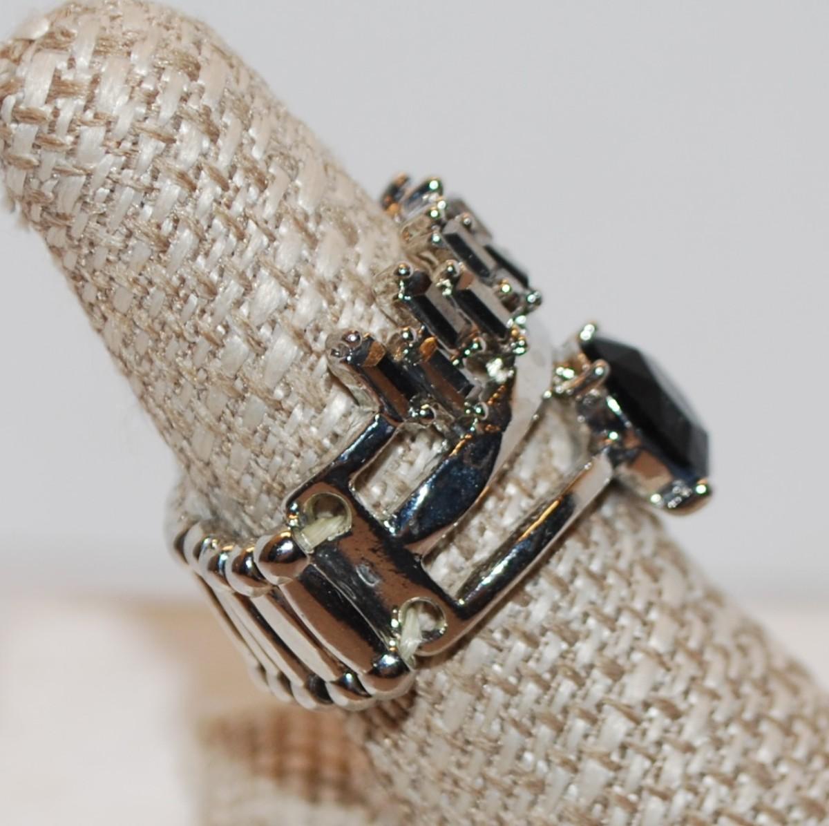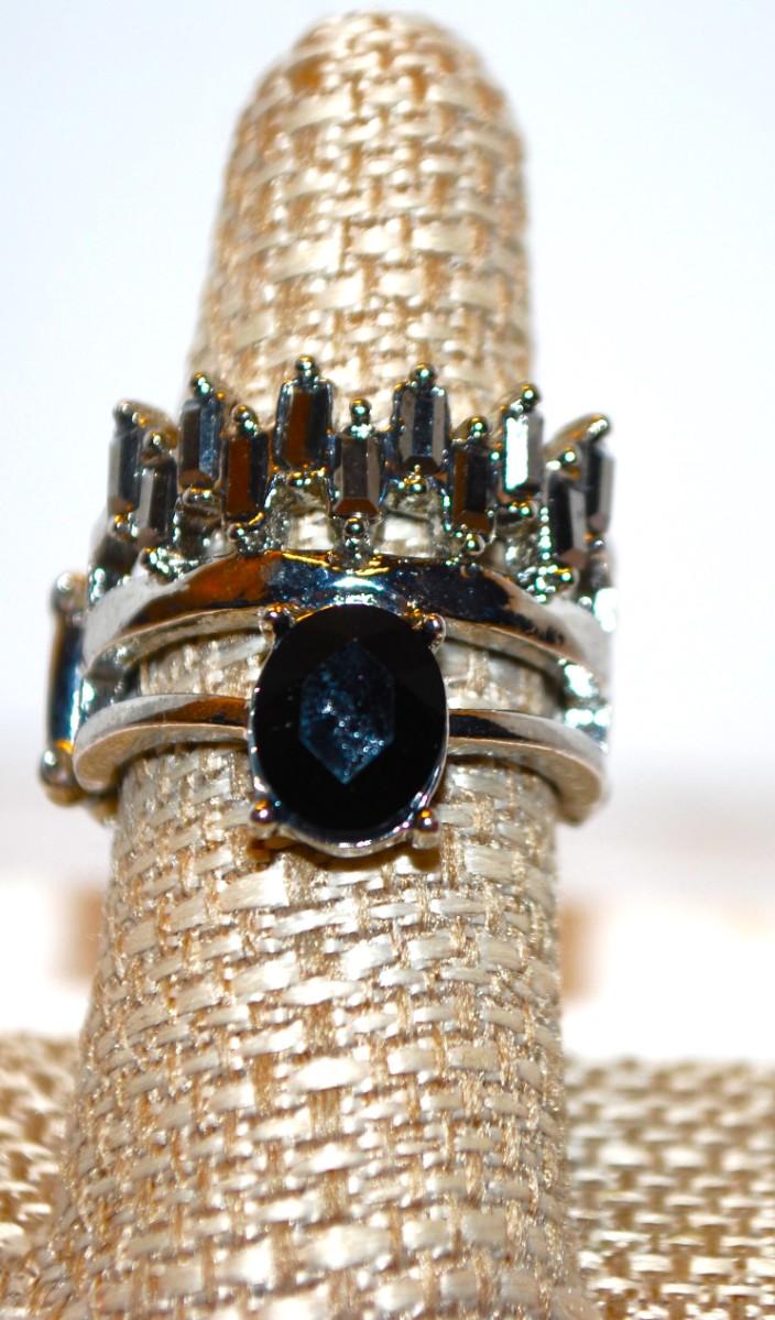 Size 9 "Crown" Style Ring with Black Oval Main Stone on Expandable Silver Tone Band (8.6g)