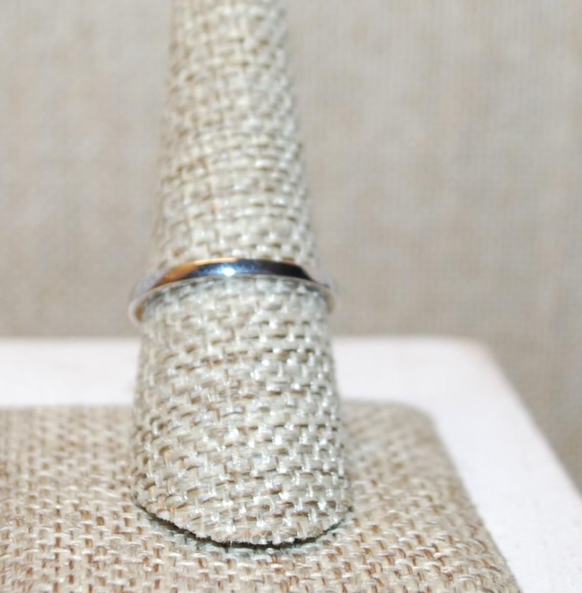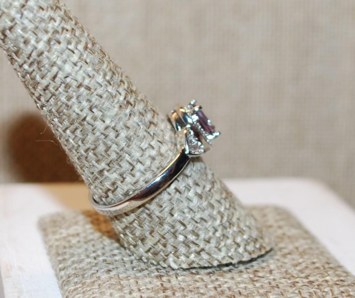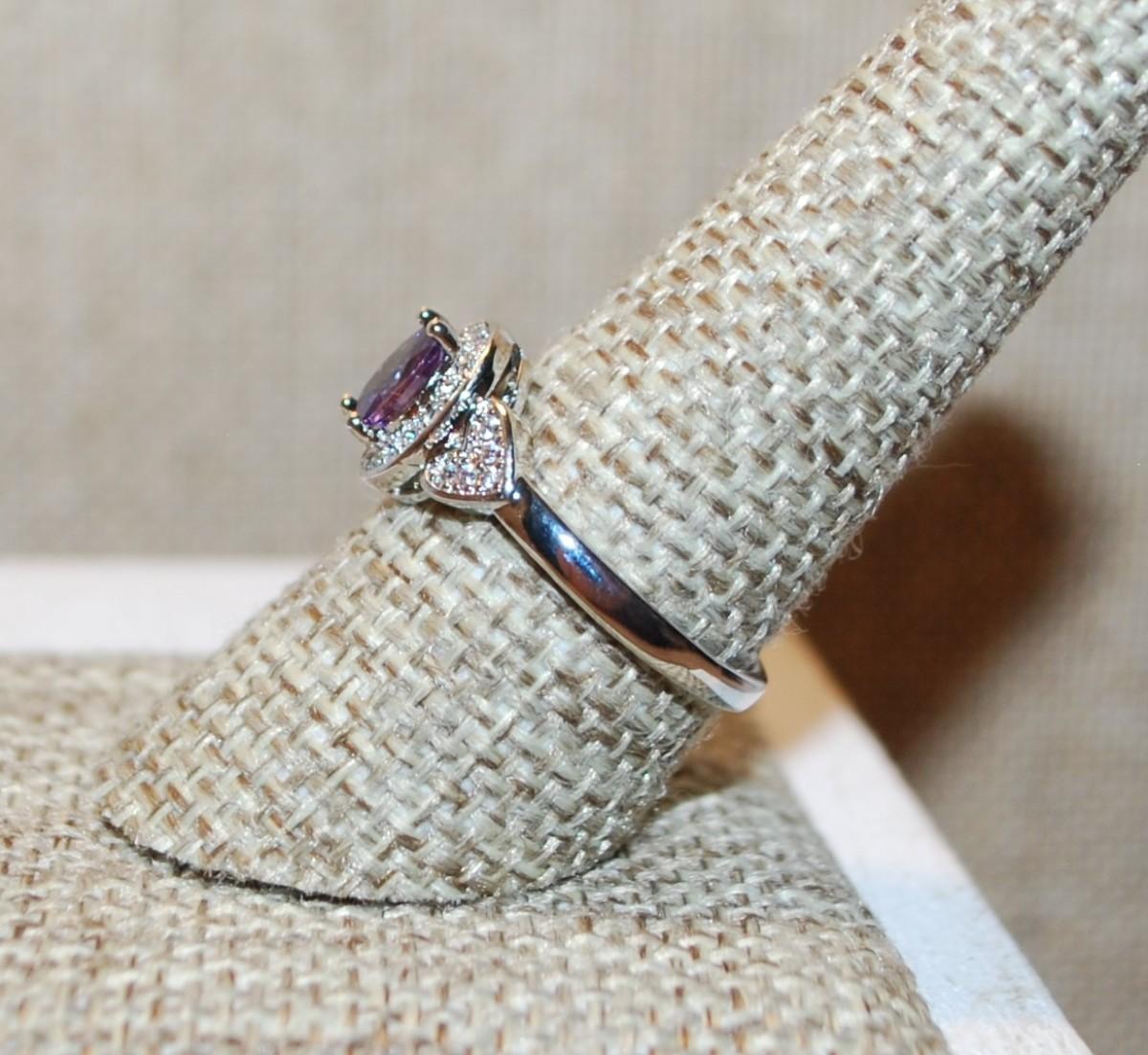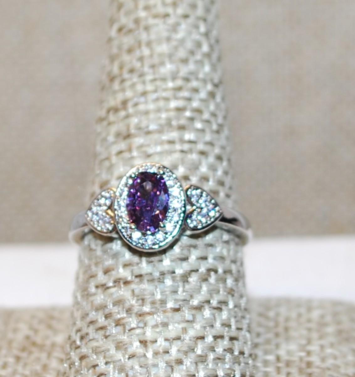 Size 9 Purple Oval Stone Ring Marked .925 Silver with Hearts Side Surrounds on Silver Band (2.8g)