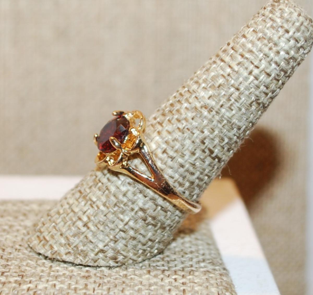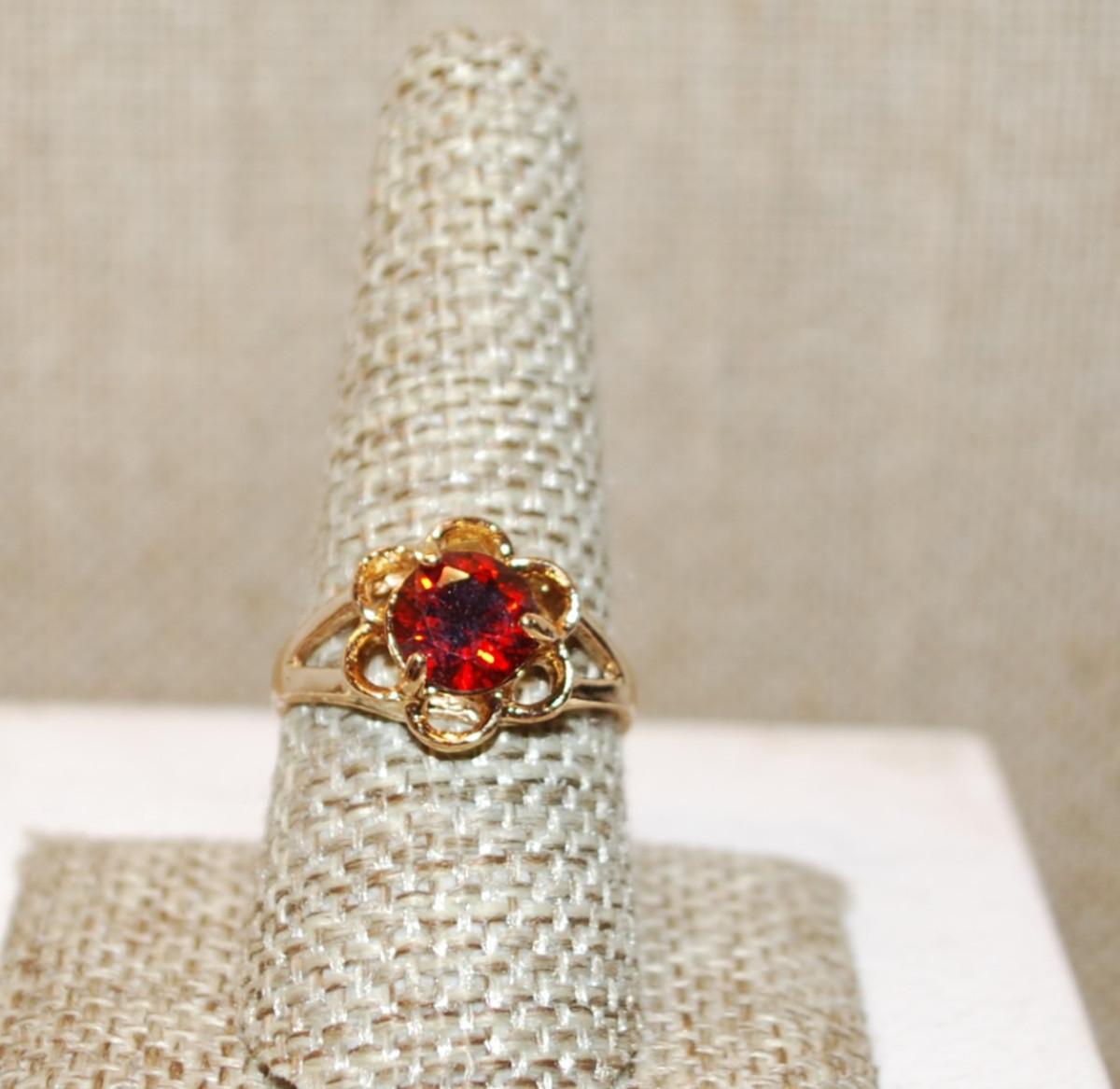 Size 9 Deep Red Round Stone Ring with "Circles" Accents on a Gold Tone Band (3.0g)