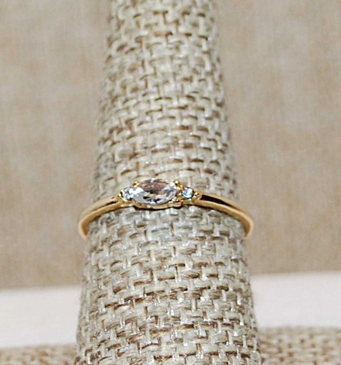 Size 9 Delicate Horizontal Clear Stone Ring & 2 Round Clear Side Stones on a Gold Tone Band (1.3g)