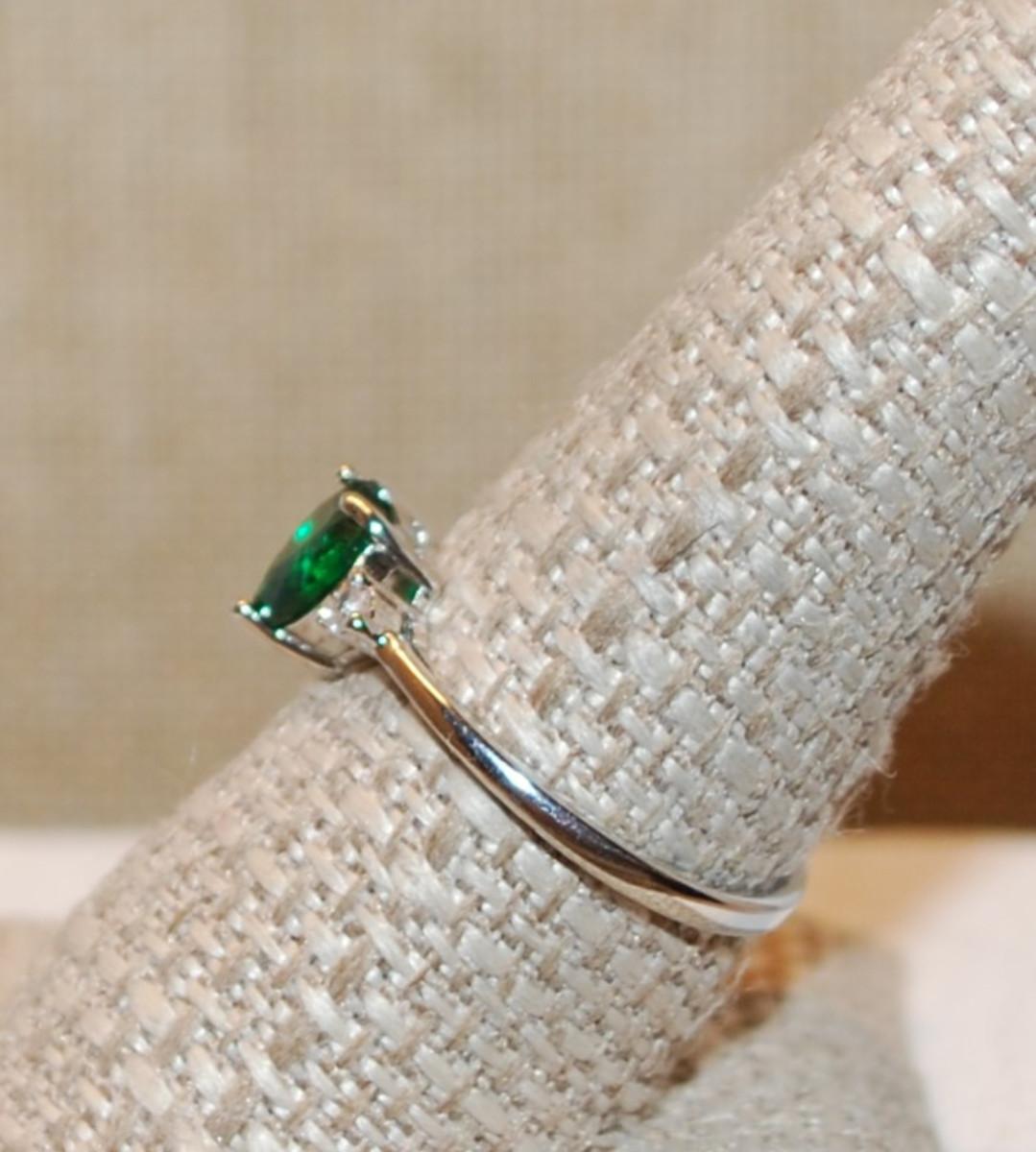 Size 9 ¼ GREEN HEART 3 Prong Stone Ring with 2 Round Clear Stone Sides on a Silver Band (1.9g)