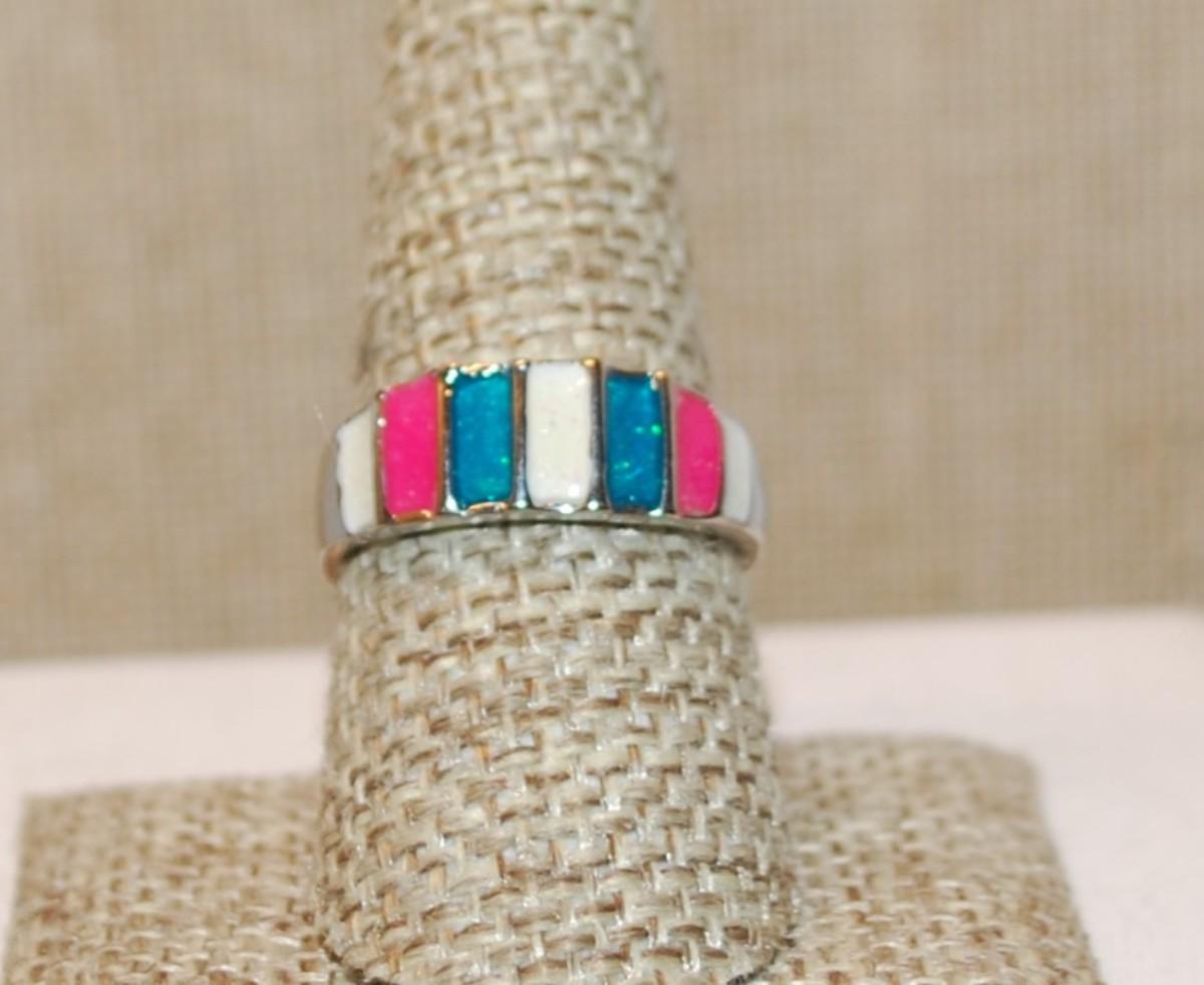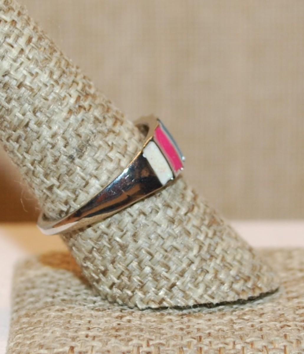 Size 9 Green, Pink and White Enamel Style Ring on a Silver Tone Band (3.6g)