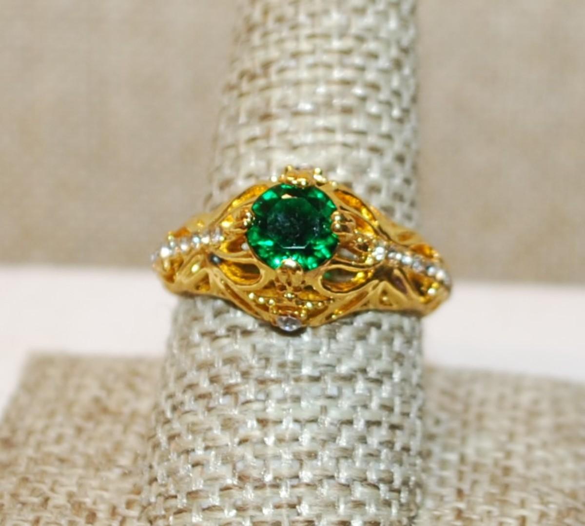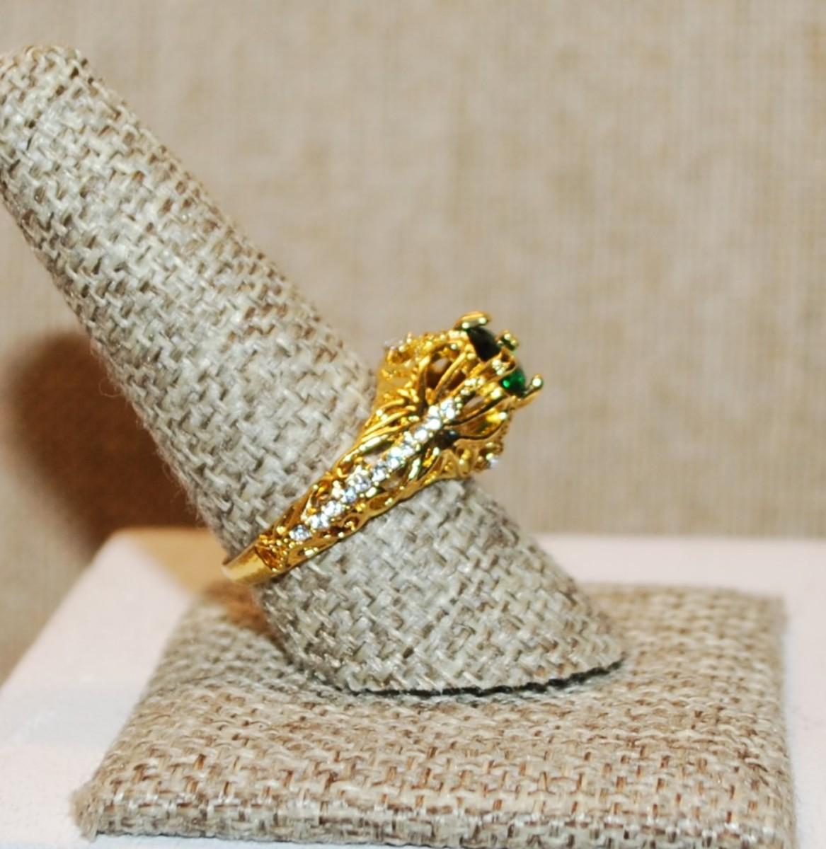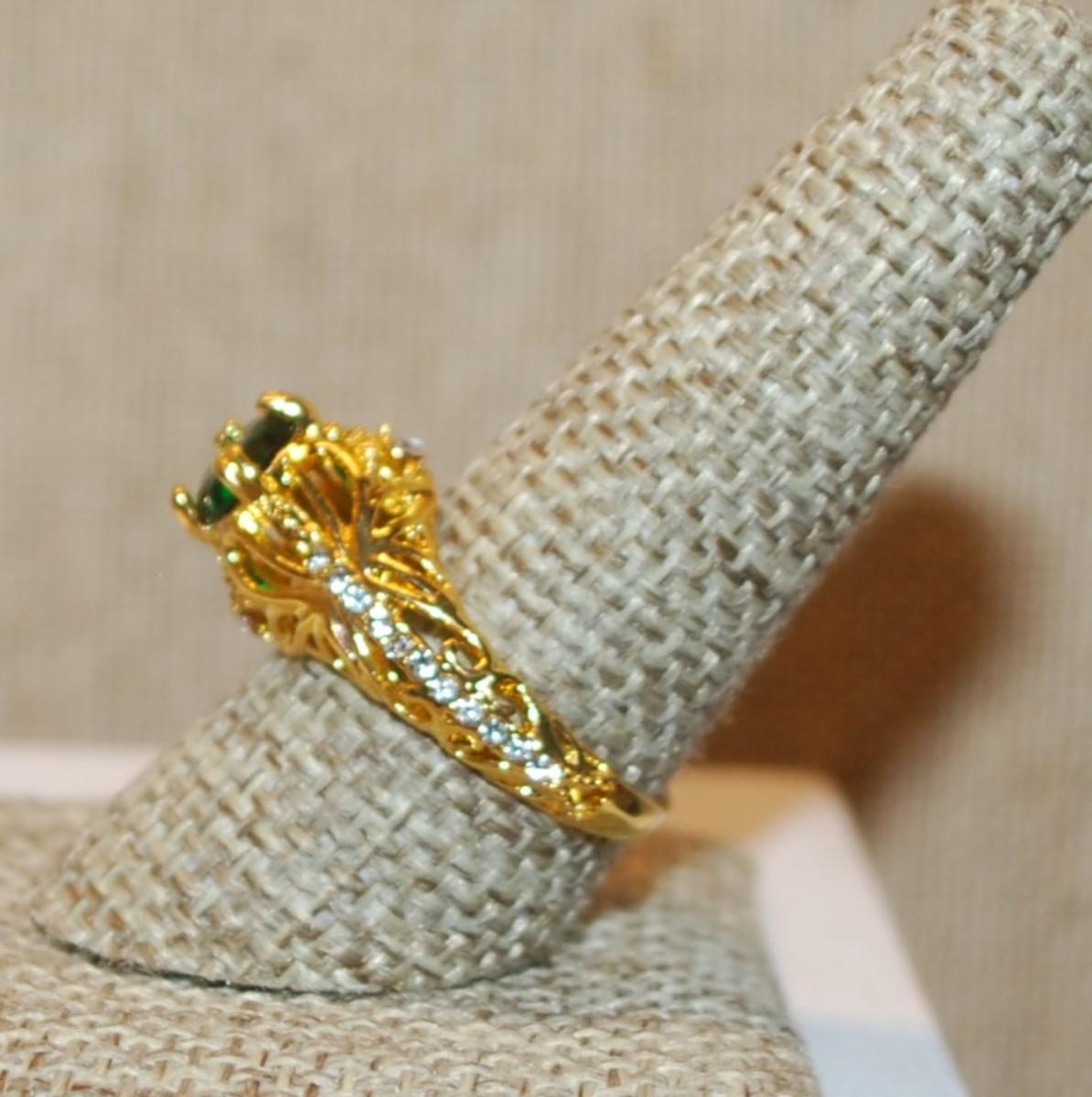 Size 9¼ Highrise 4 Prong Green Stone Ring Side Line Accent Stones on a Gold Tone Band (4.7g)