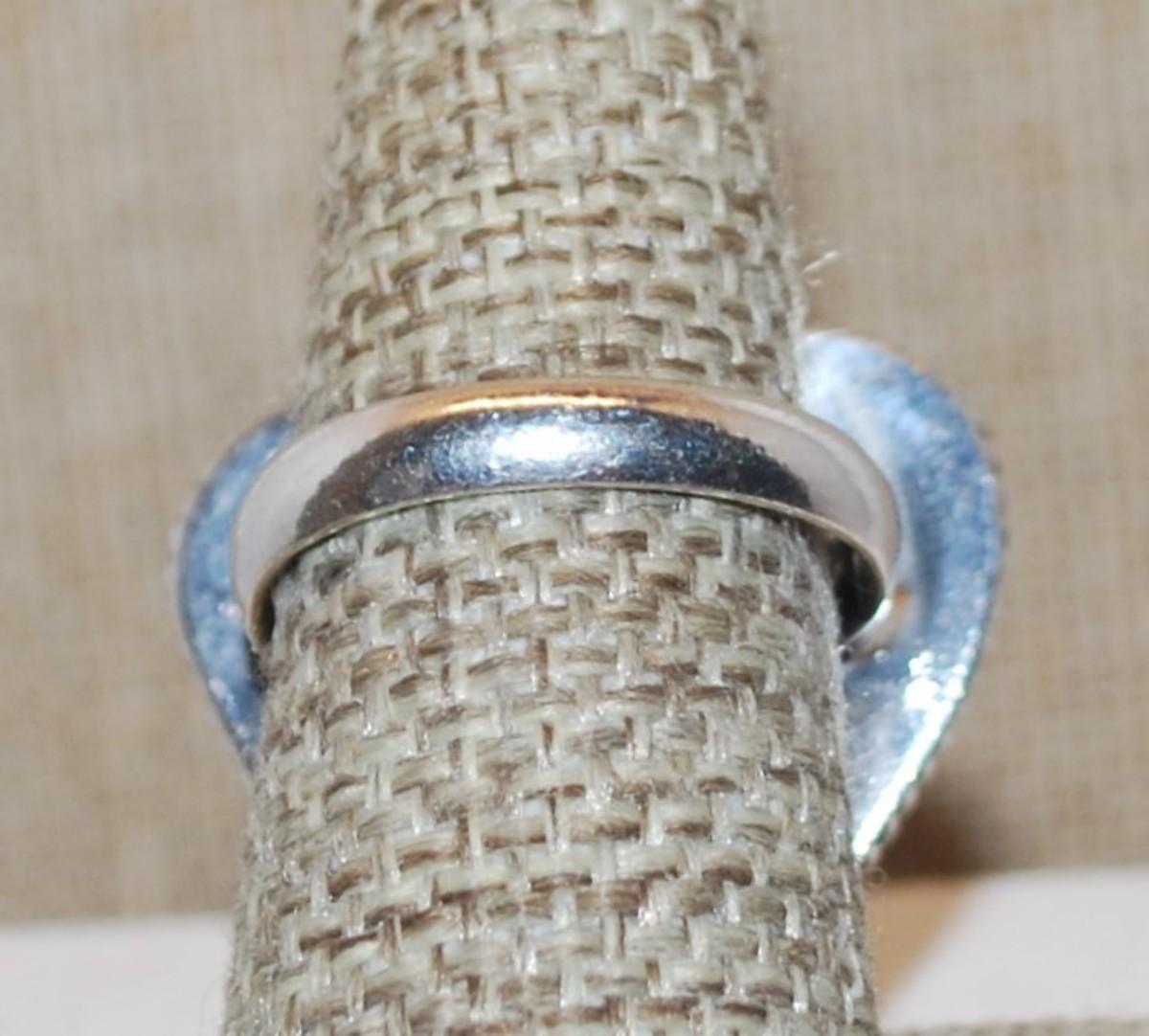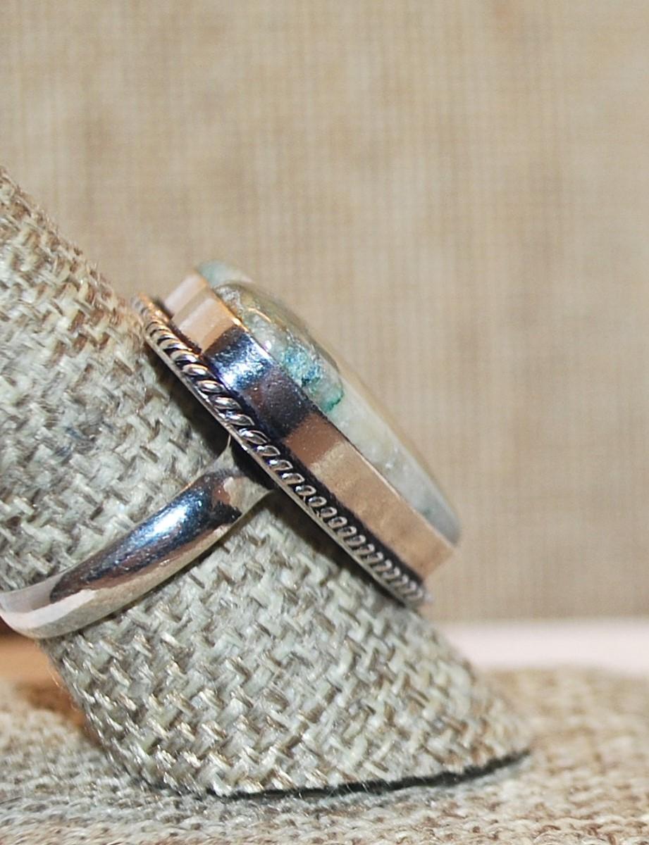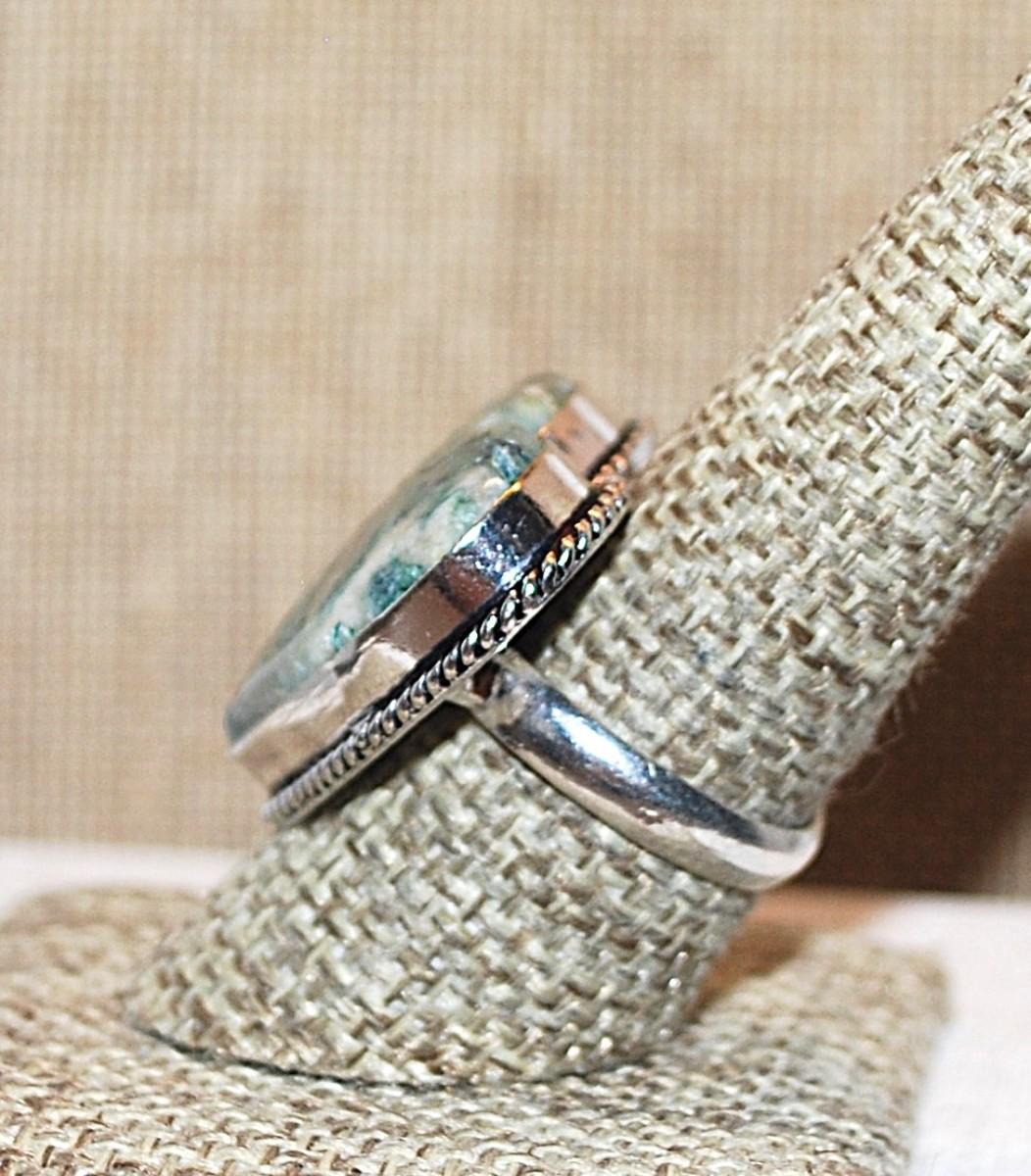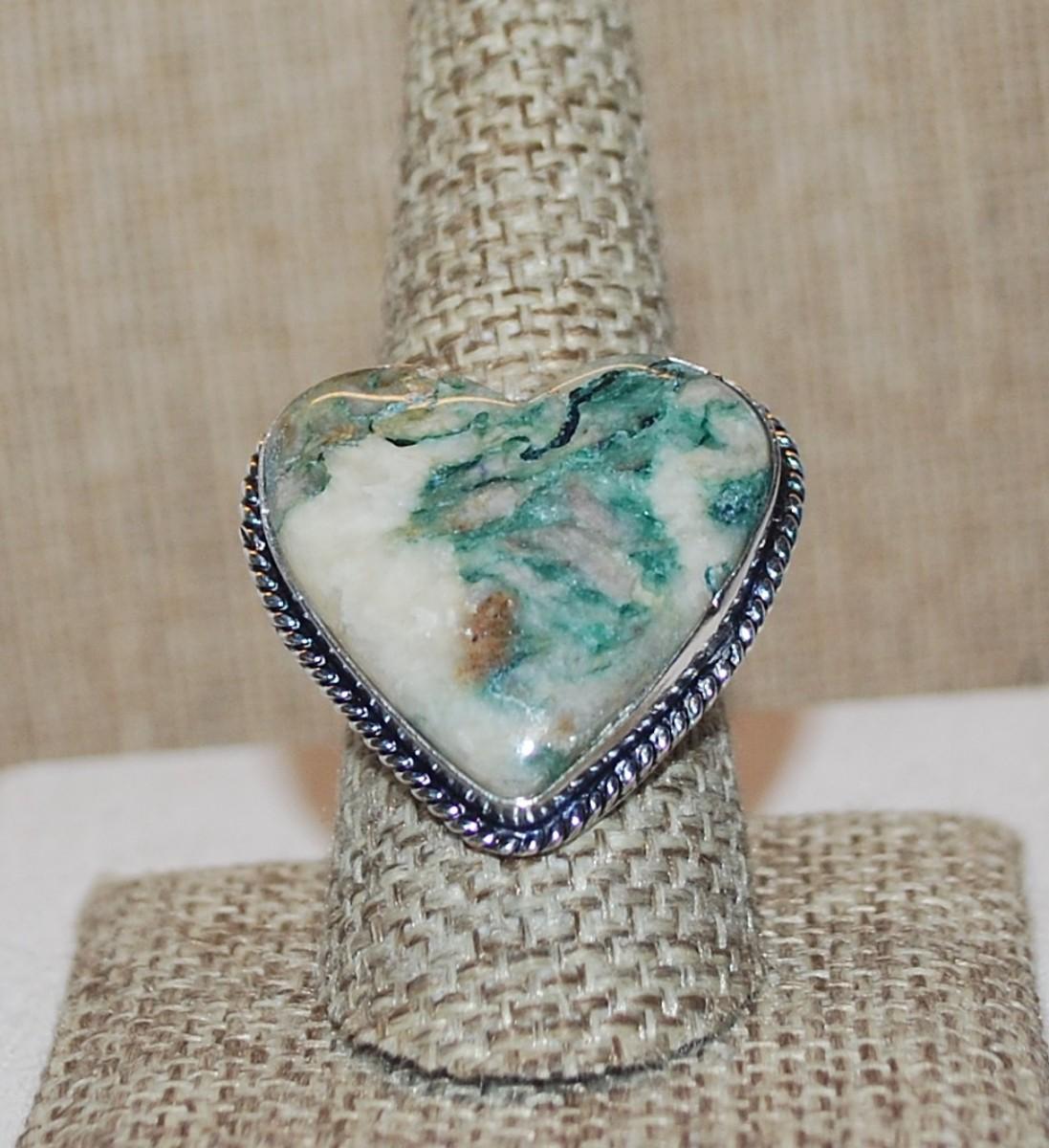 Size 9 Marked .925 Beautiful HEART SHAPED GREENS AGATE Gemstone Ring with Rope Surround on a Silver-Plated Band (10.5g)