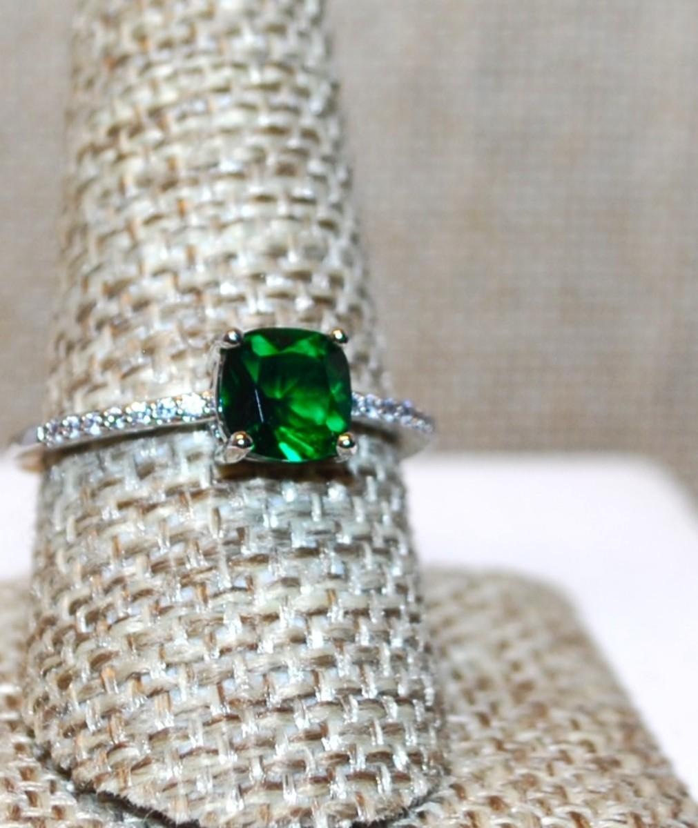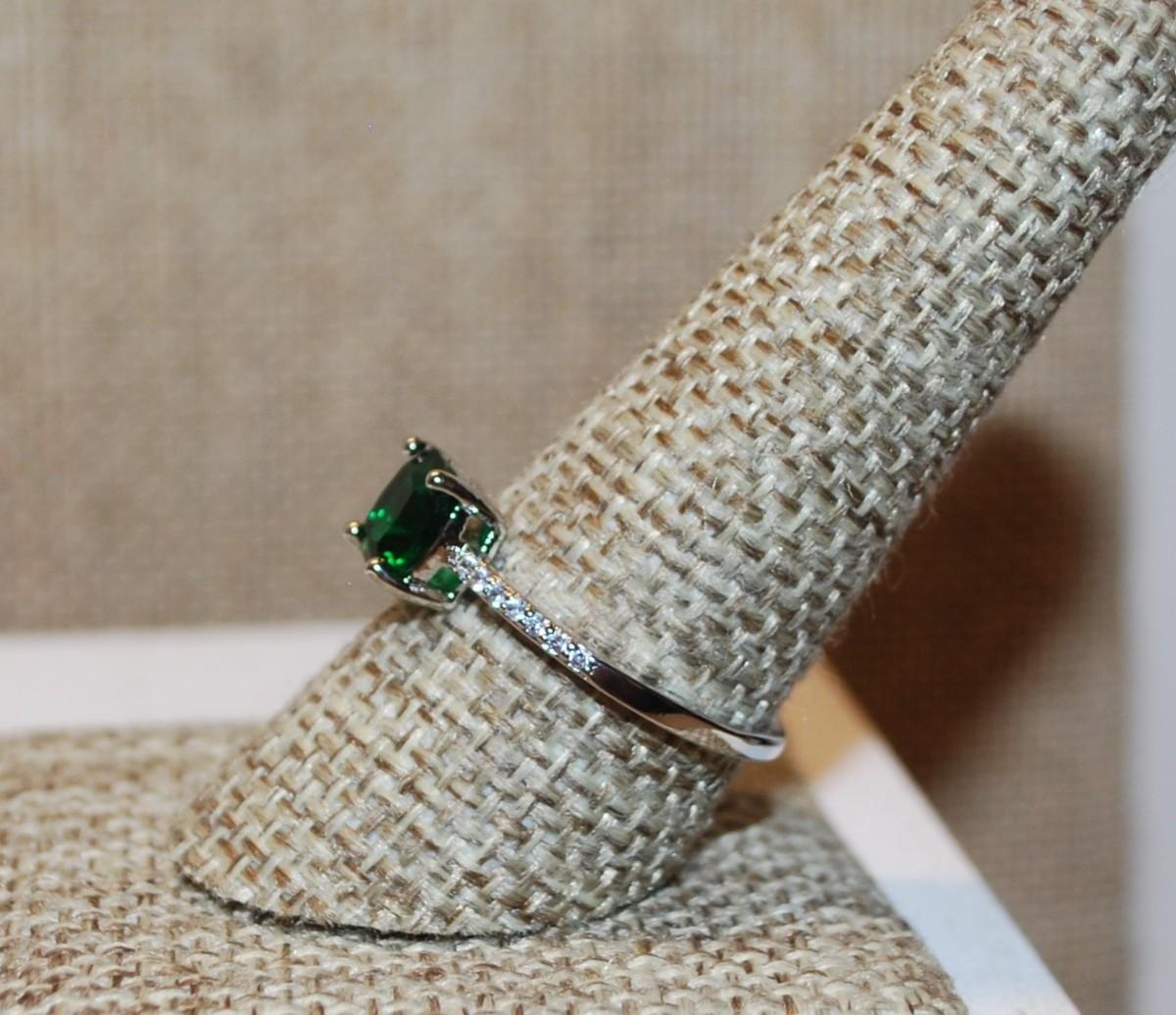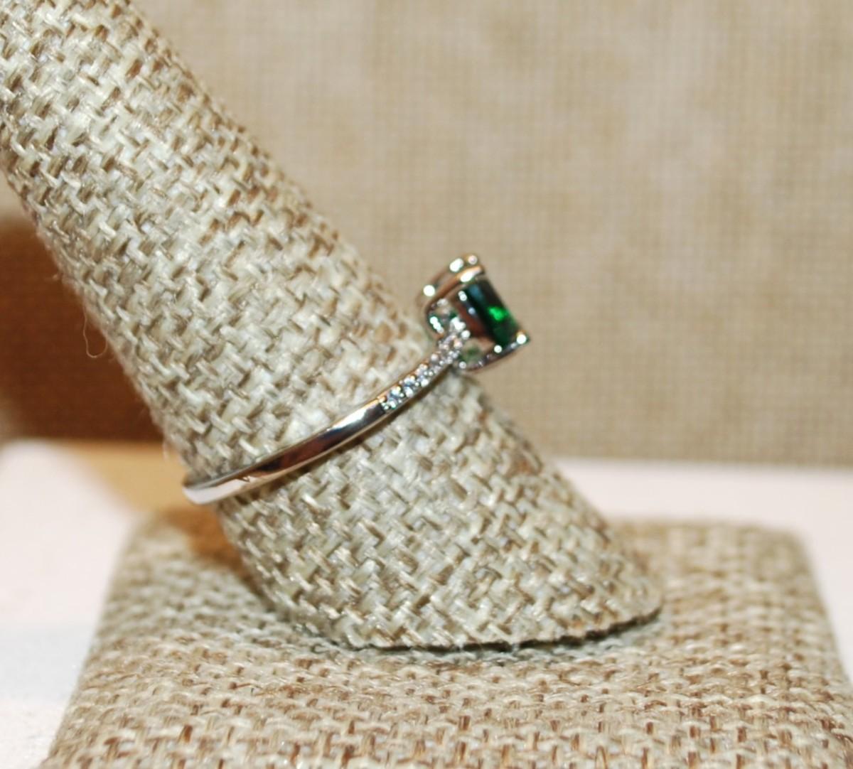 Size 9½ Marked .925 Deep Green Stone Asscher Cut 4 Prong Ring with Side Accents on a Silver Tone Band (1.9g)