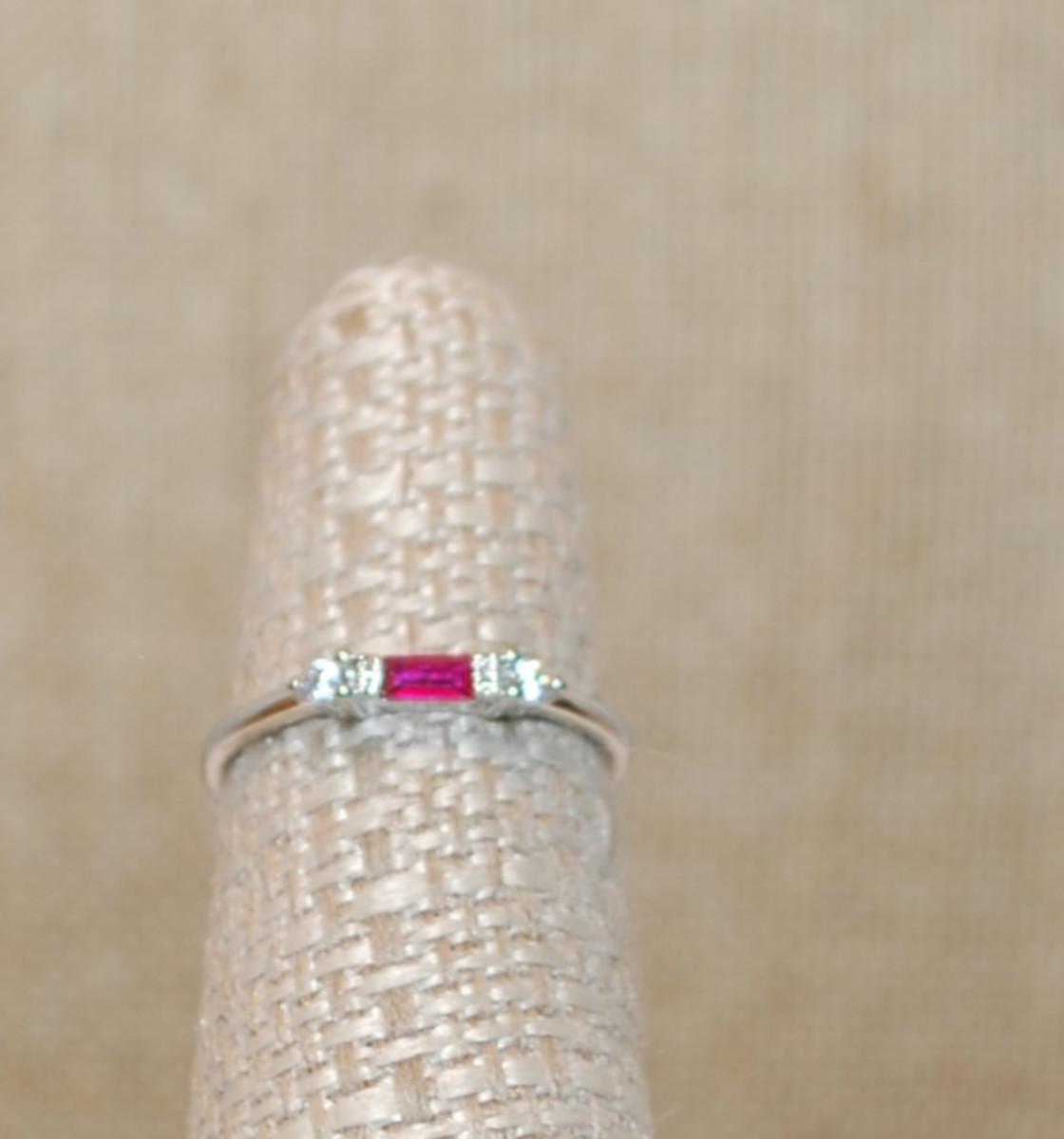 Size 9 Marked .925 Delicate RED Rectangle Stone Ring with 2 Round Clear Stone Sides on a Silver Band (1.2g)