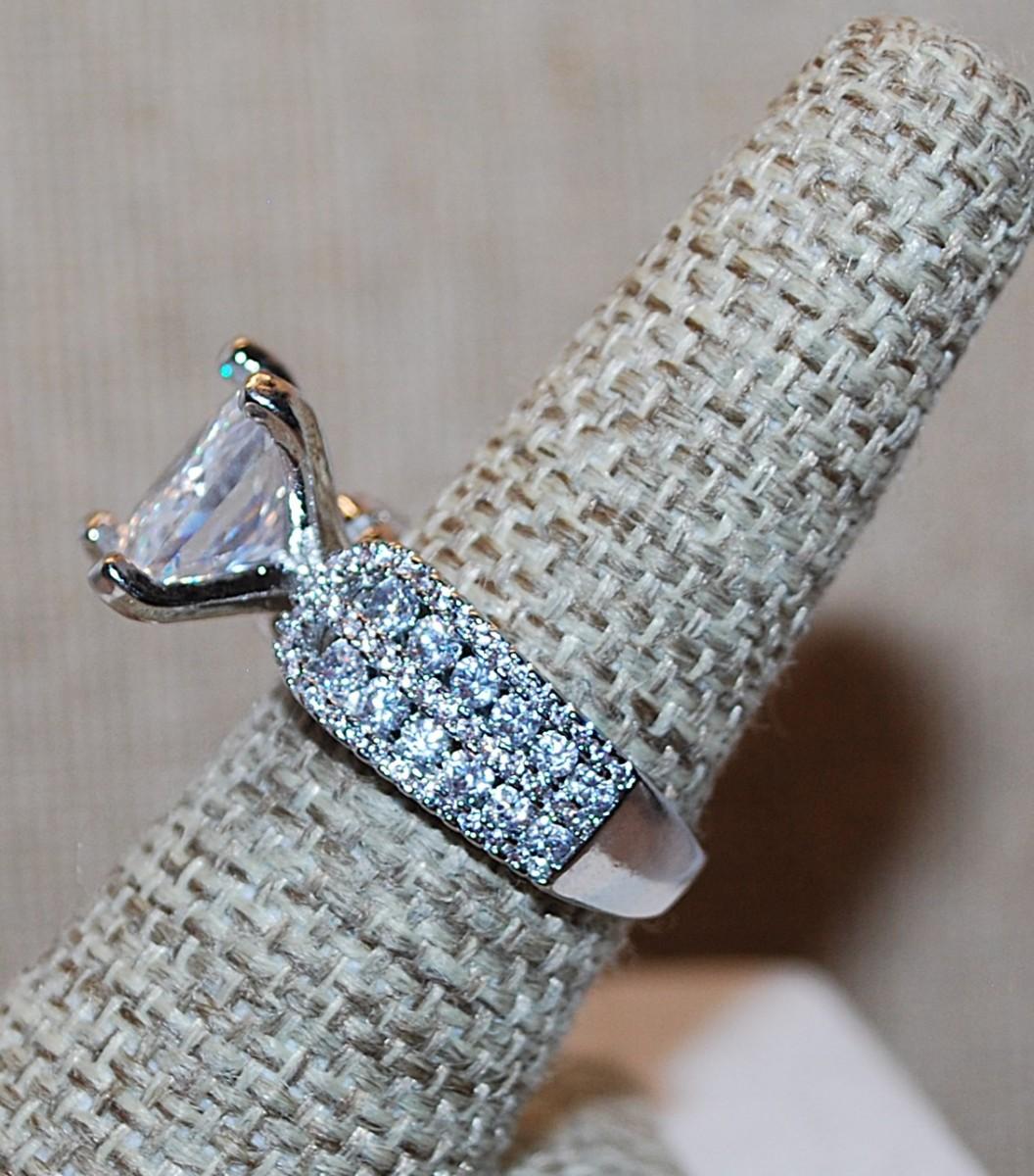 Size 9 Marked .925 Large Beveled Square Clear Main Stone Ring with Brillant Stone Side Accents on a Silver Band (7.8g)