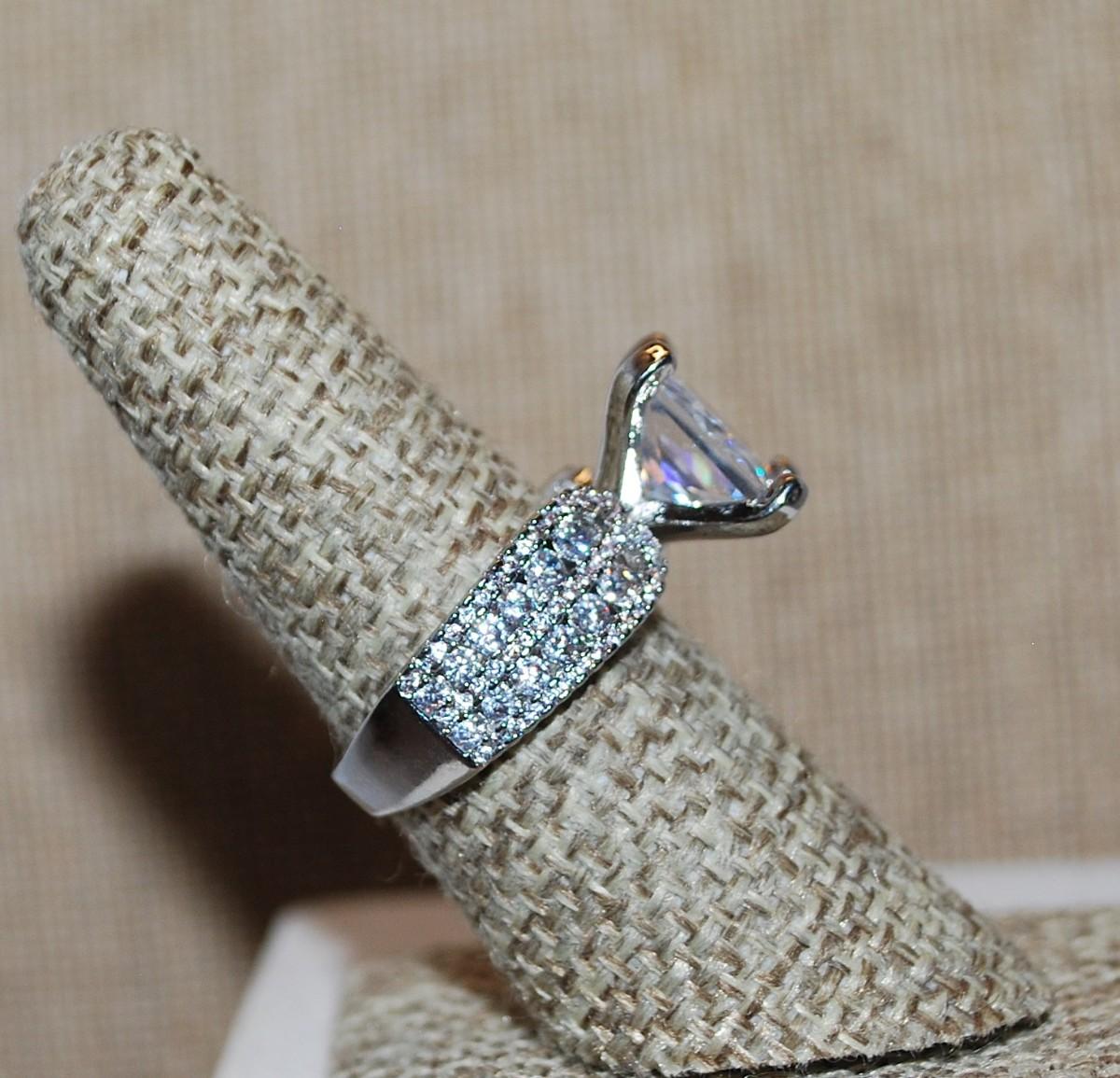 Size 9 Marked .925 Large Beveled Square Clear Main Stone Ring with Brillant Stone Side Accents on a Silver Band (7.8g)