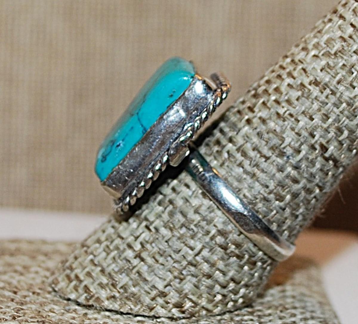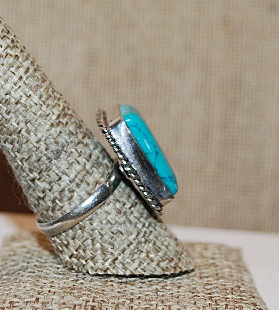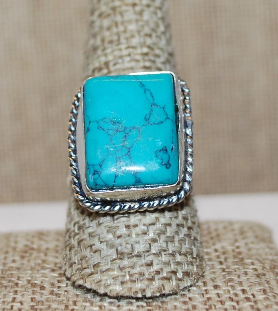 Size 9½ Marked .925 Large Rectangle Crackled Turquoise Gemstone Ring with Rope Style Surround on a Silver-Plated Band (6.5g)