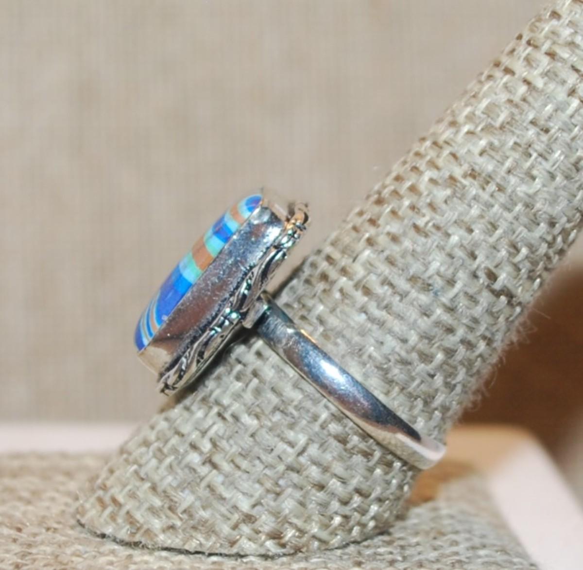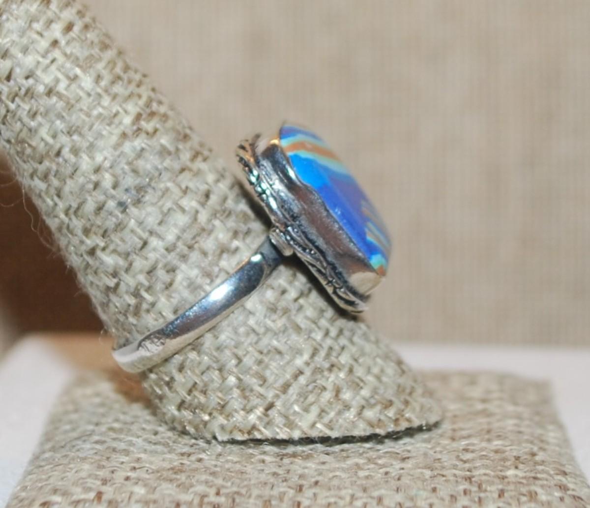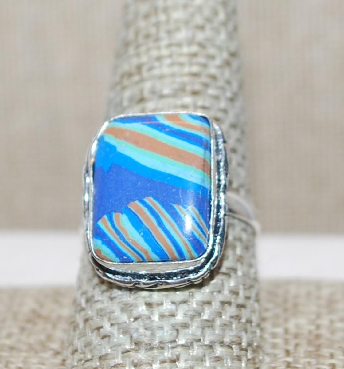 Size 9½ Marked .925 Rectangle RAINBOW CALSILICA Gemstone Ring with Full Slanted Lines in Blues & Orange and Silver-Plated Band (5.1g)