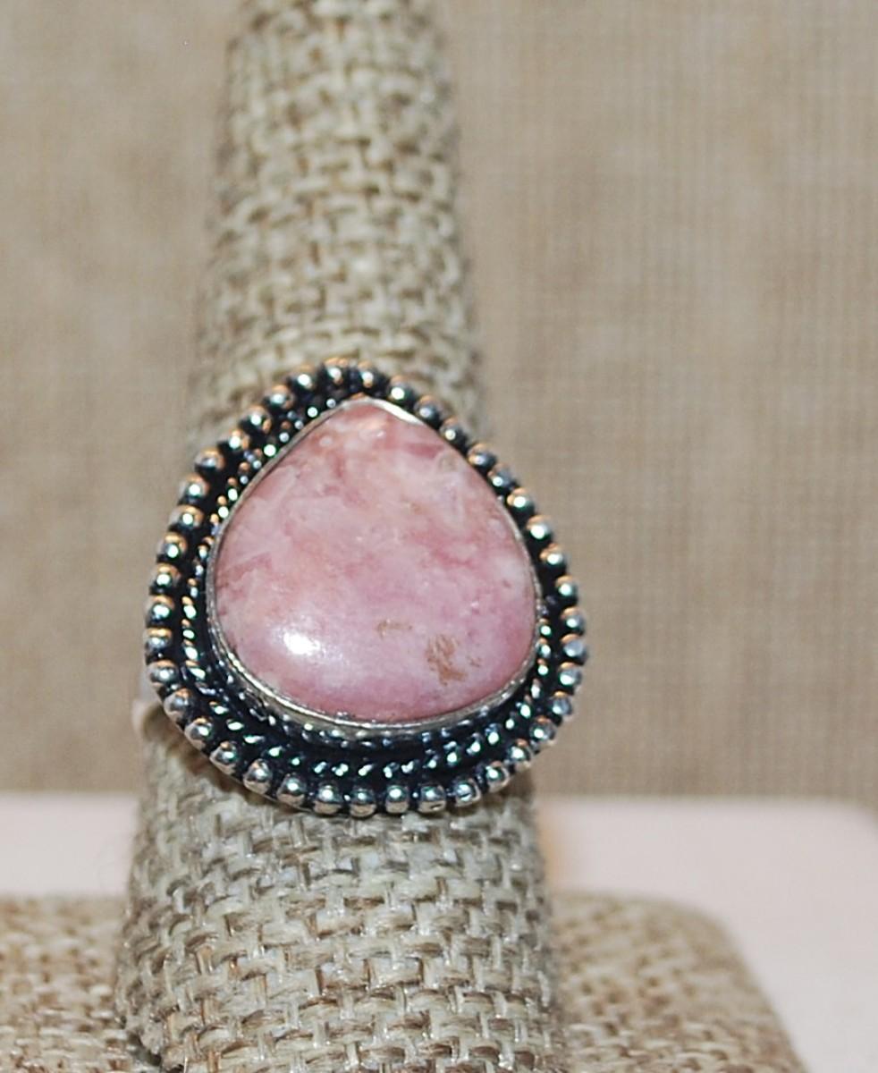 Size 9 Marked .925 Triangle Shape PINKS AGATE Gemstone Ring with a Decorative Full Surround on a Silver-Plated Band (8.3g)