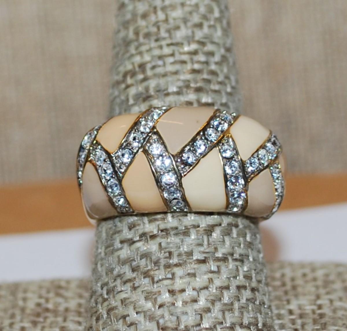 Size 9½ Marked "Jand" - Vintage Party RING with Beige Segments Separated with Swirl Rows of Clear Stones and Gold Tone Band (8.1g)