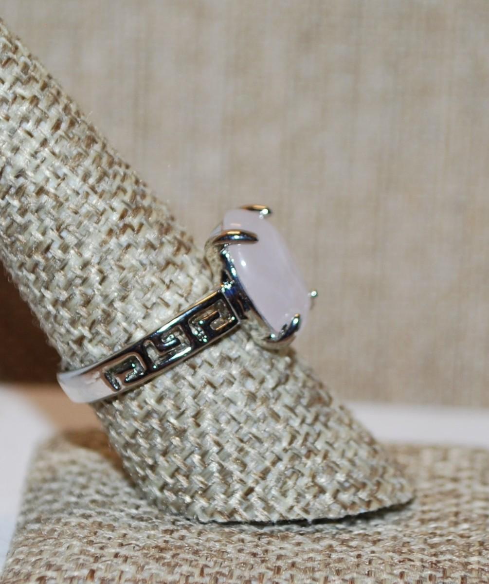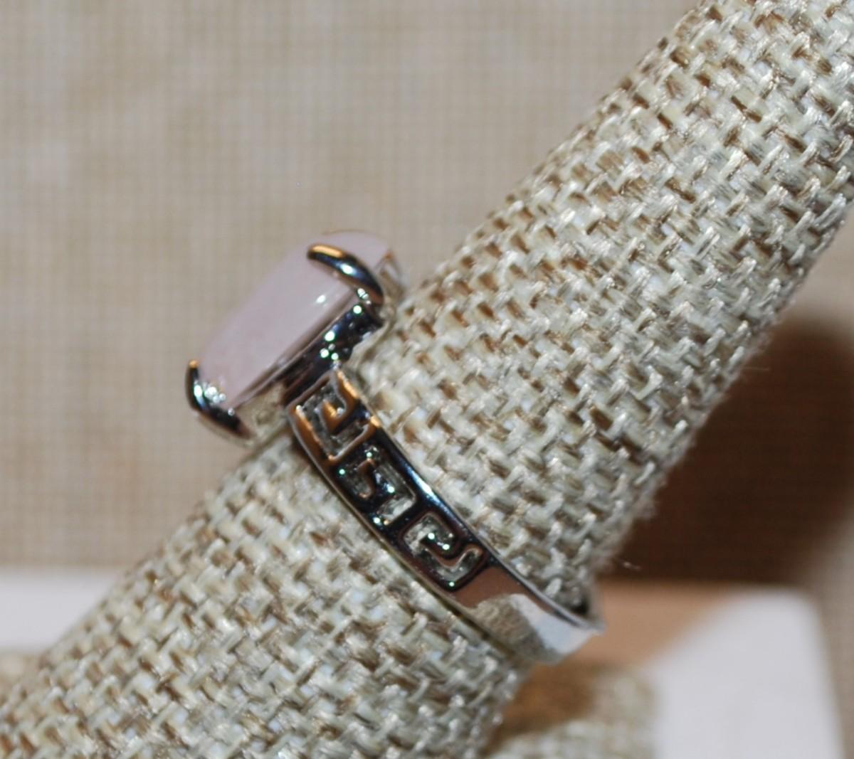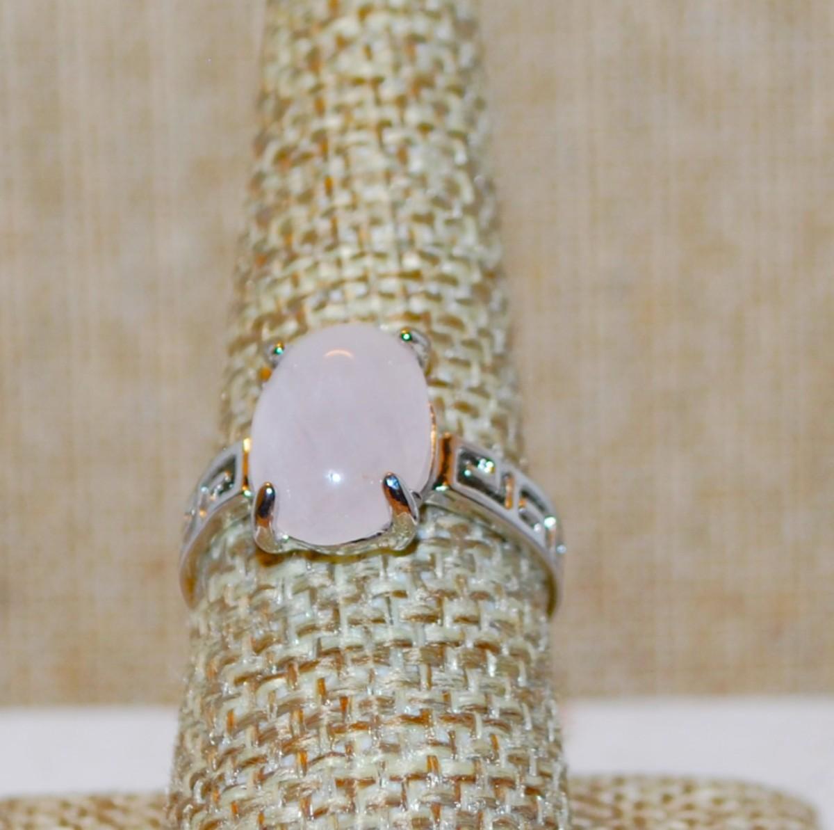 Size 9 Oval Rose Quartz Stone Ring with 3 Box Sides on a Silver Tone Band (3.6g)