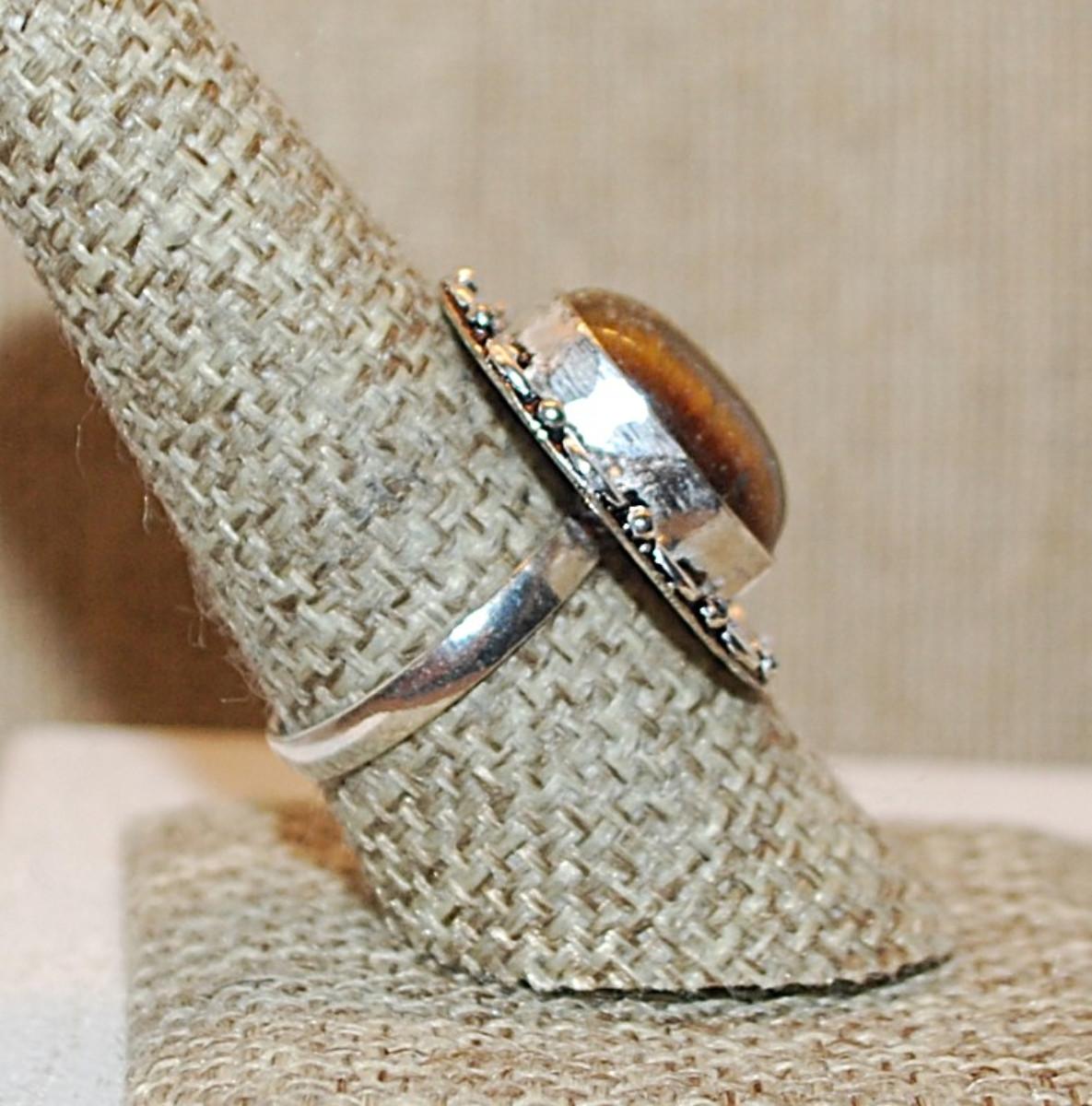 Size 9 OVAL TIGER EYE Gemstone Ring with Full Loops Surround on a Silver Tone Band (6.4g)