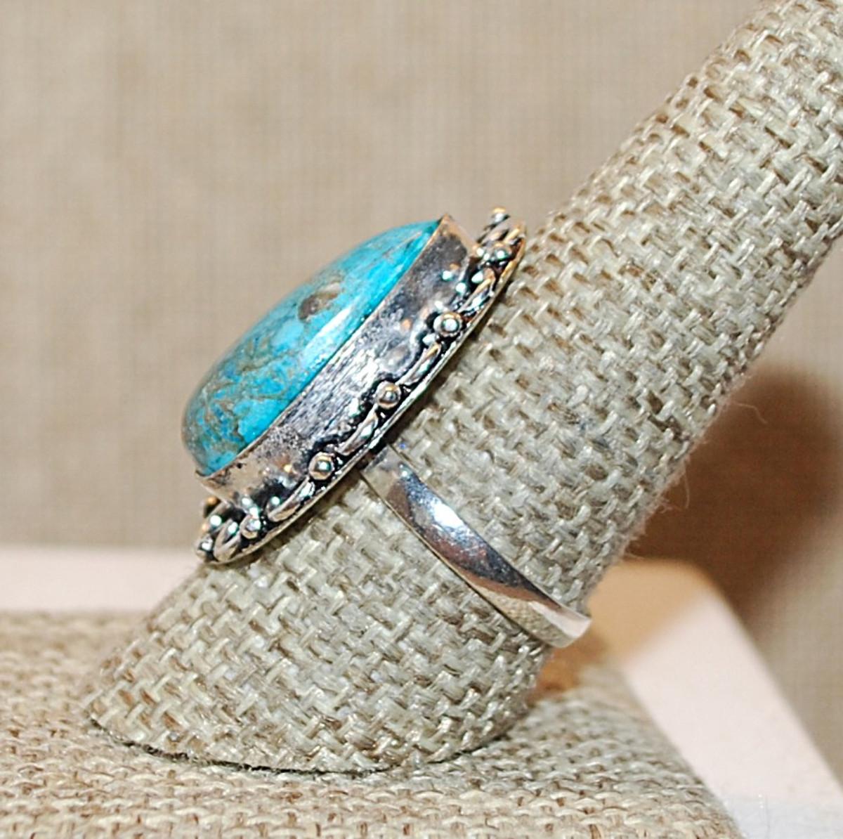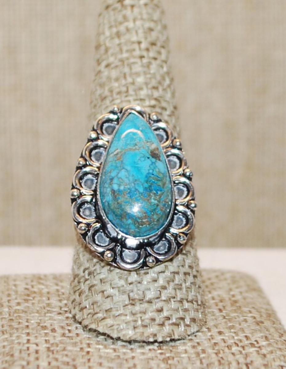Size 9½ PEAR Shaped Crackled TURQUOISE Gemstone Ring with a Full Surround on a Silver Tone Band (6.7g)