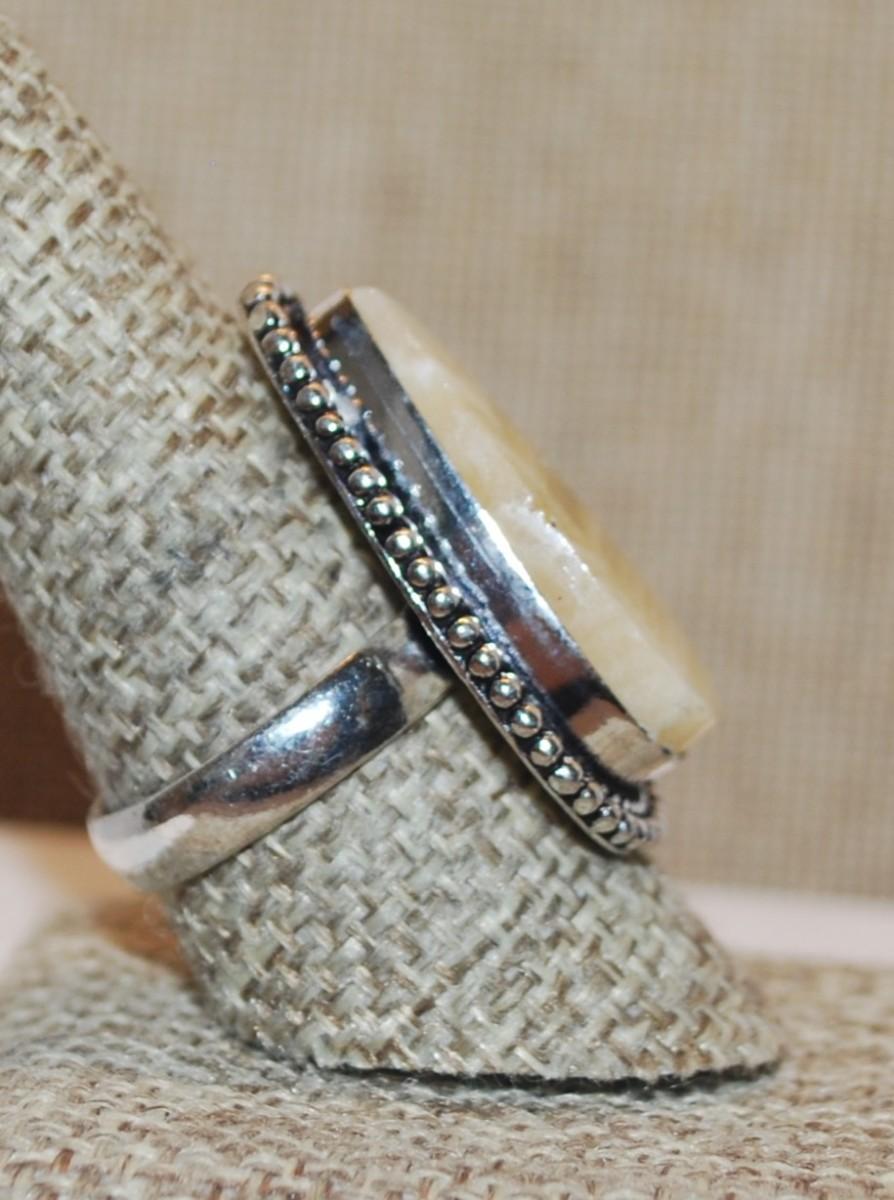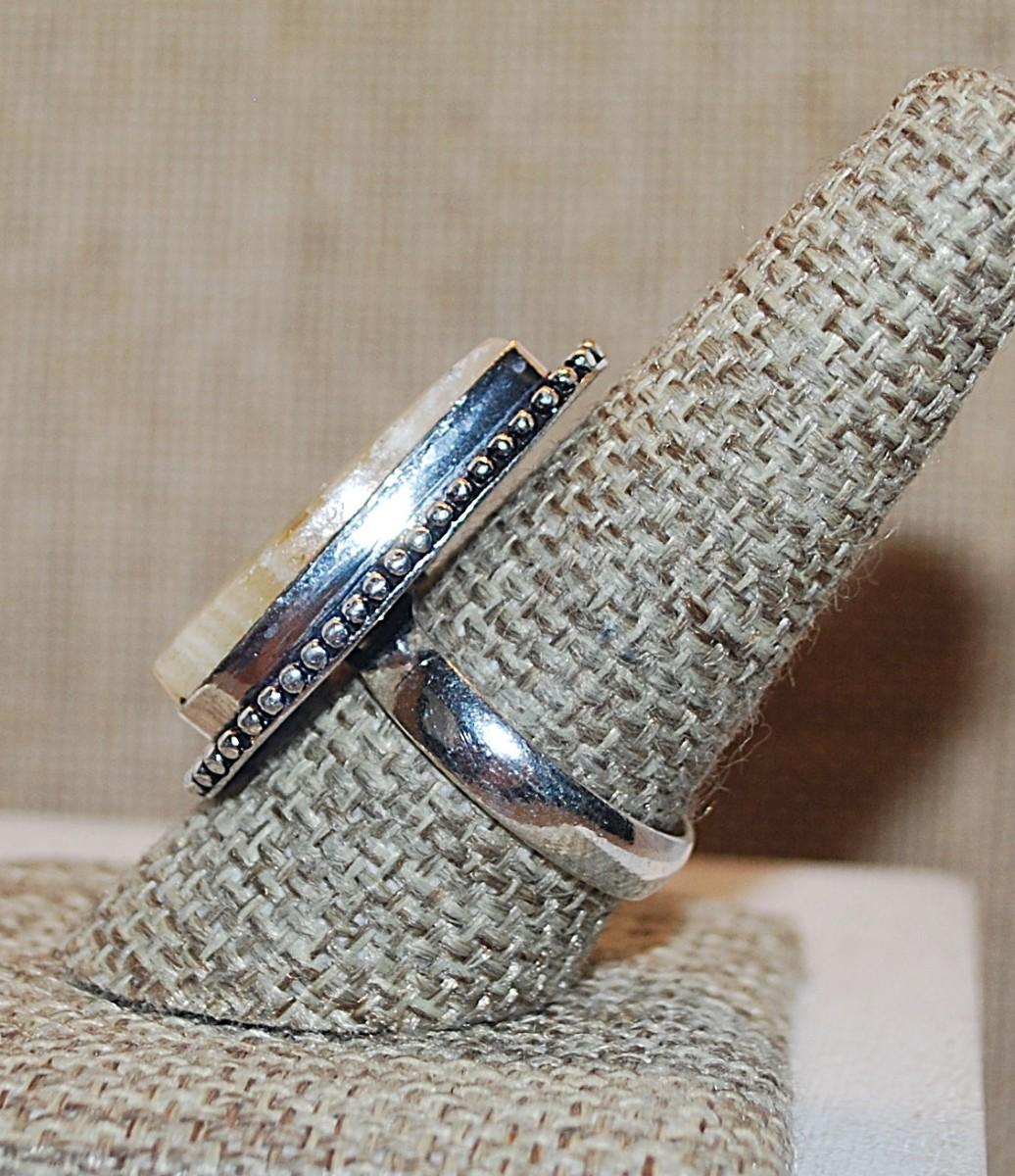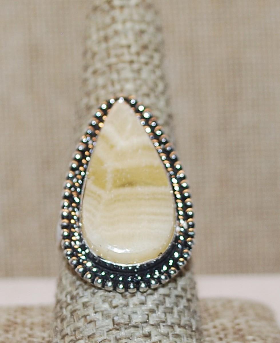 Size 9 Pointed PEAR Shape Multi-Colored BEIGE AGATE Gemstone Ring with Full Surround on a Silver Tone Band (9.3g)