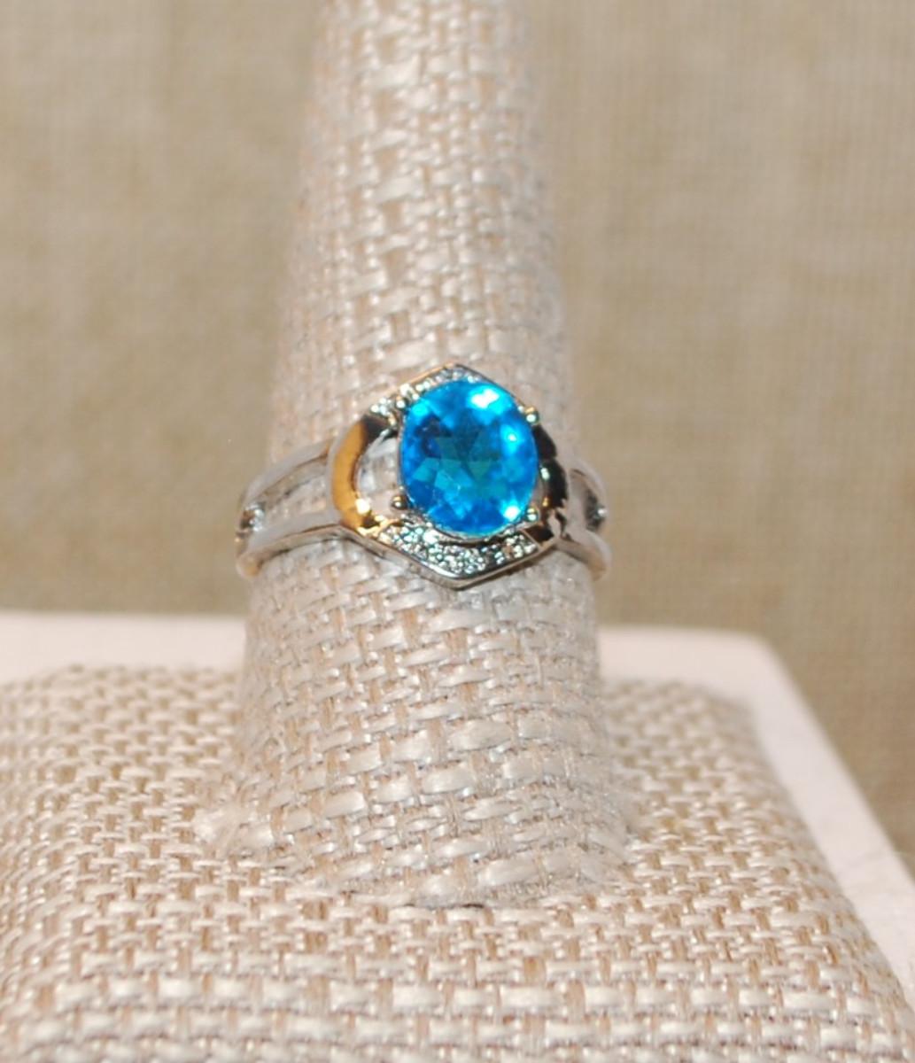 Size 9¾ Pretty Blue Oval Stone Ring with Top & Bottom Clear Stone Accents on a Open Silver Tone Band (4.2g)