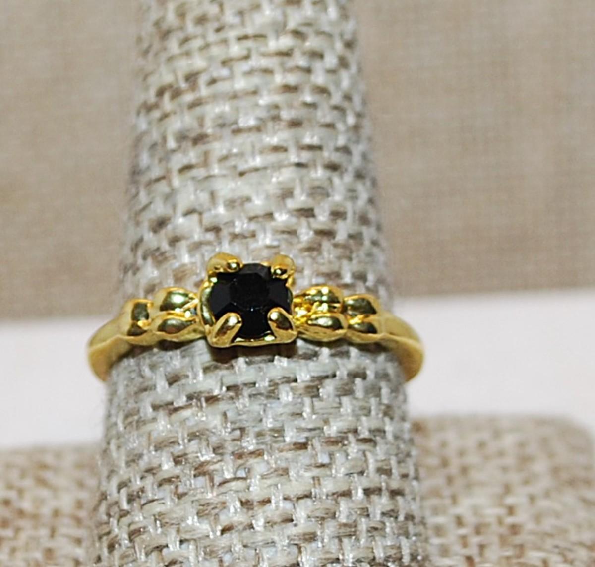 Size 9½ Round BLACK Stone 4 Prong Ring with Side Globe Accents on a Bright Gold Tone Band (2.1g)