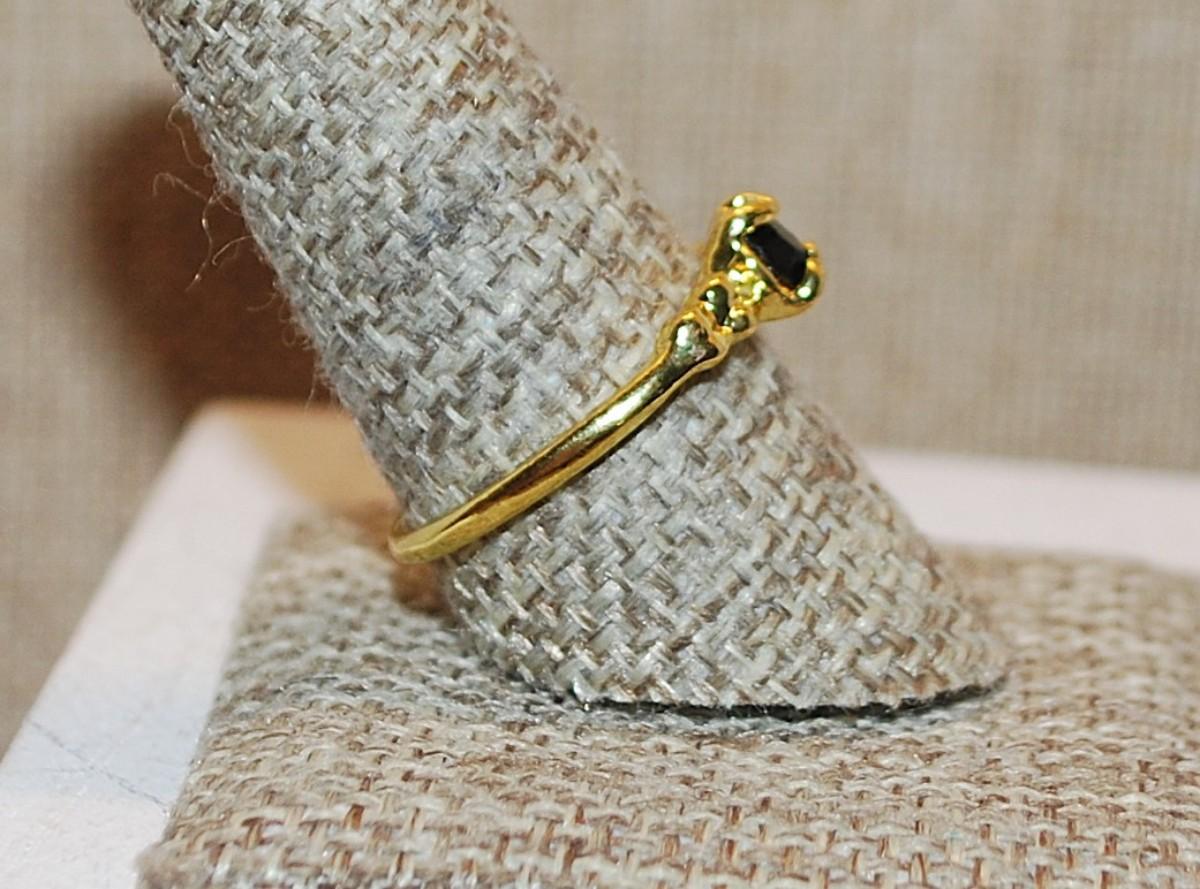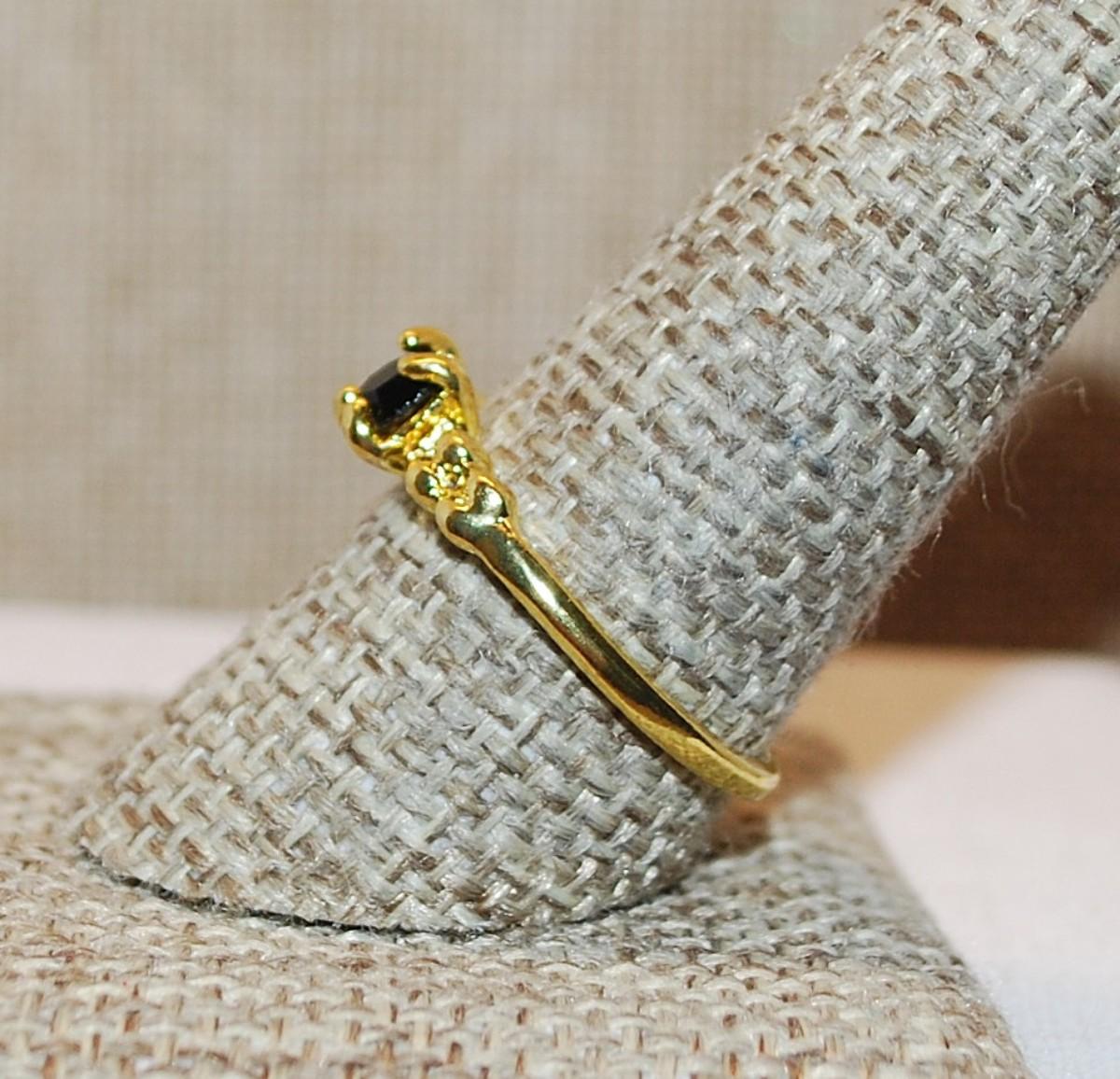 Size 9½ Round BLACK Stone 4 Prong Ring with Side Globe Accents on a Bright Gold Tone Band (2.1g)
