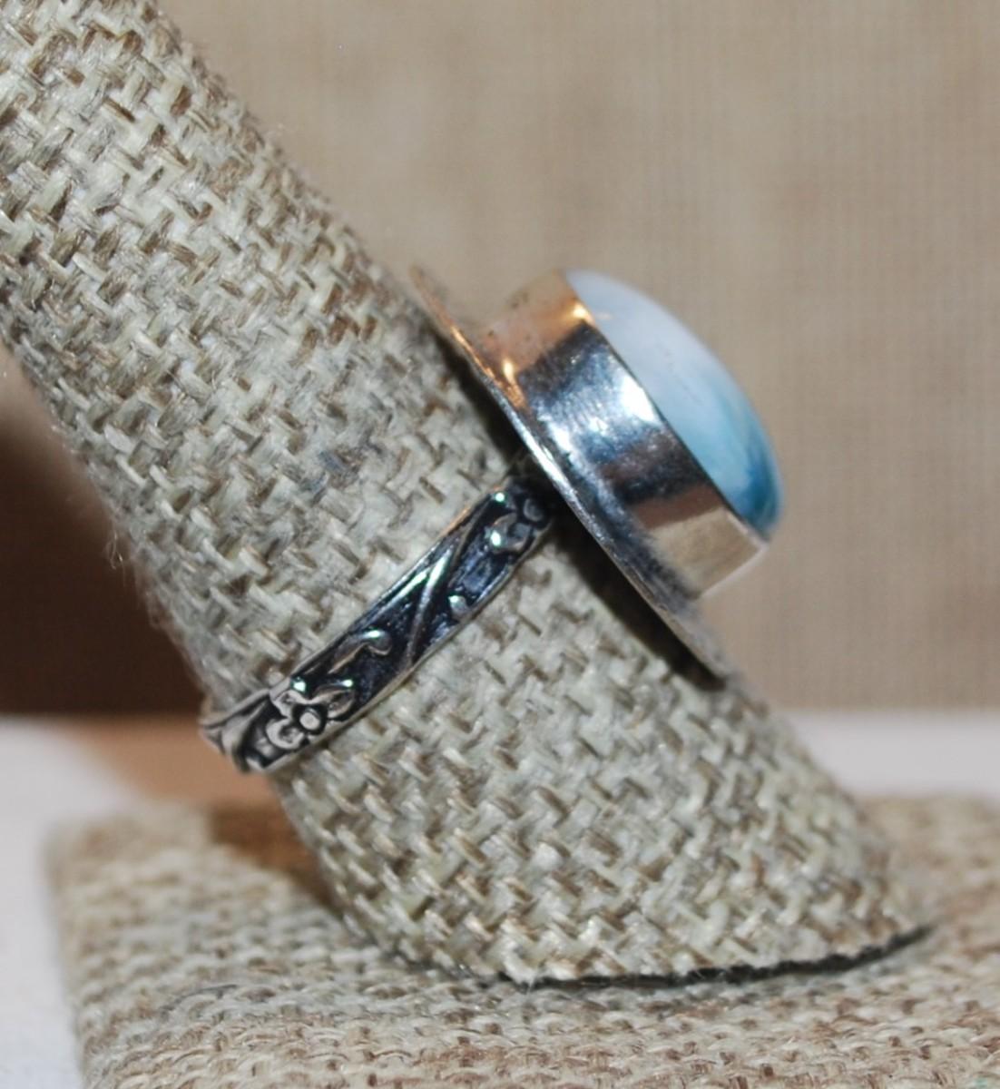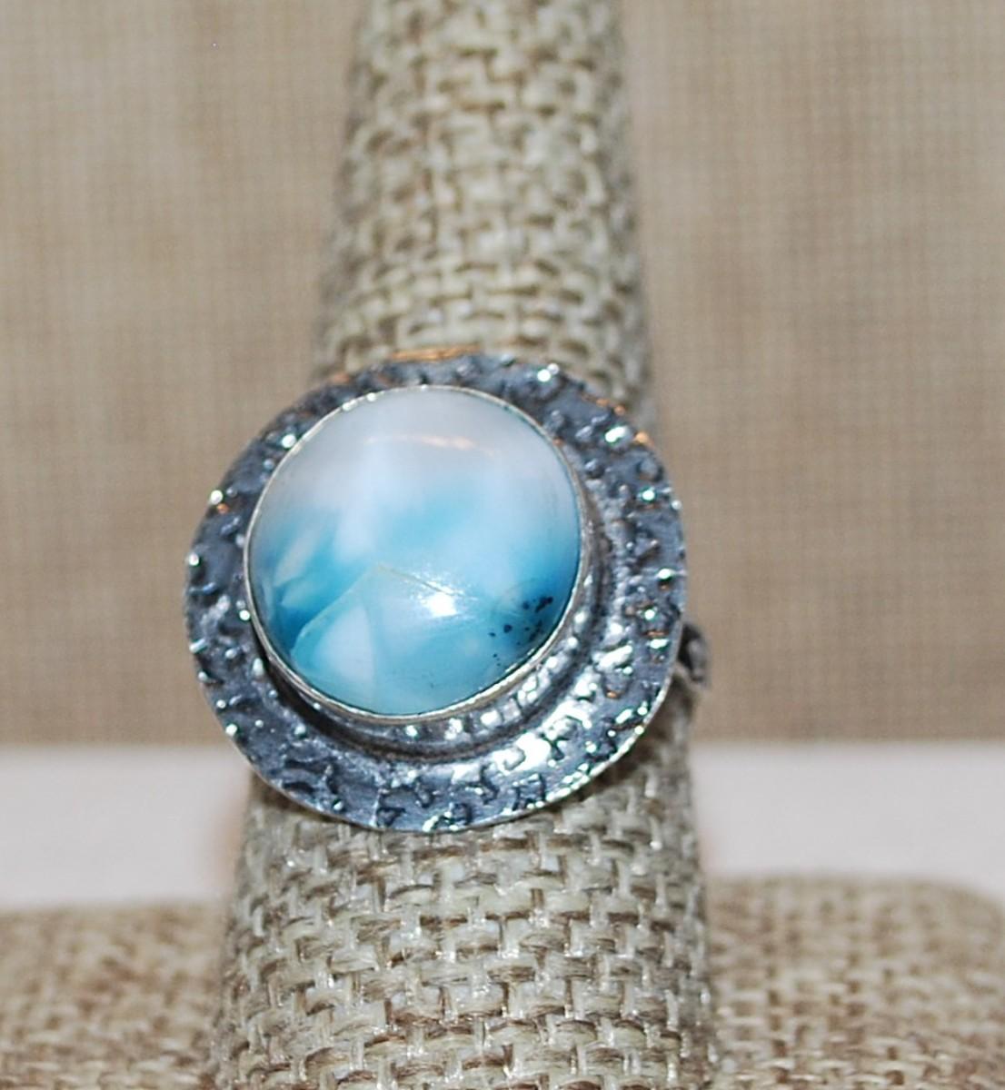 Size 9 Round SKY BLUES CABOCHON Gemstone Ring with Full Flat Surround on a Decorative Silver Tone Band (6.5g)