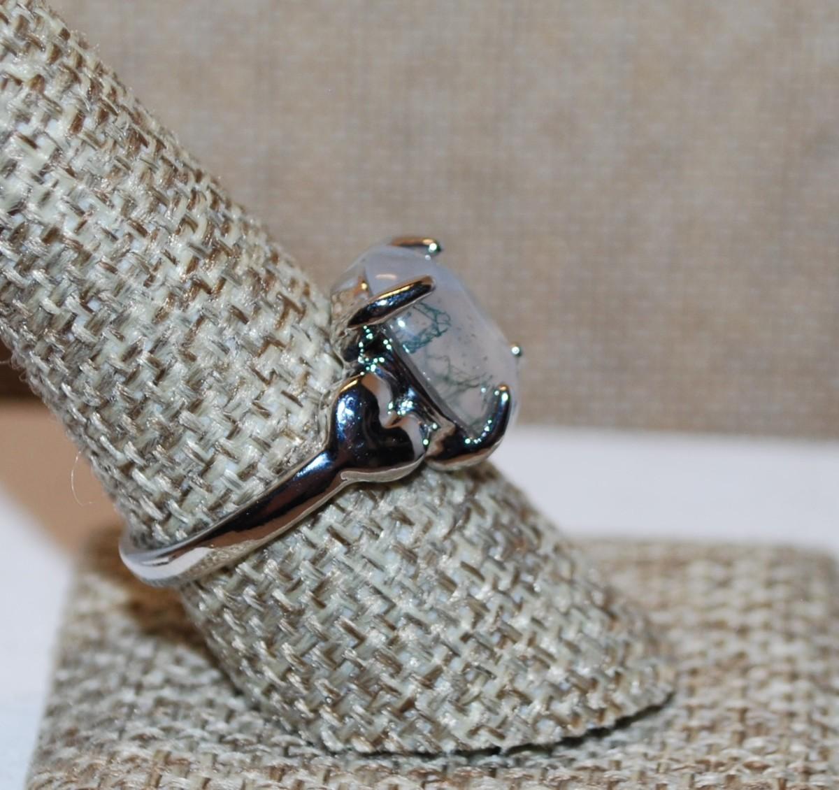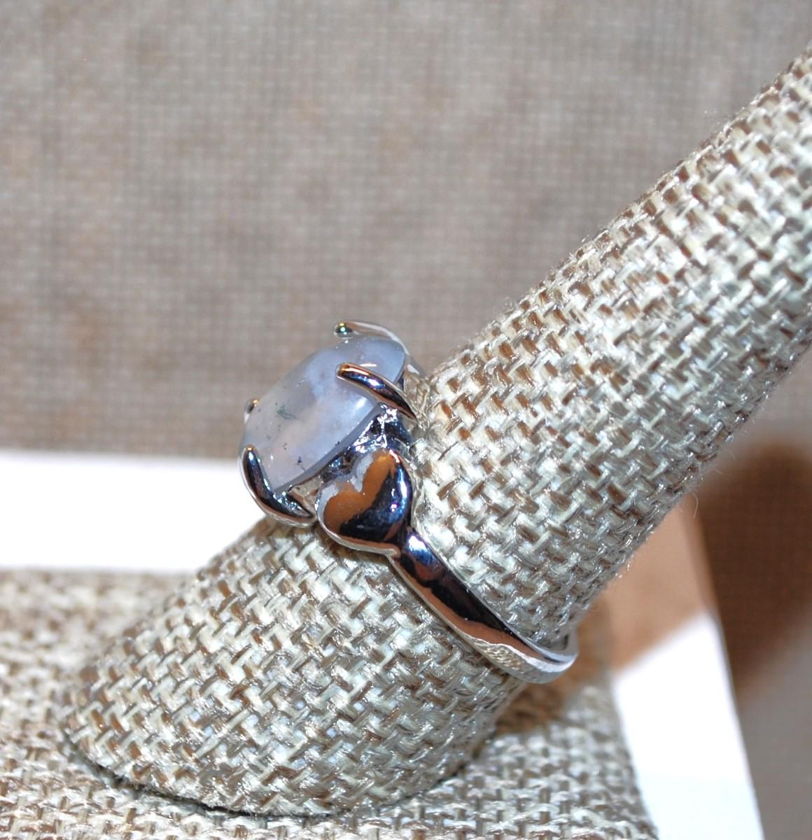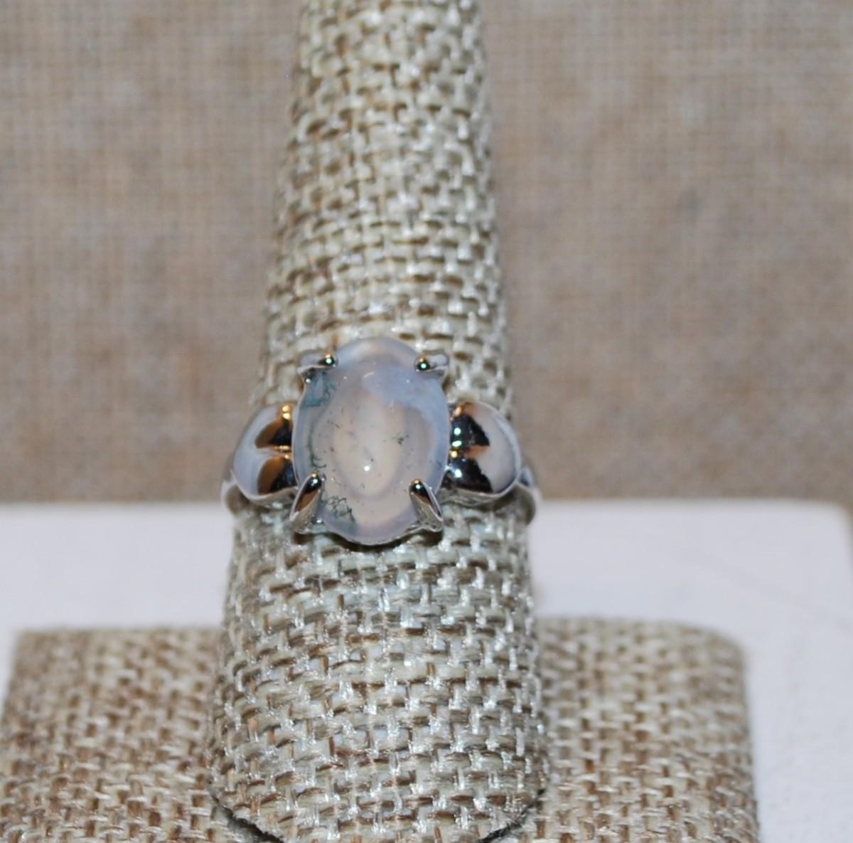 Size 9 Semi-Opaque White Quartz Stone Ring with Hearts as Side Accents on a Silver Tone Band (4.1g)