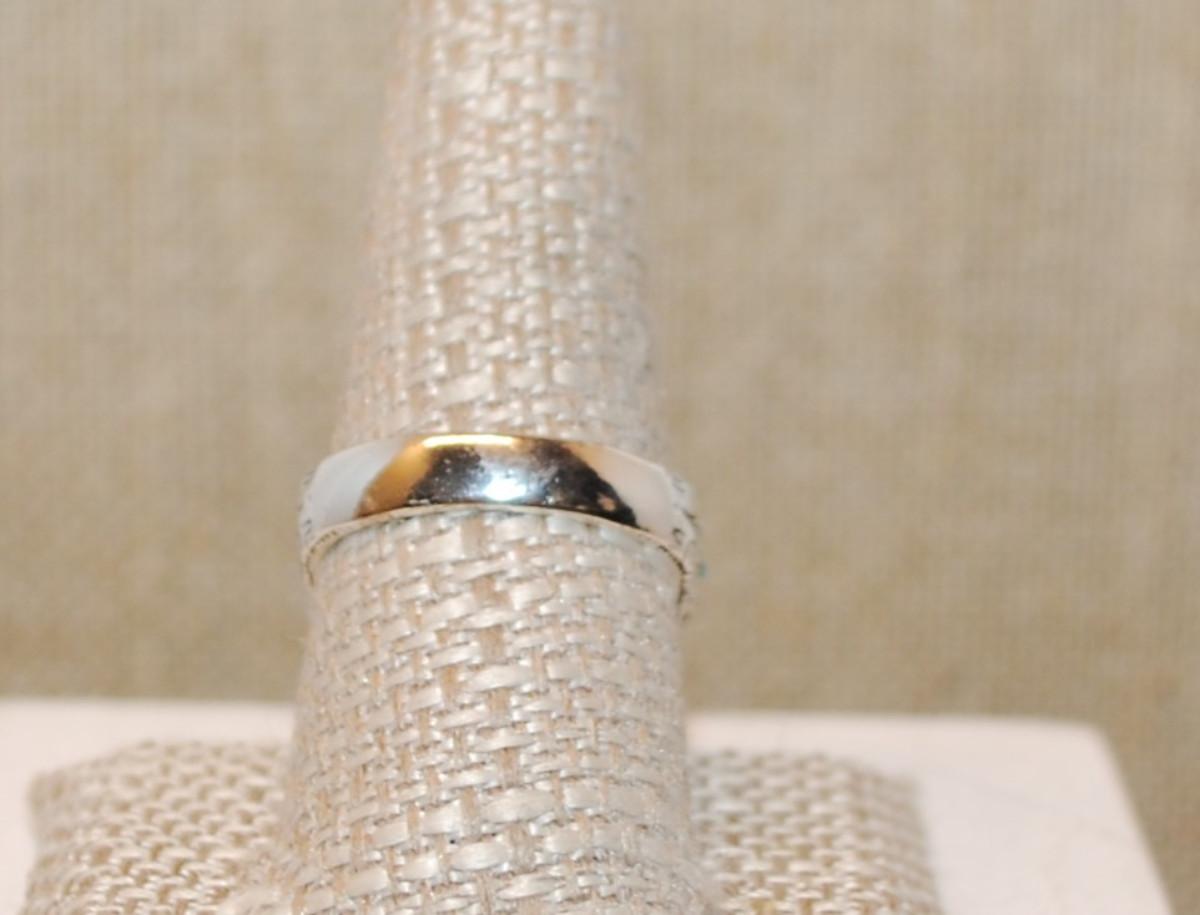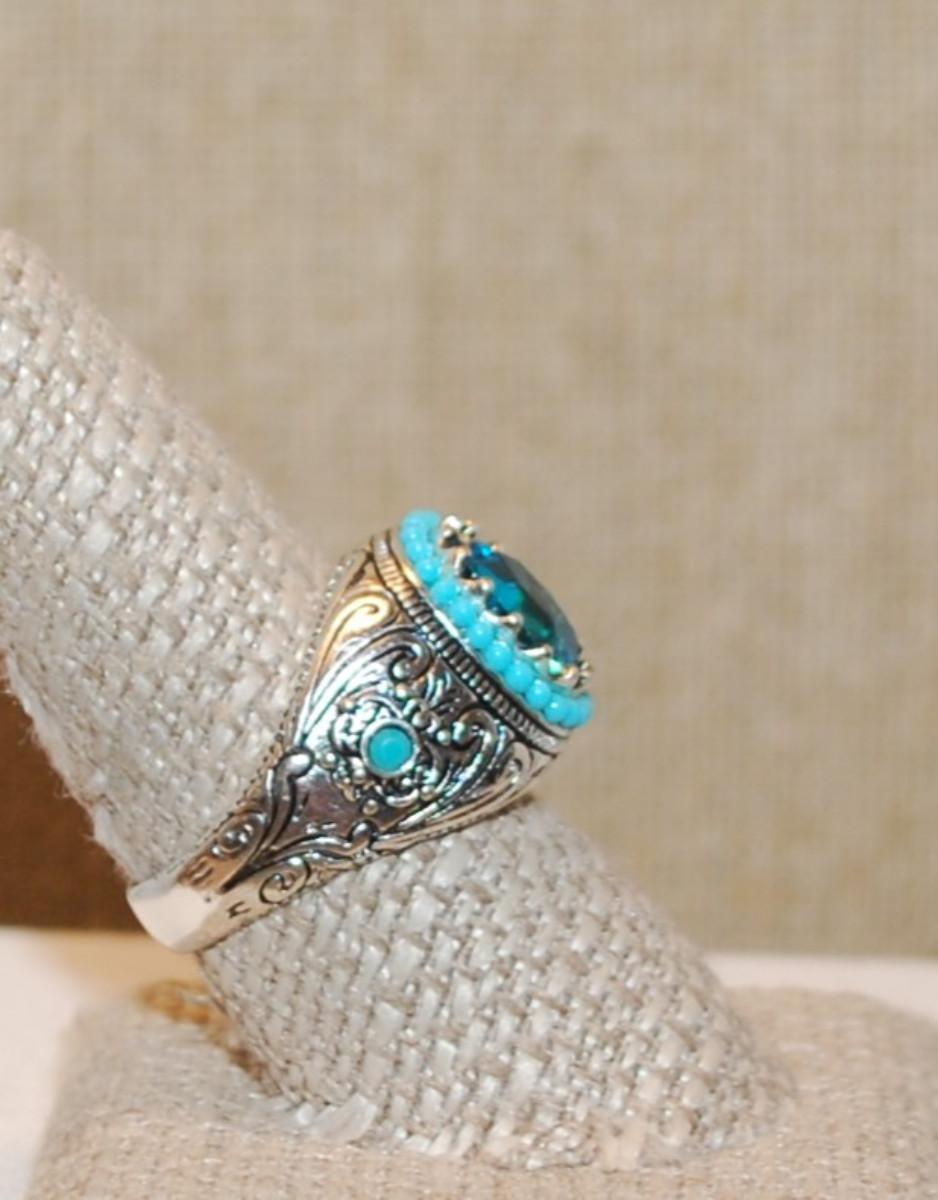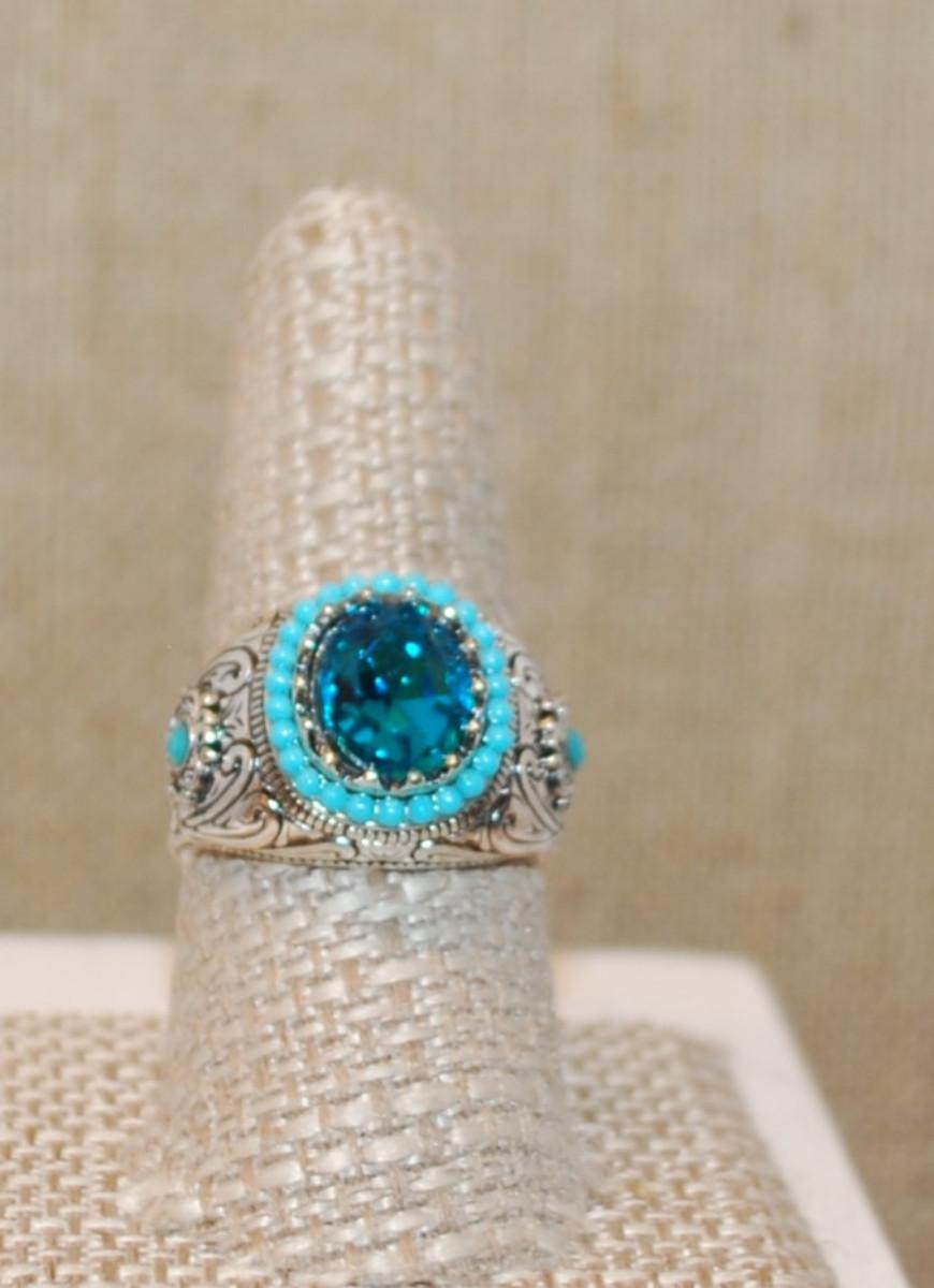 Size 9 Southwestern Style Ring with a Blue Main Stone and Light Blue Bead Surround on a Silver Tone Band (7.5g)