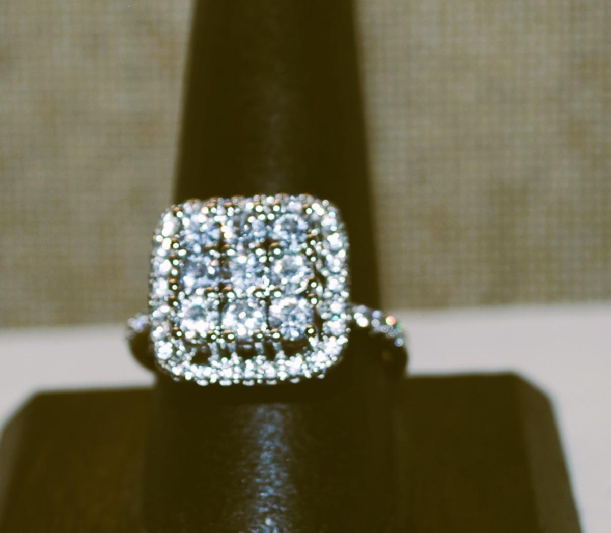 Size 9¼ Square Basket Setting Ring with 9 Center Stones and More Clear Accents on a Silver Tone Band (4.8g)