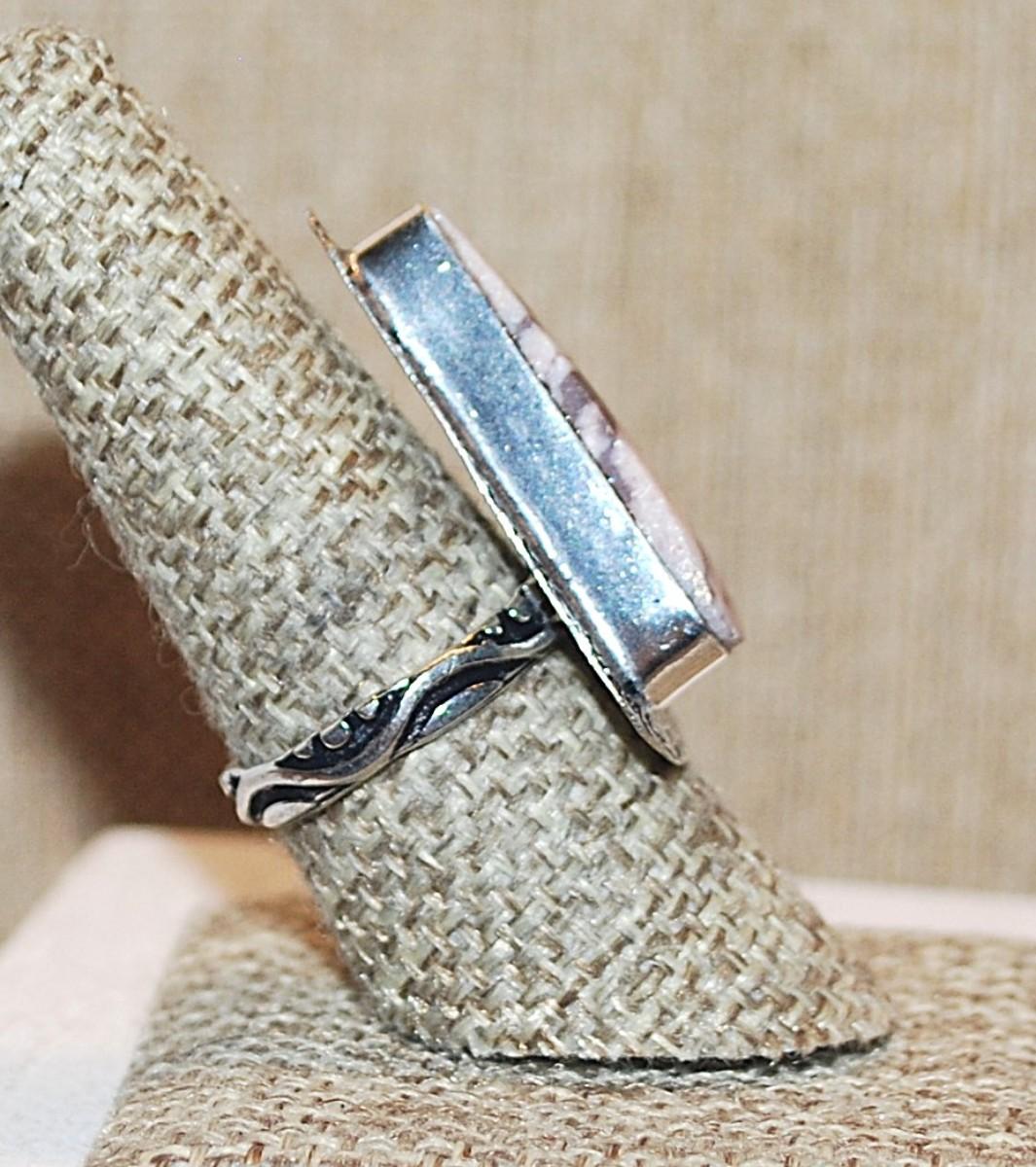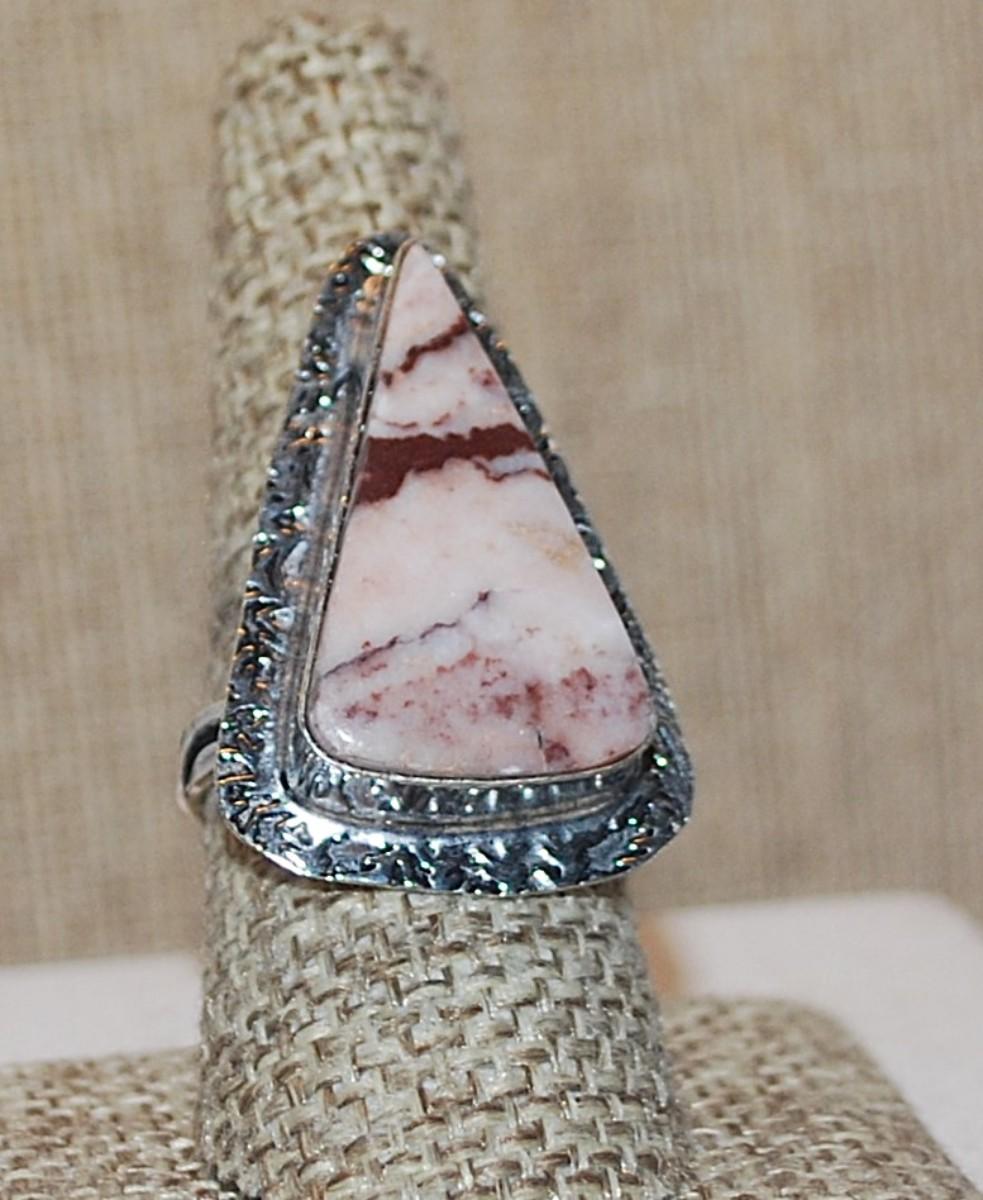 Size 9 Triangle Shape PINKS & BROWNS AGATE Gemstone Ring with Full Surround on a Silver Tone Band (7.9g)