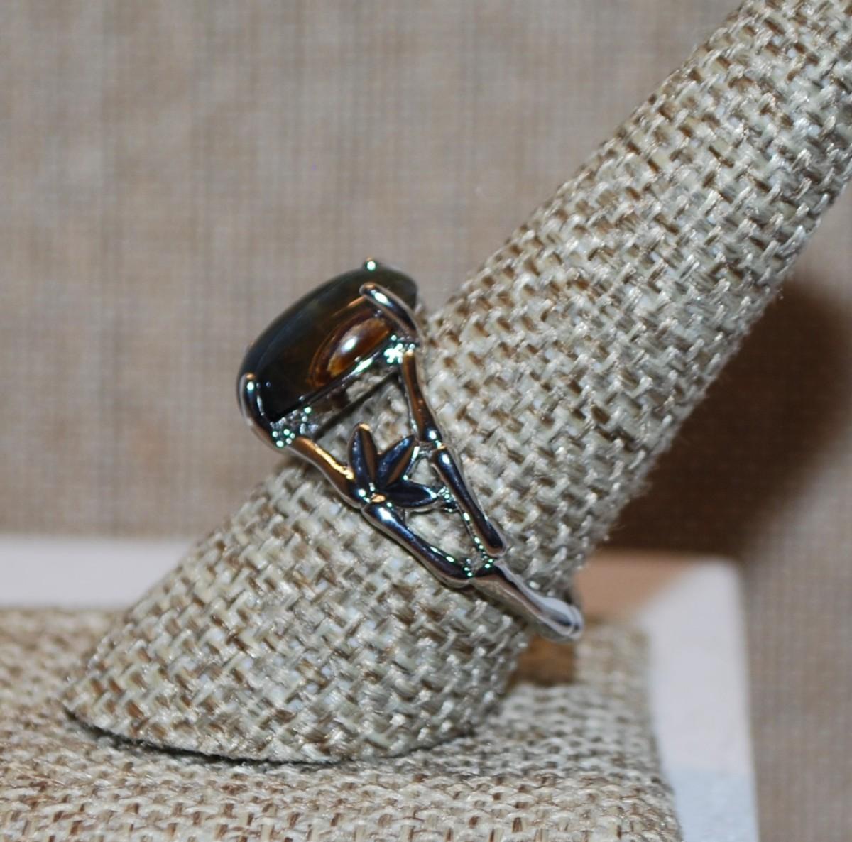 Size 9 Variegated Tiger Eye Stone Ring with 3 Petal Flower Sides on a Silver Tone Band (4.0g)
