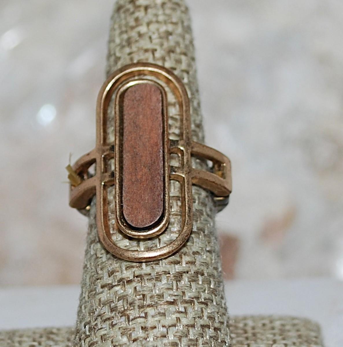 Size 9-13 Long Gold Colored Oval RING with Wooden -Style Insert on an ADJUSTABLE Accordion Band (6.5g)
