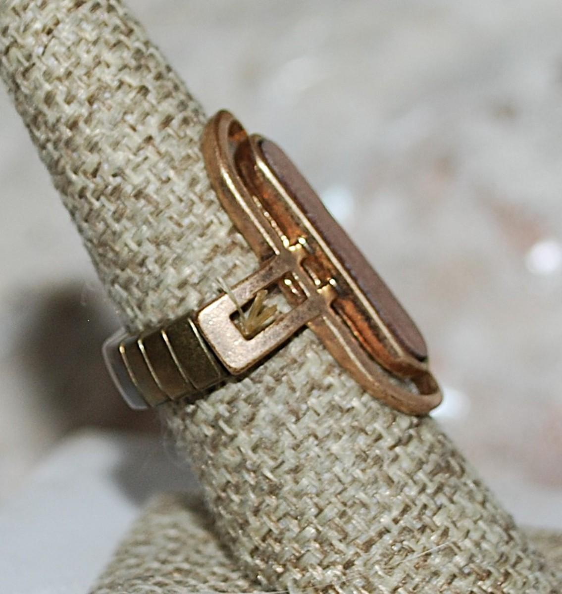 Size 9-13 Long Gold Colored Oval RING with Wooden -Style Insert on an ADJUSTABLE Accordion Band (6.5g)