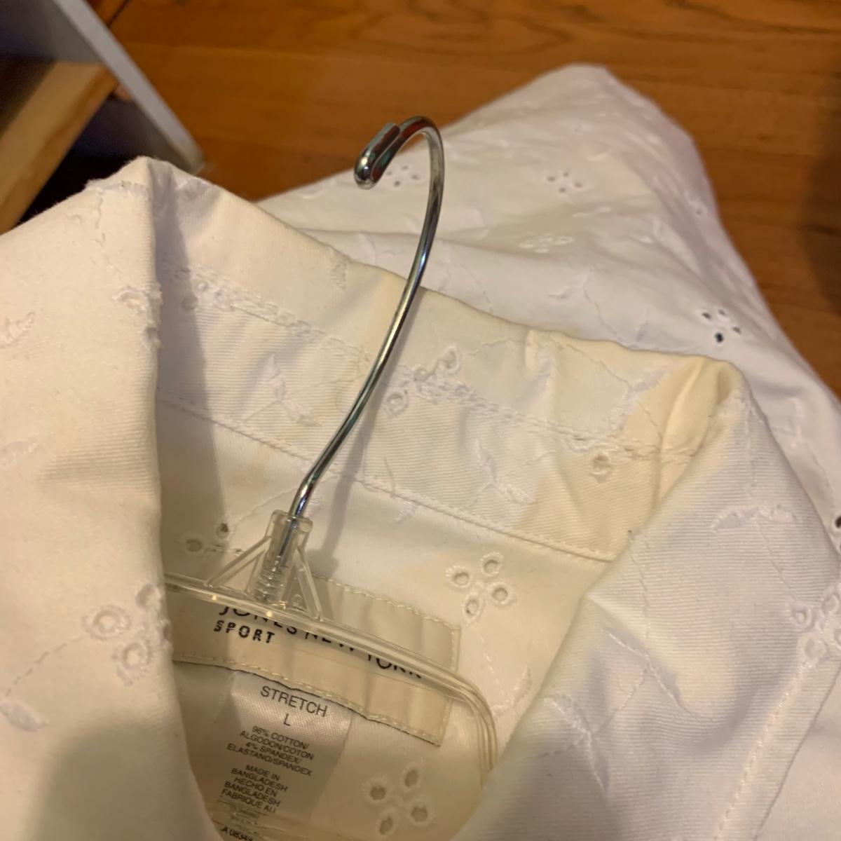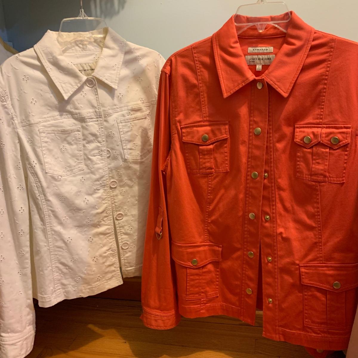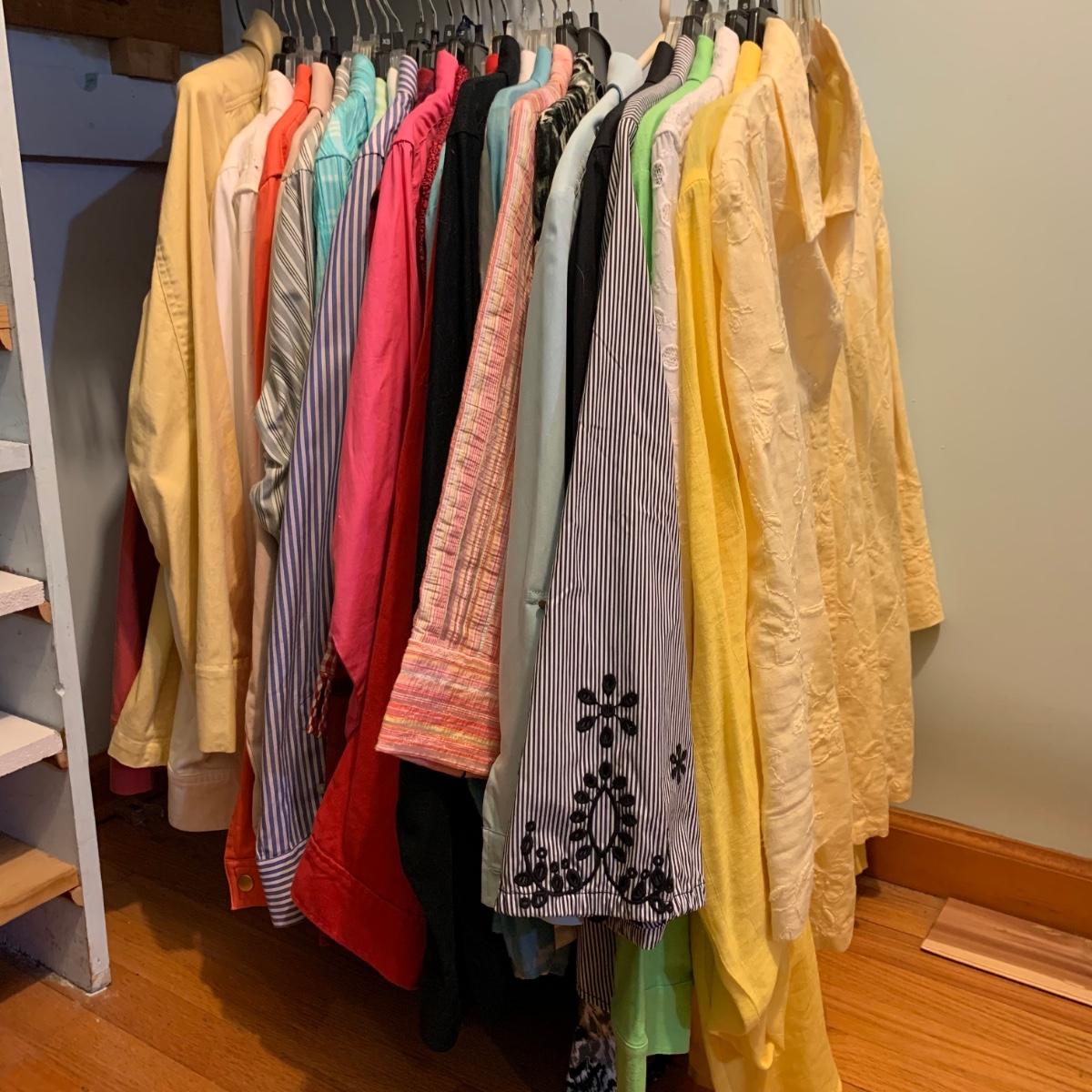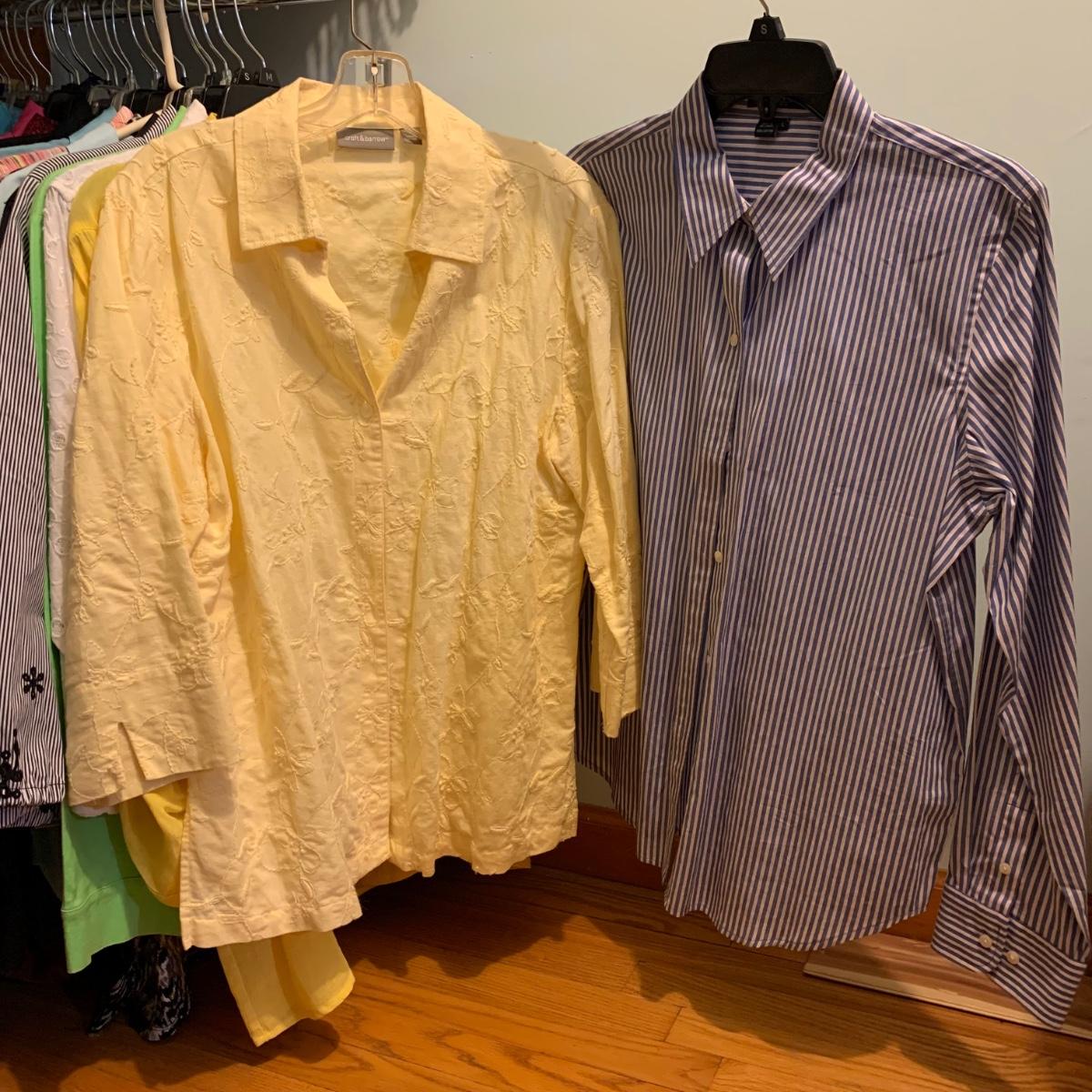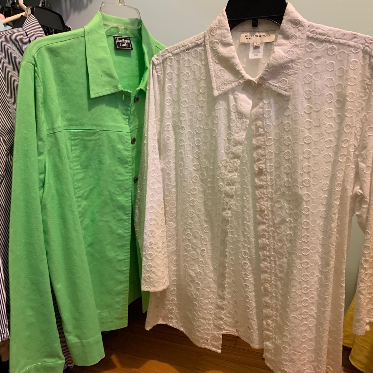 23 ladies button down tops plus six lightweight jackets. Many items are new with the tags still attached. All are size L. All items appear to be in very good condition, with the exception of some light yellow stains on the white Jones New York jacket.