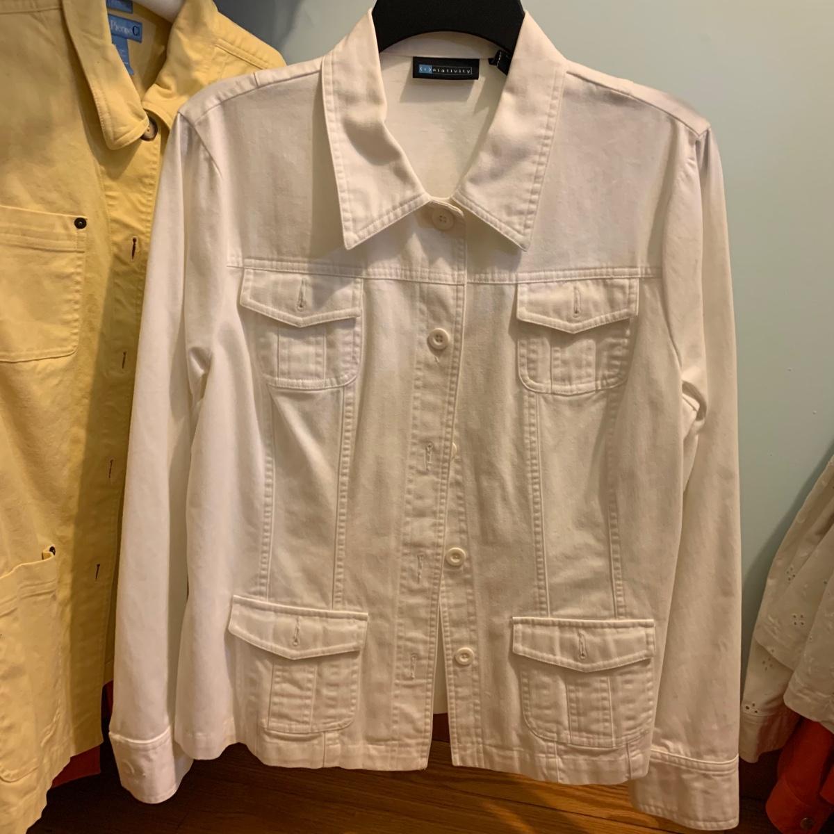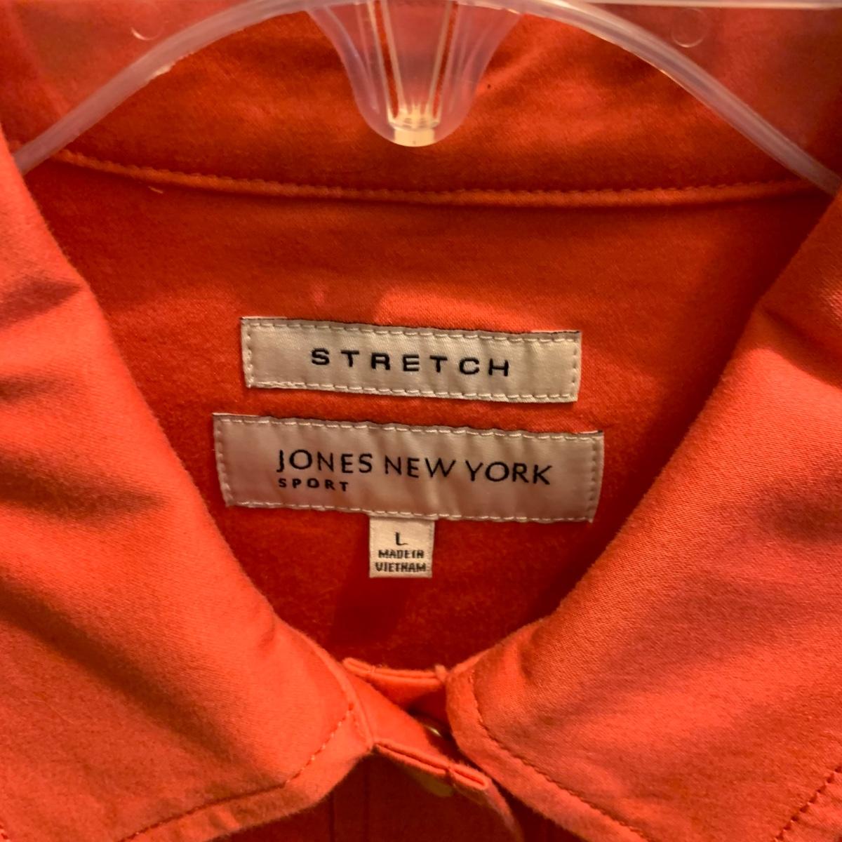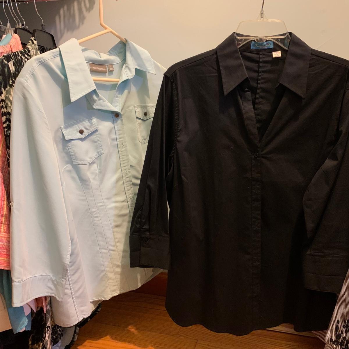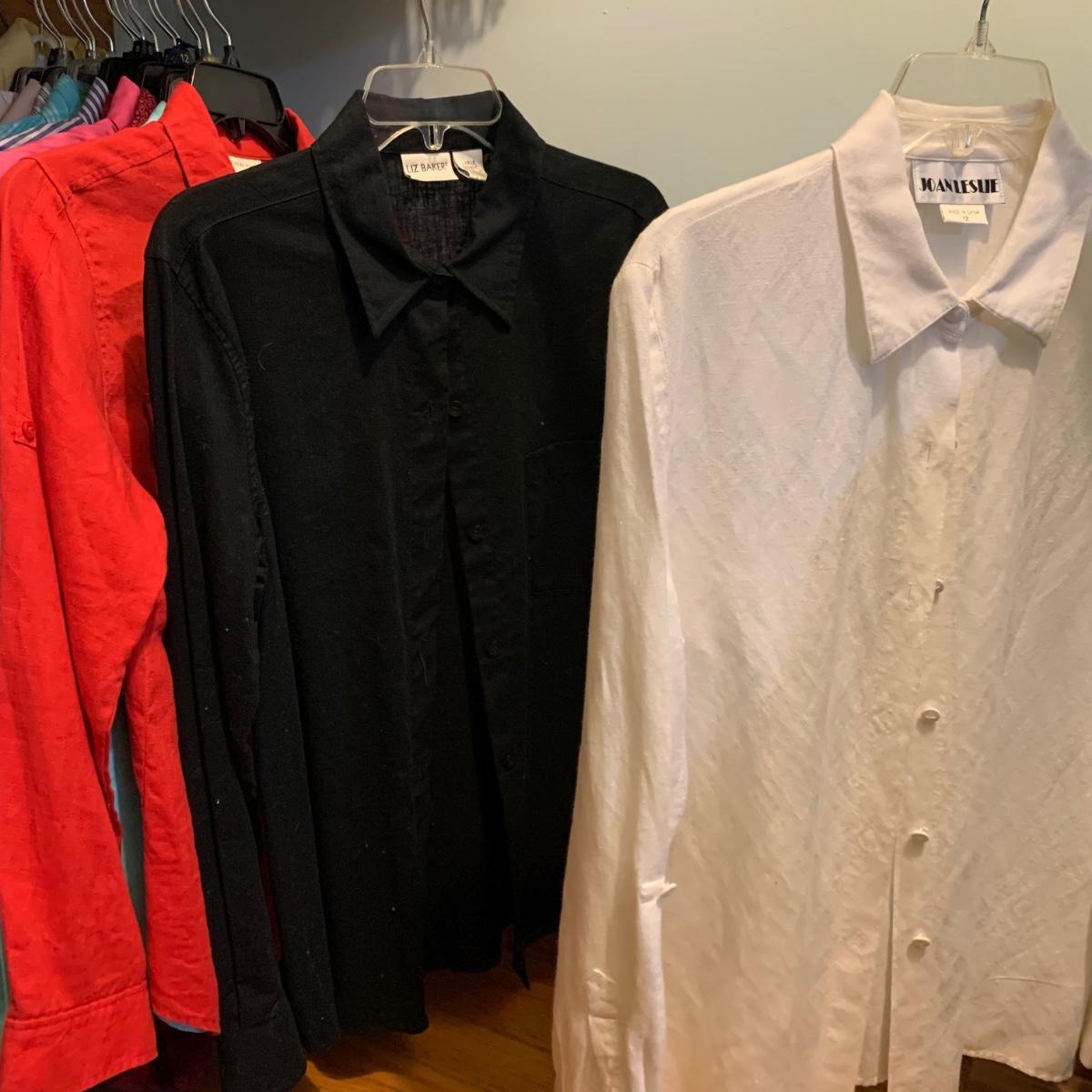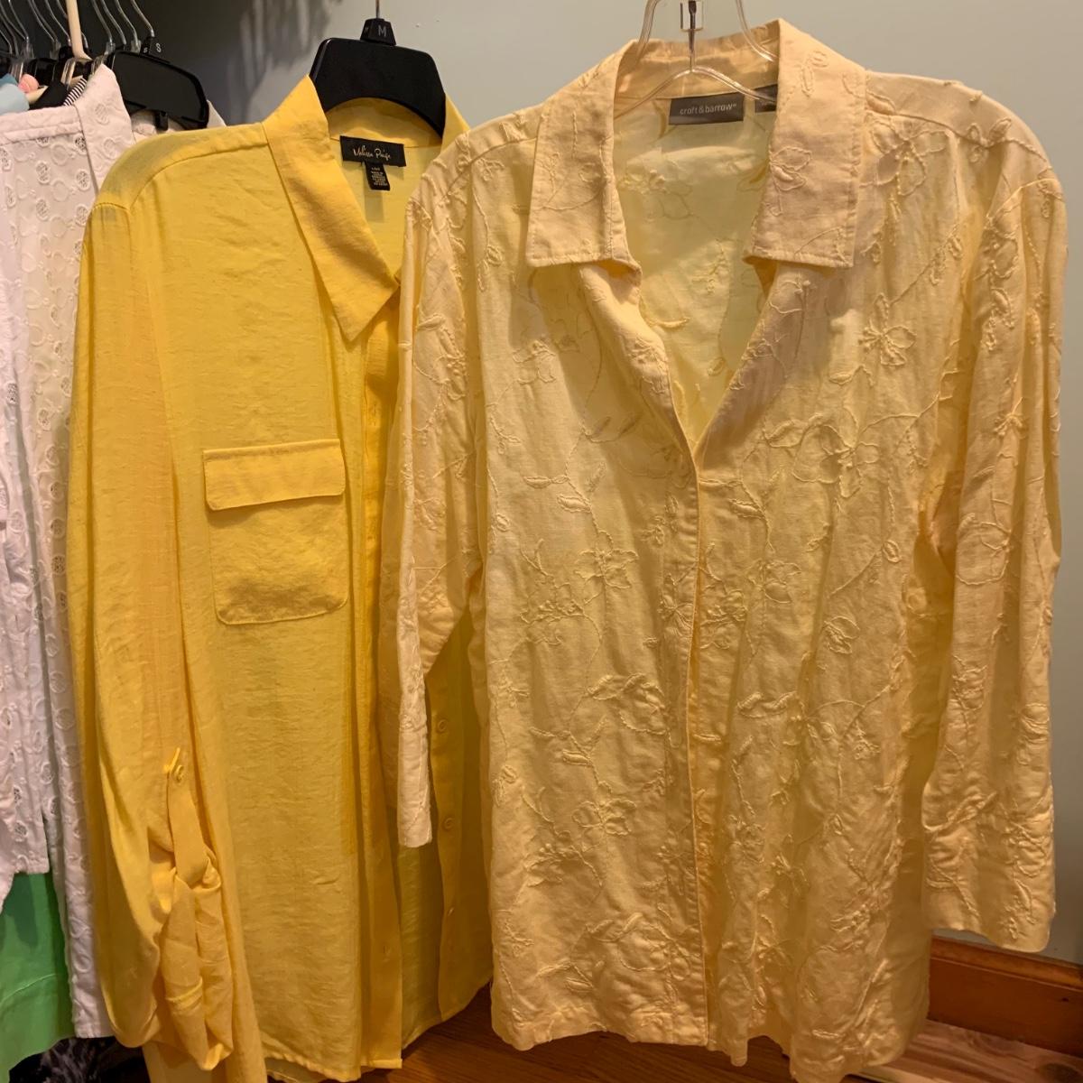 23 ladies button down tops plus six lightweight jackets. Many items are new with the tags still attached. All are size L. All items appear to be in very good condition, with the exception of some light yellow stains on the white Jones New York jacket.