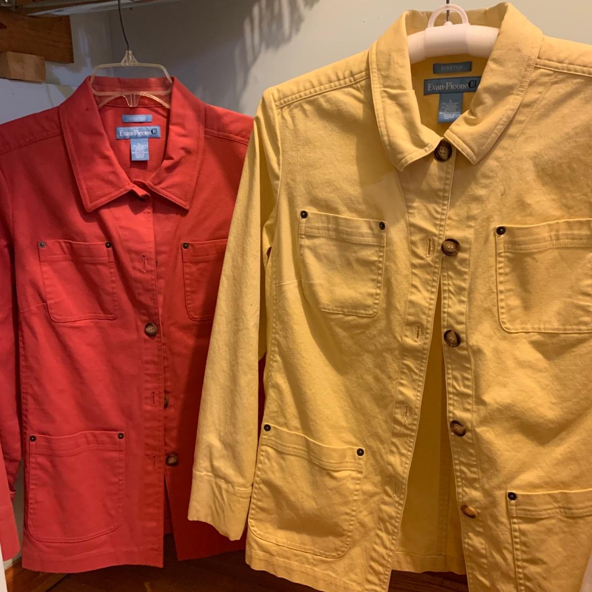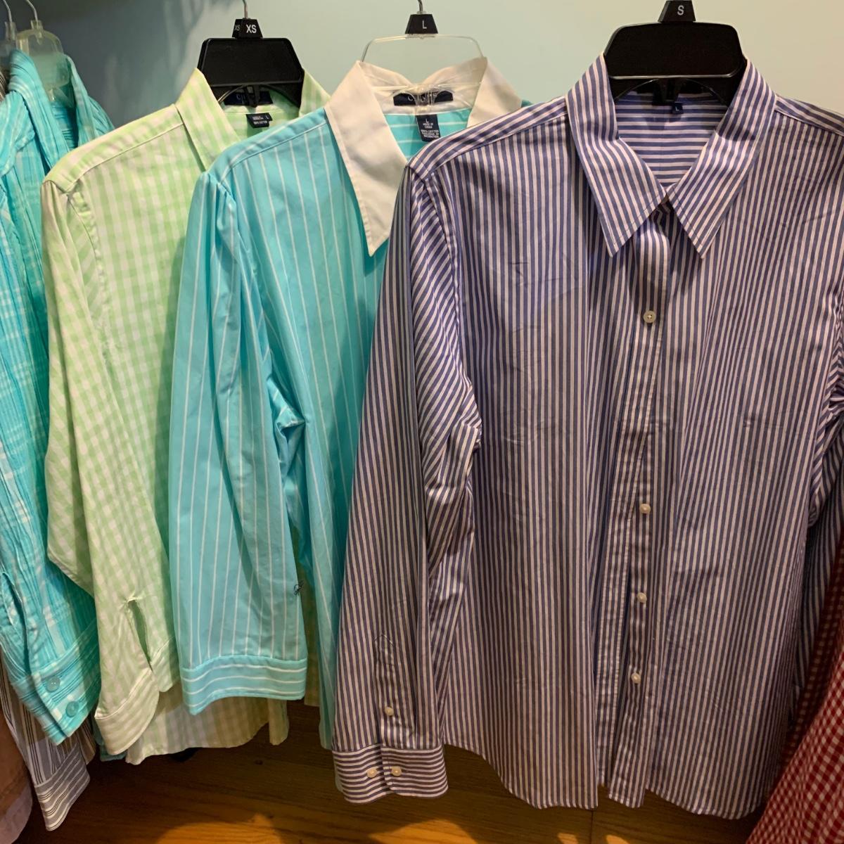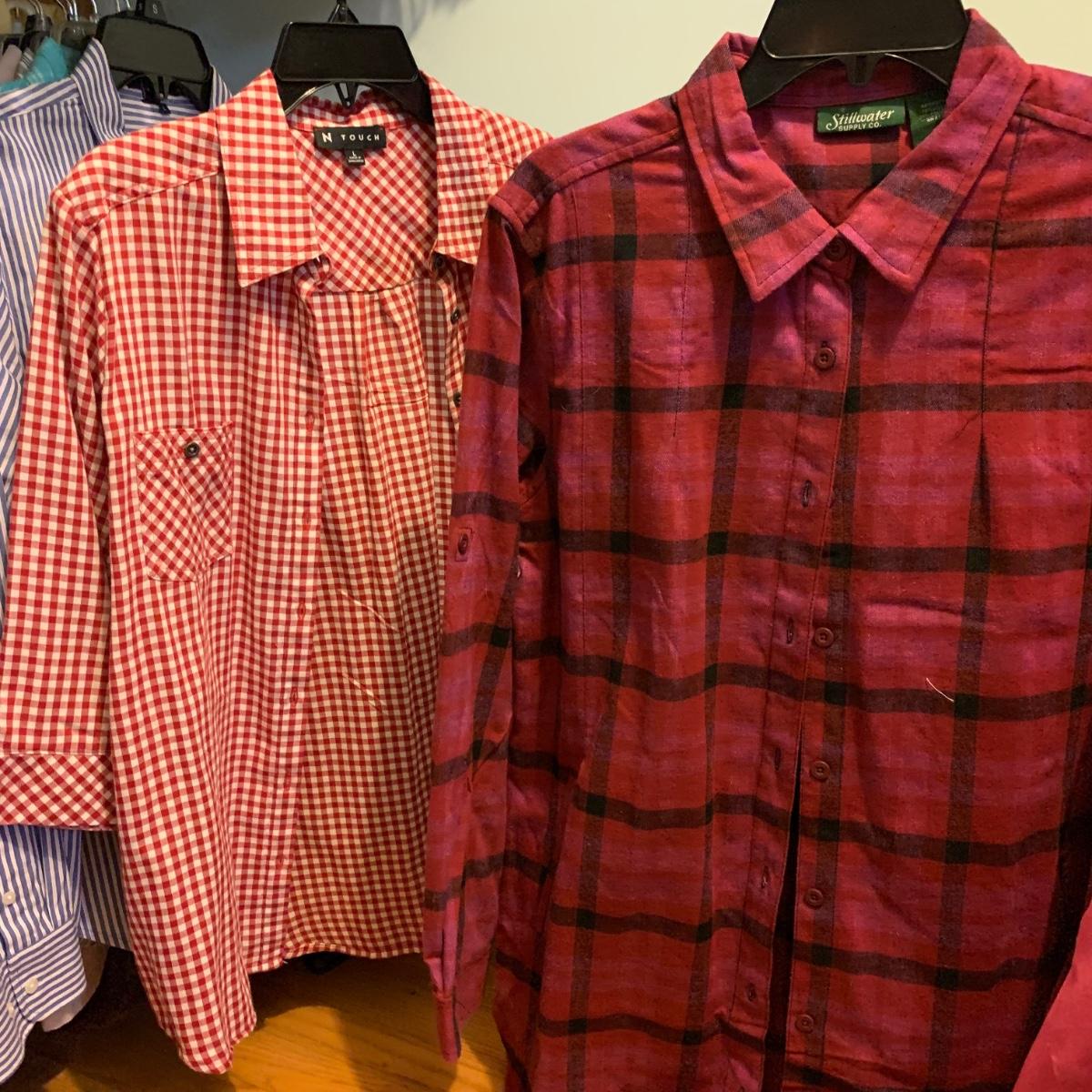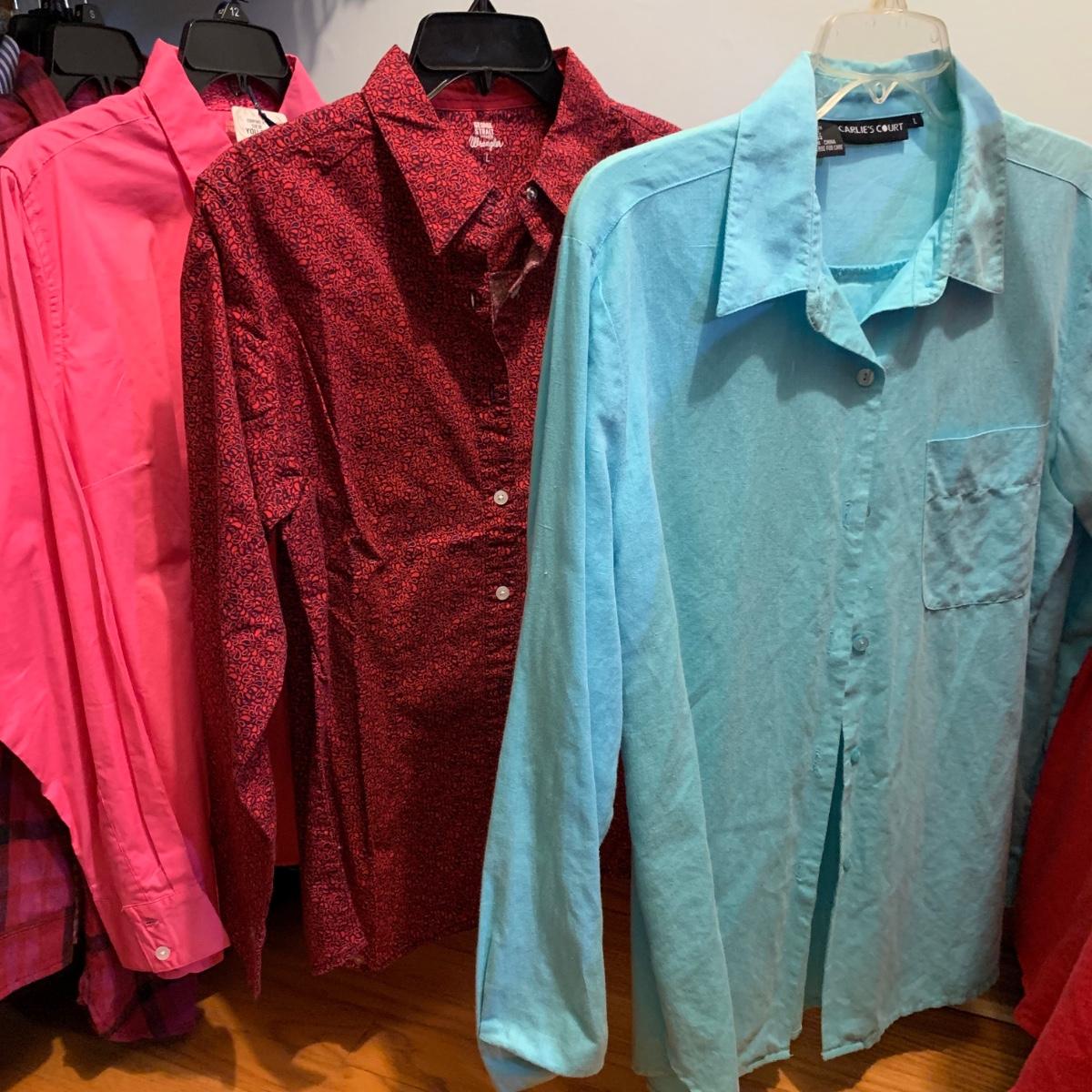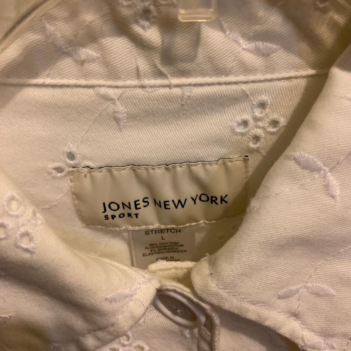 23 ladies button down tops plus six lightweight jackets. Many items are new with the tags still attached. All are size L. All items appear to be in very good condition, with the exception of some light yellow stains on the white Jones New York jacket.