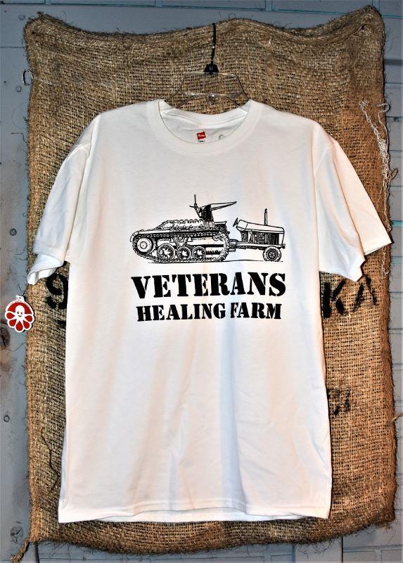 Bright White Veterans Healing Farm T-Shirts These Hanes Tagless T-shirts are made of 100% pre-shrunk cotton. The VHF Tractor Logo is depicted in black on the front face and a modern US Flag is on the back. Wear this to show your support of not only the Veterans Healing Farm but all US Veterans living and those lost. These shirts are long-wearing and comfortable for both men and women.