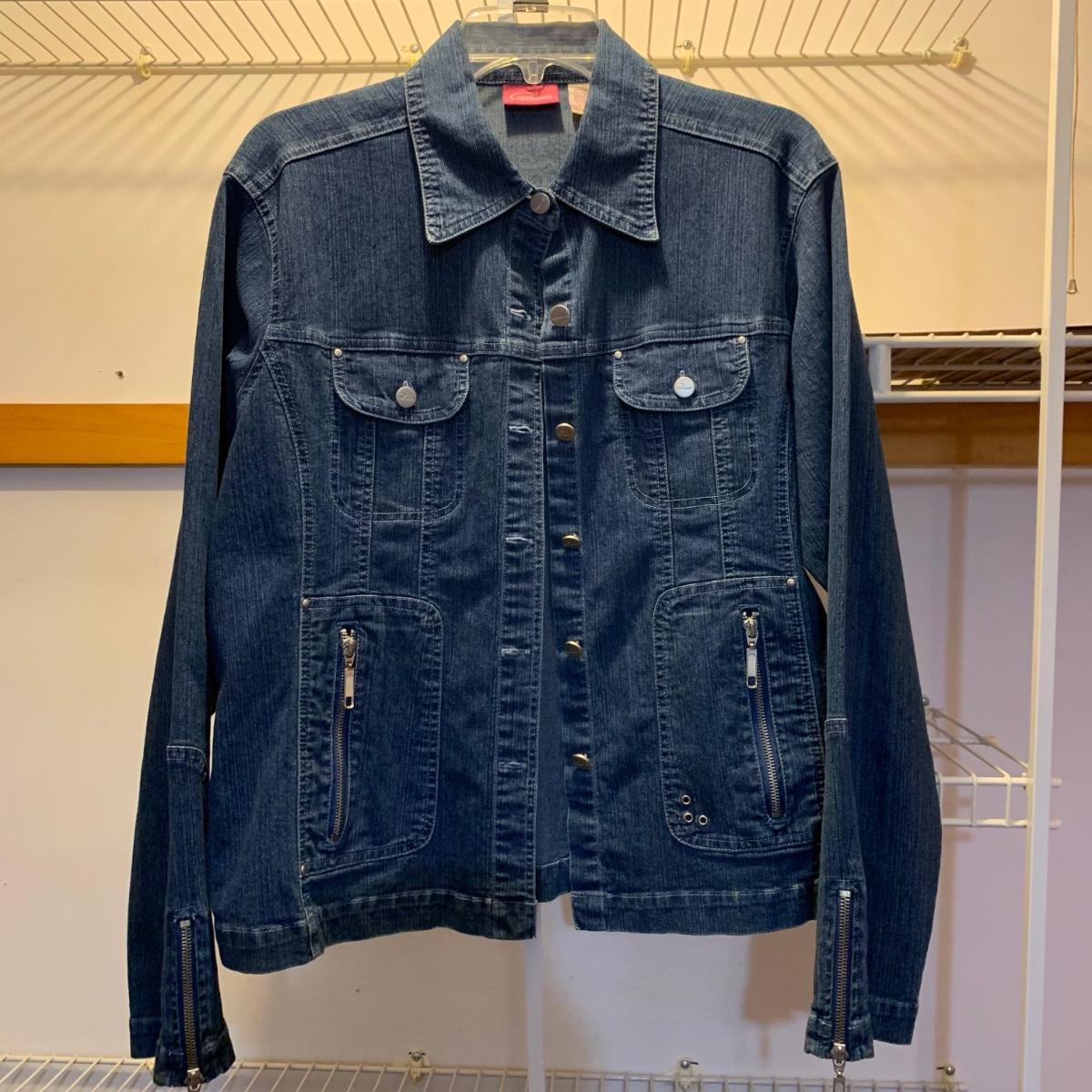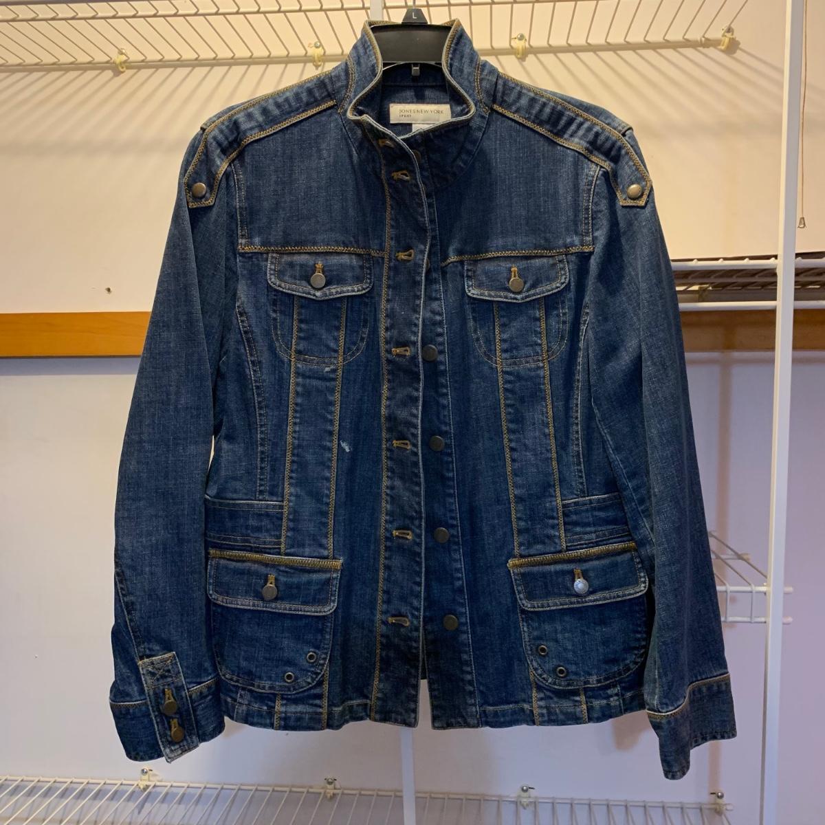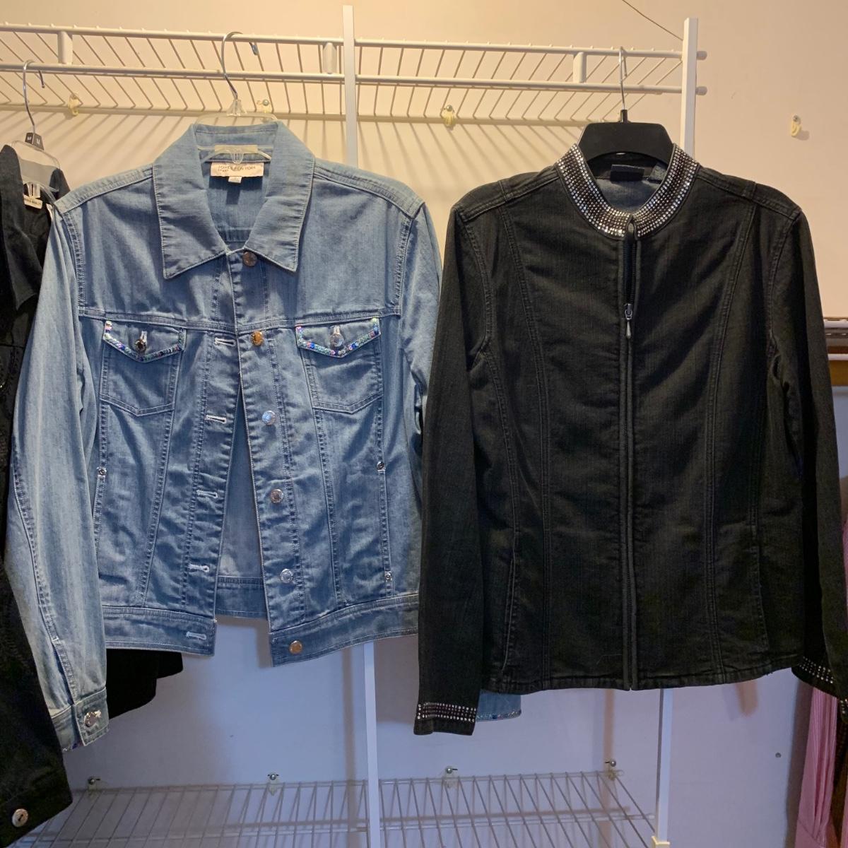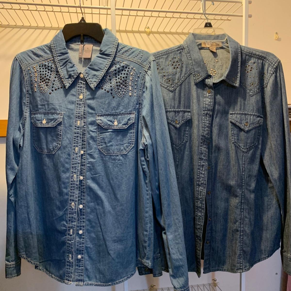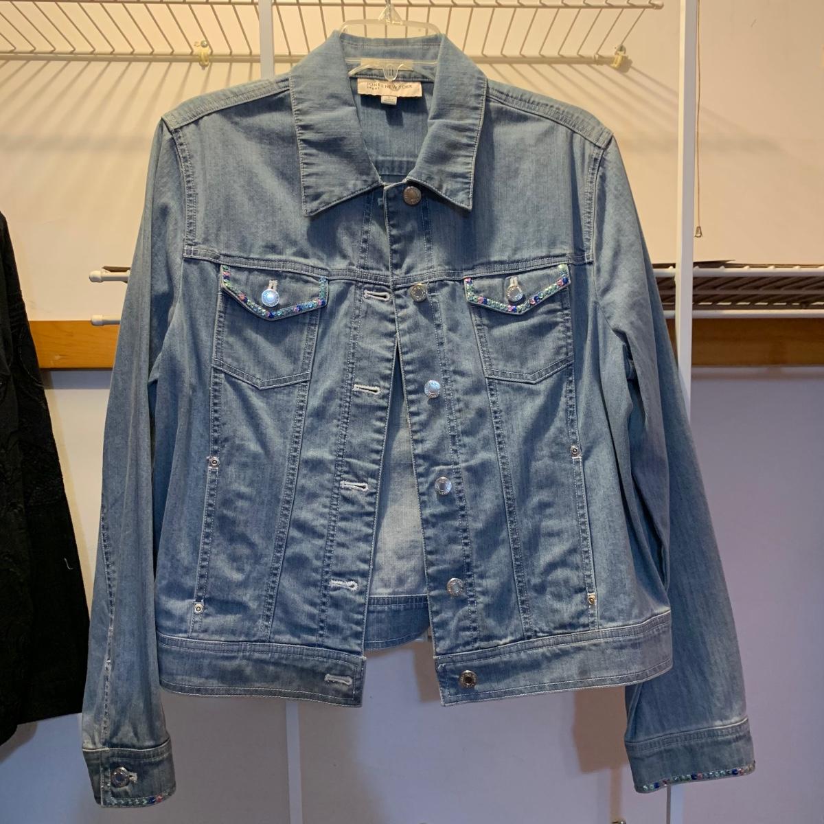 Thirteen denim shirts and jackets. Most have some bling and most are size L, with a couple size M. Most of the items are in very good condition. There’s some light staining on the sequined Jones New York jacket and what appears to be a small paint stain on the dark blue Jones New York jacket. Please see photos for all sizes and brand names.