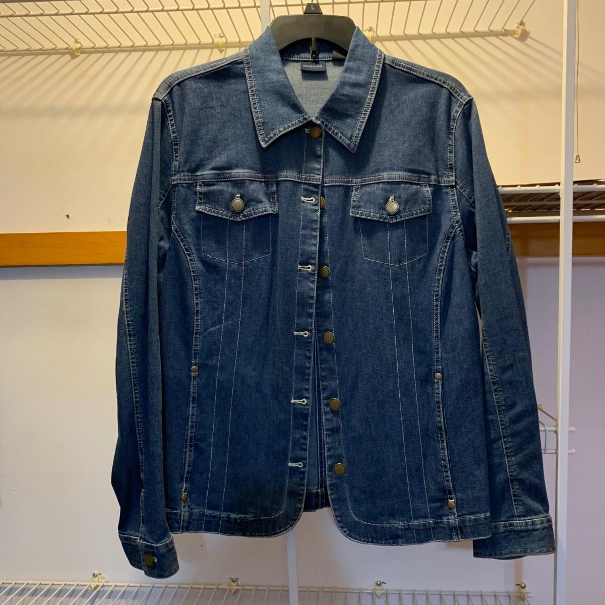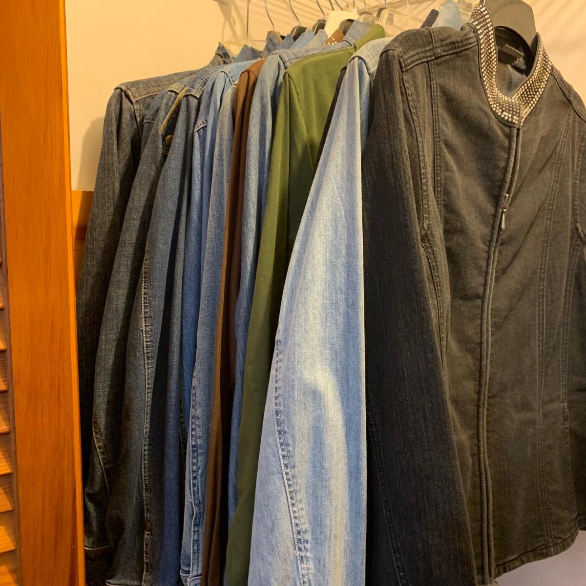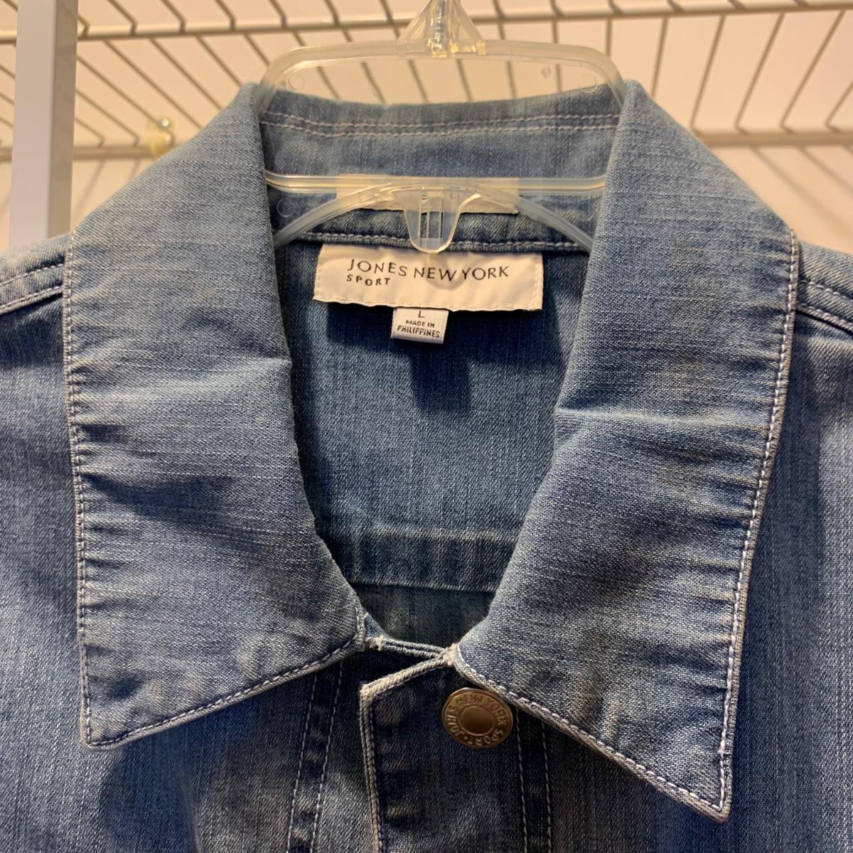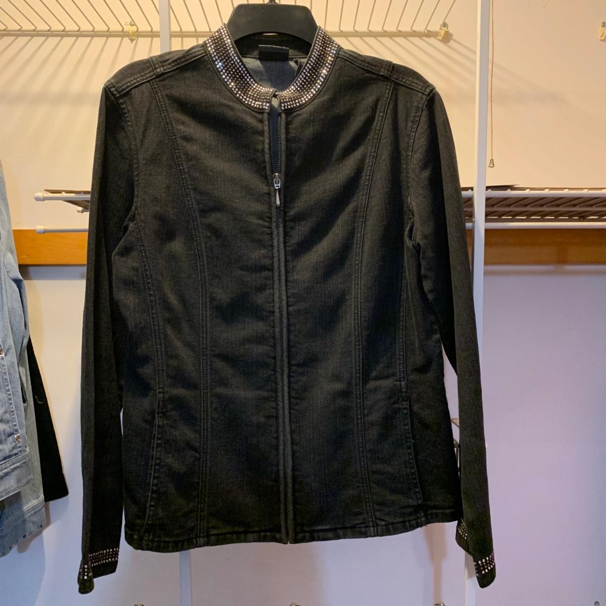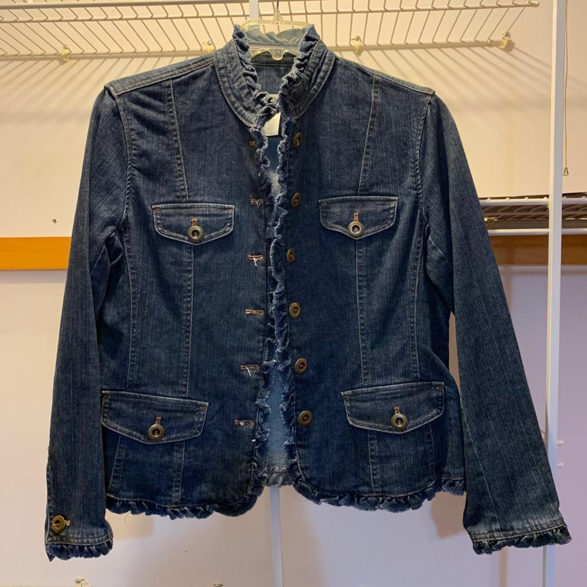 Thirteen denim shirts and jackets. Most have some bling and most are size L, with a couple size M. Most of the items are in very good condition. There’s some light staining on the sequined Jones New York jacket and what appears to be a small paint stain on the dark blue Jones New York jacket. Please see photos for all sizes and brand names.