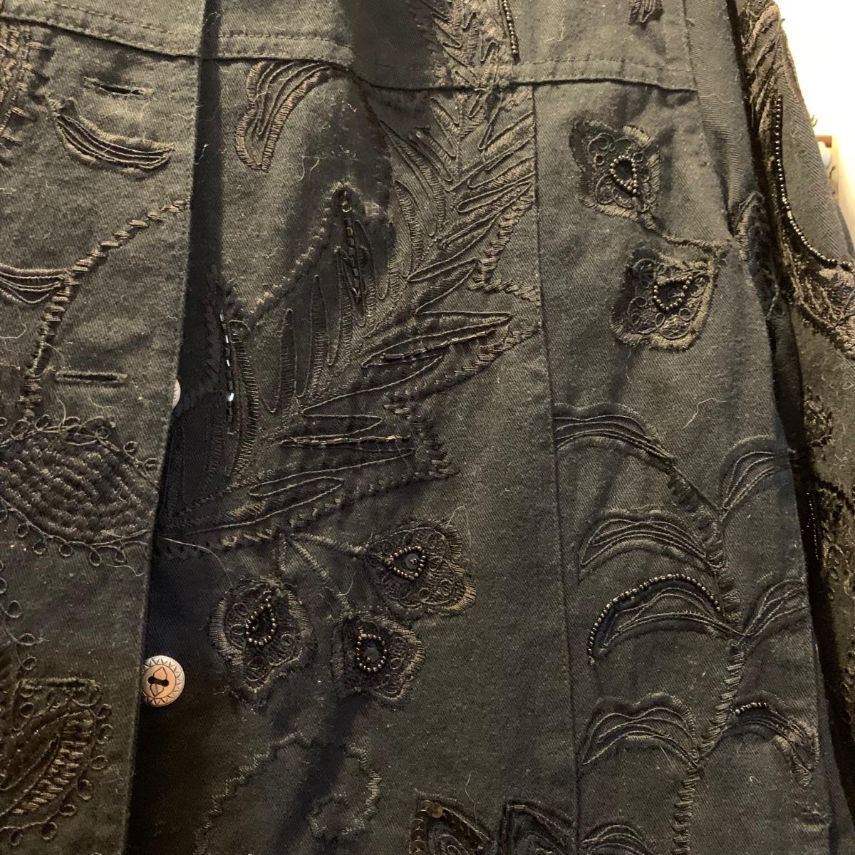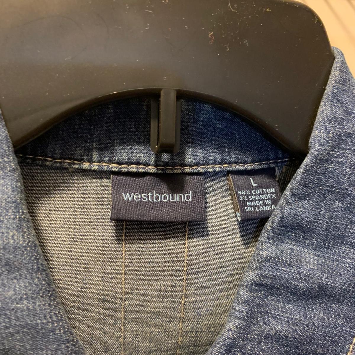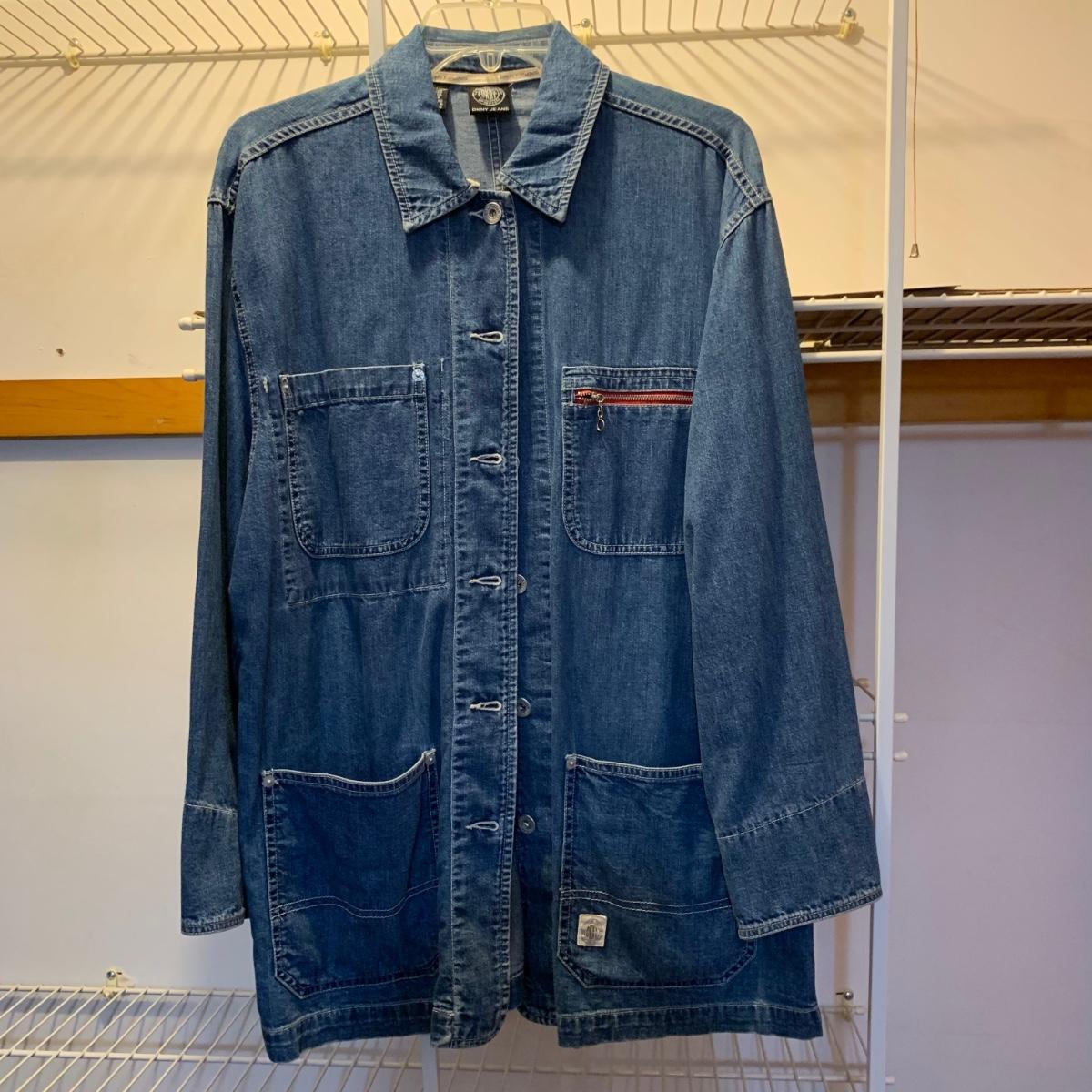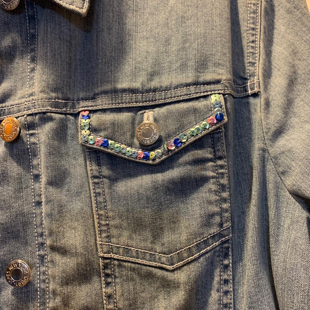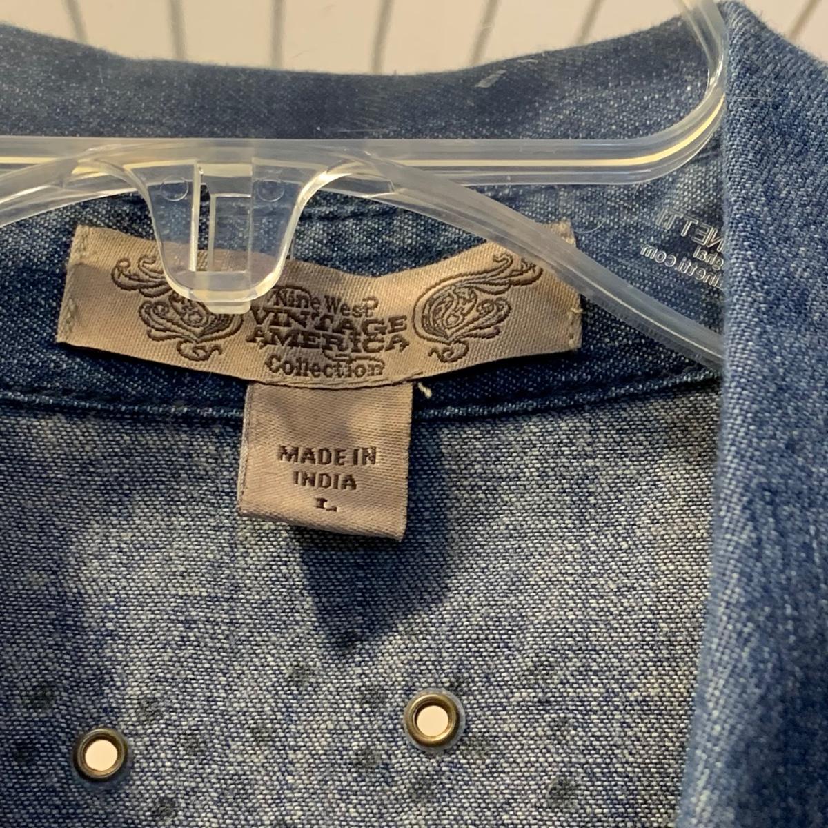 Thirteen denim shirts and jackets. Most have some bling and most are size L, with a couple size M. Most of the items are in very good condition. There’s some light staining on the sequined Jones New York jacket and what appears to be a small paint stain on the dark blue Jones New York jacket. Please see photos for all sizes and brand names.