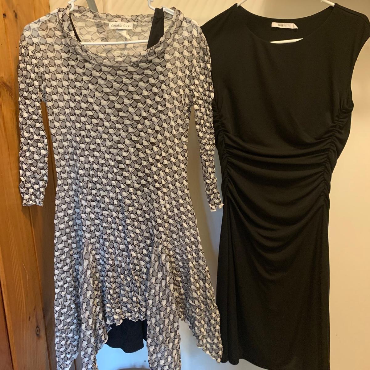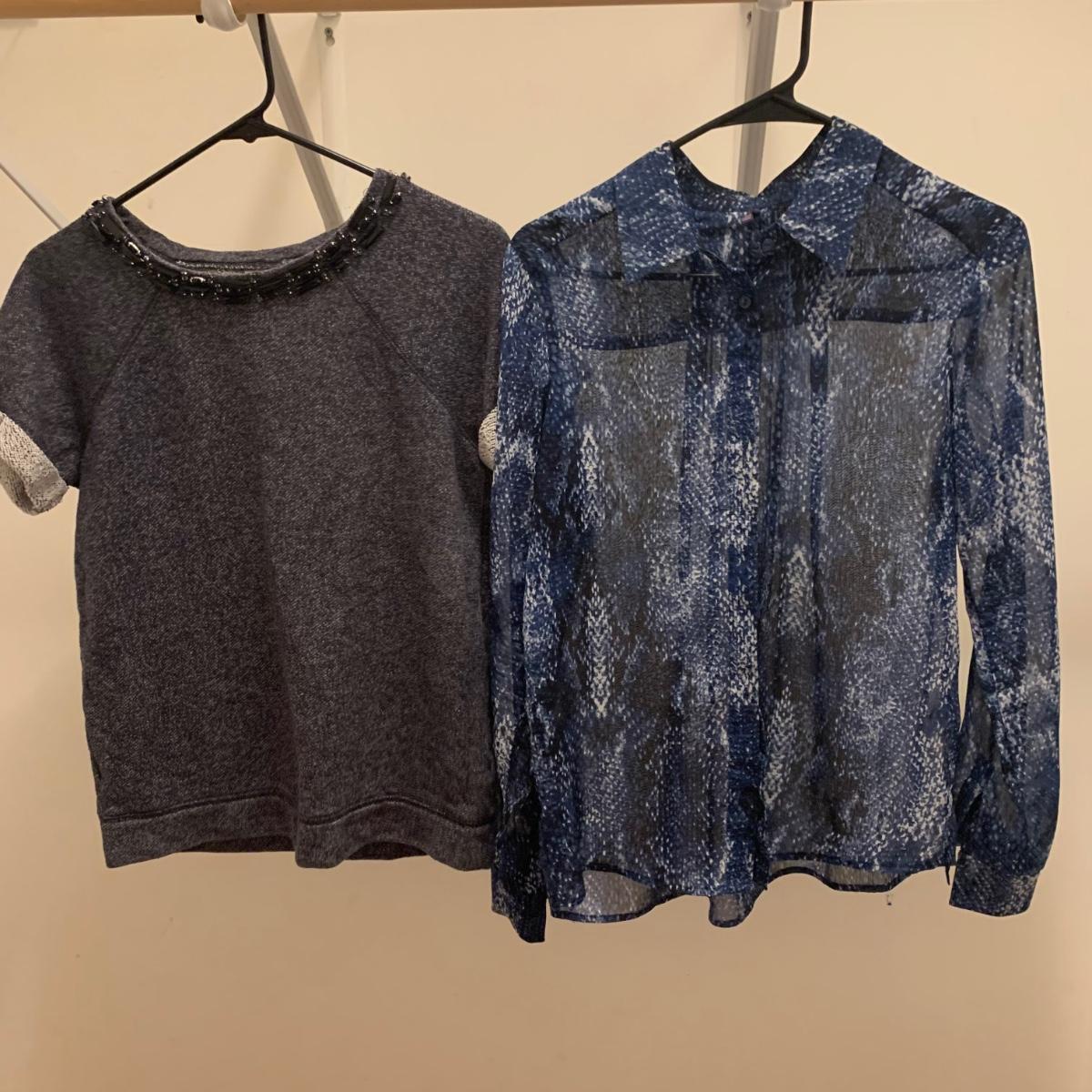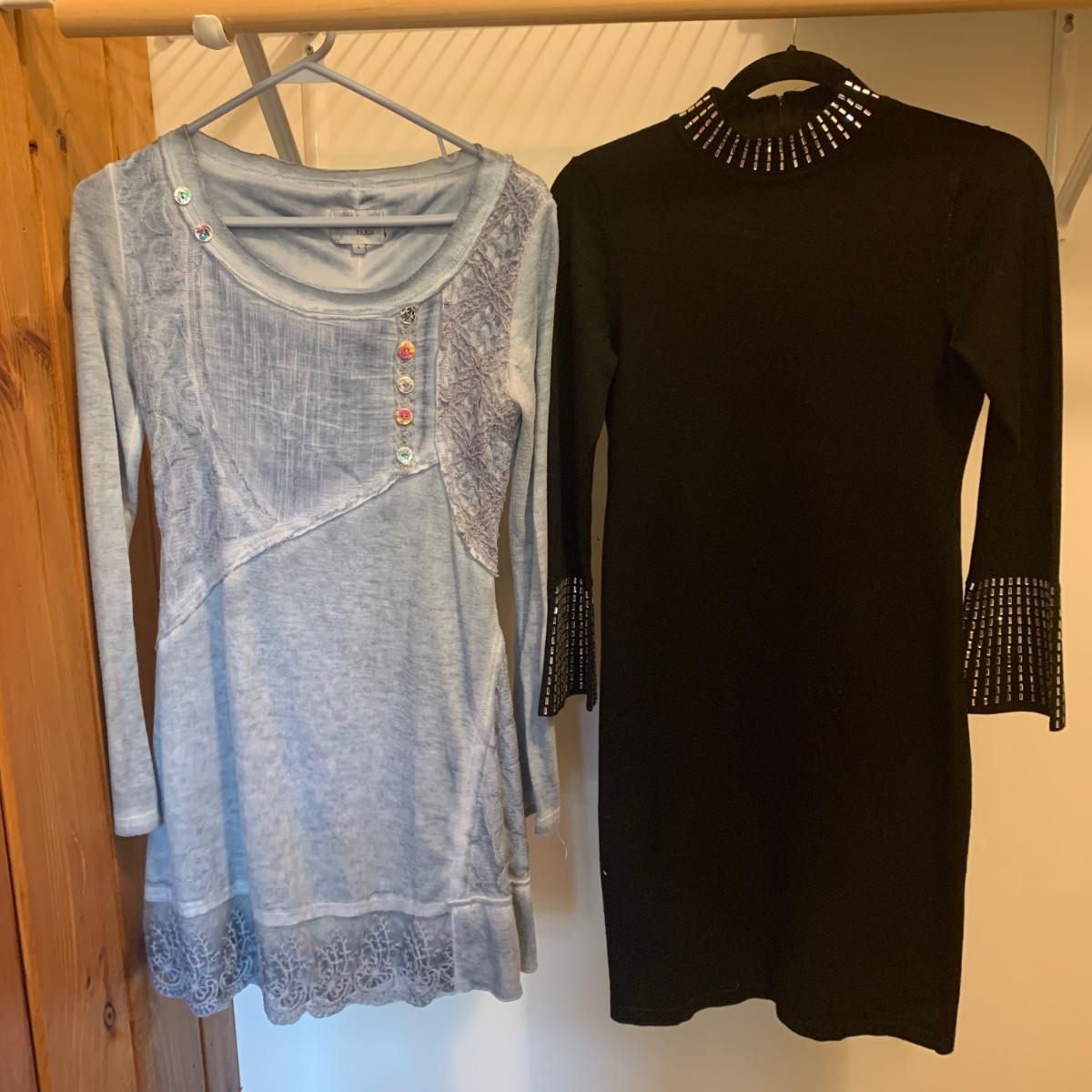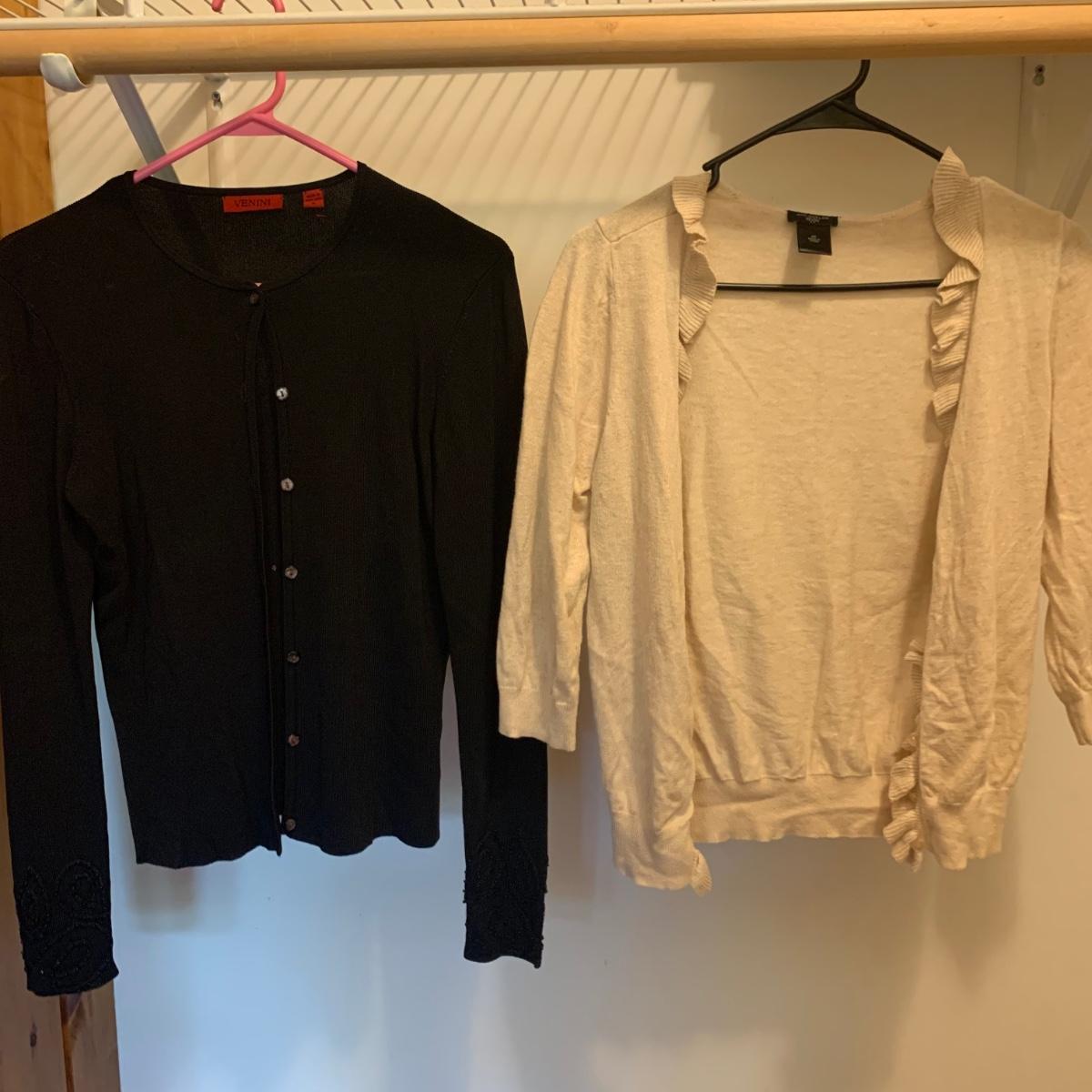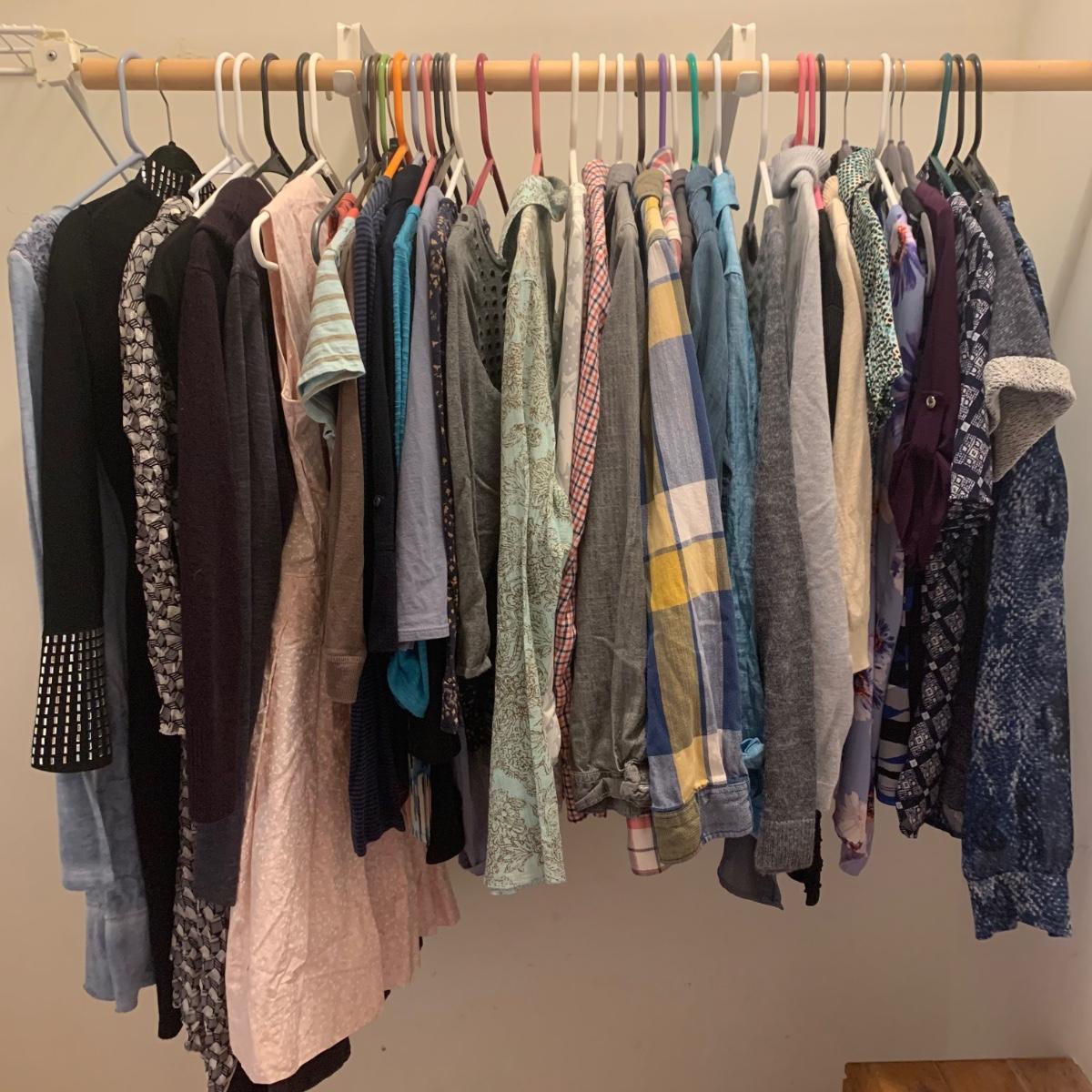 A collection of 30 ladies tops and cardigans, and seven dresses, mostly size small, although there are some items that are medium and large too. Please see photos for details and full inventory. Hangers not included.