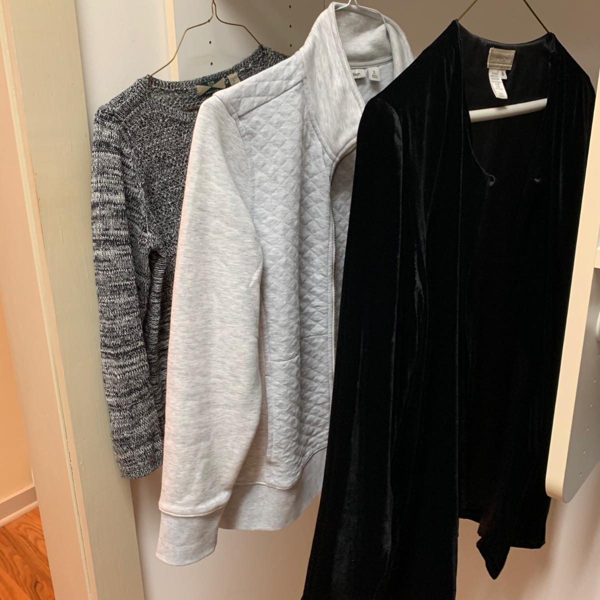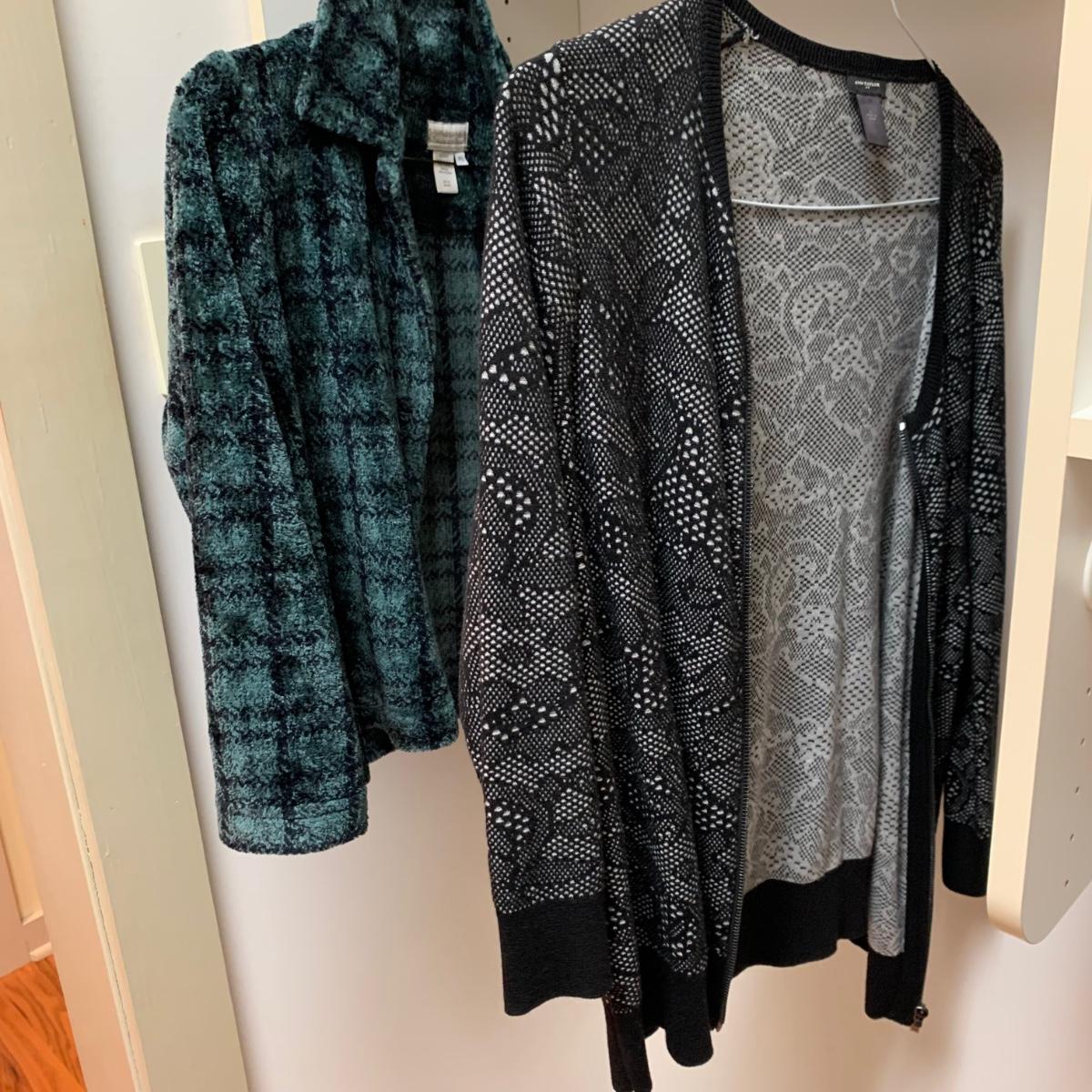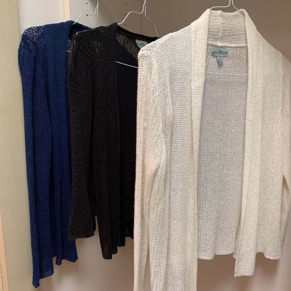 20 total items in this collection of size small to medium ladies cardigans, sweaters, and light jackets. Please see photos for inventory, brands, and sizes.